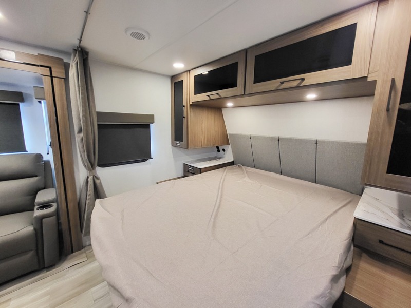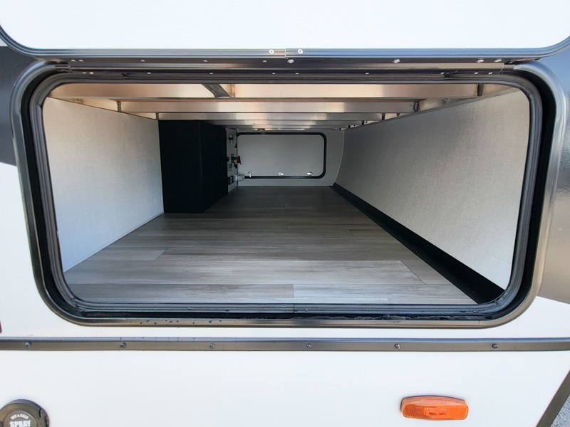 This travel trailer is perfect for three to four happy campers! You'll find a front bedroom with a queen-size bed, dual wardrobes and nightstands, plus a privacy curtain if you have someone staying over on the sofa. The booth dinette provides additional sleeping space when it's not being used to dine or play games at! A rear corner kitchen includes counter space to prep meals, a large sink, plus overhead storage for spices. After dinner, you can relax with a movie since there is a 40" swivel TV, or you can head outdoors to visit under the 19' patio awning!