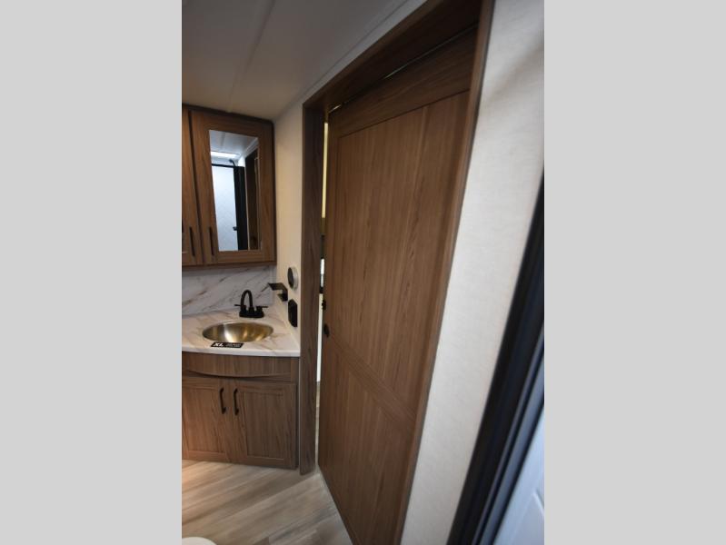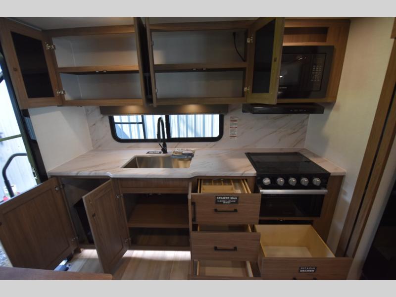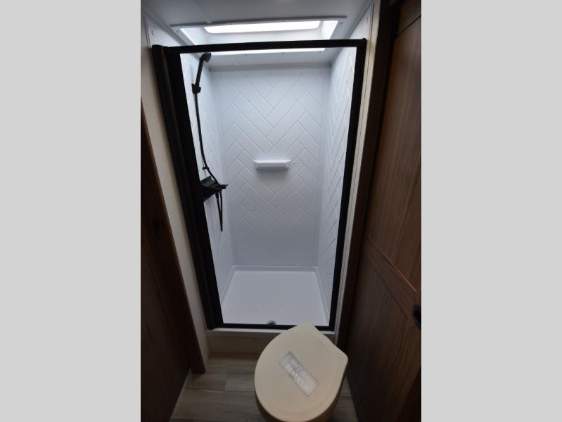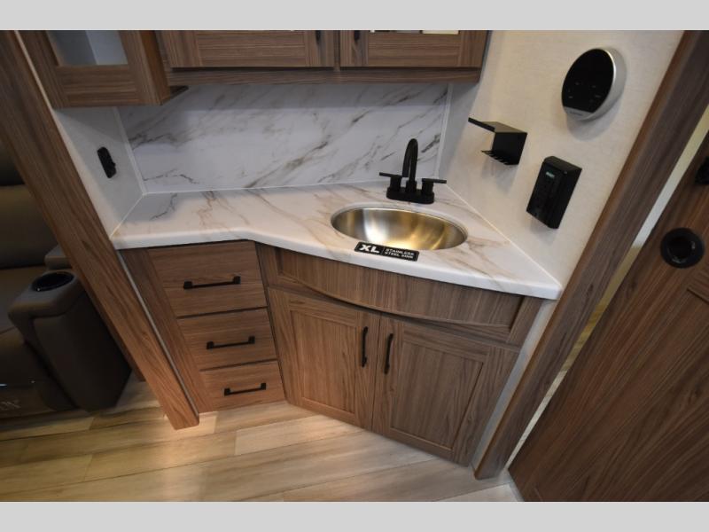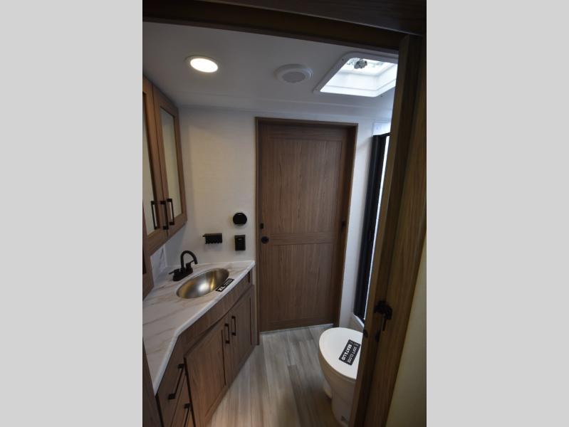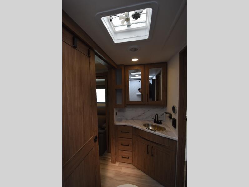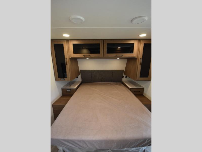 Inside, you’ll find a spacious rear kitchen with solid surface countertops, stainless steel appliances, a large farmhouse sink, and ample prep space – making meal prep easy and enjoyable while on the road. The living area features comfortable seating, panoramic windows for natural light, and entertainment options to keep you relaxed after a long day of exploring. The private bedroom includes a walk-around queen bed, generous wardrobe storage, and overhead cabinets, giving you a peaceful retreat at the end of the day. The bathroom is designed with convenience in mind, offering a roomy shower and modern fixtures.
