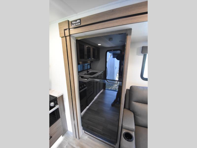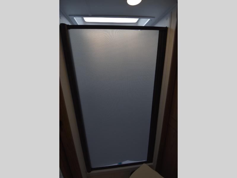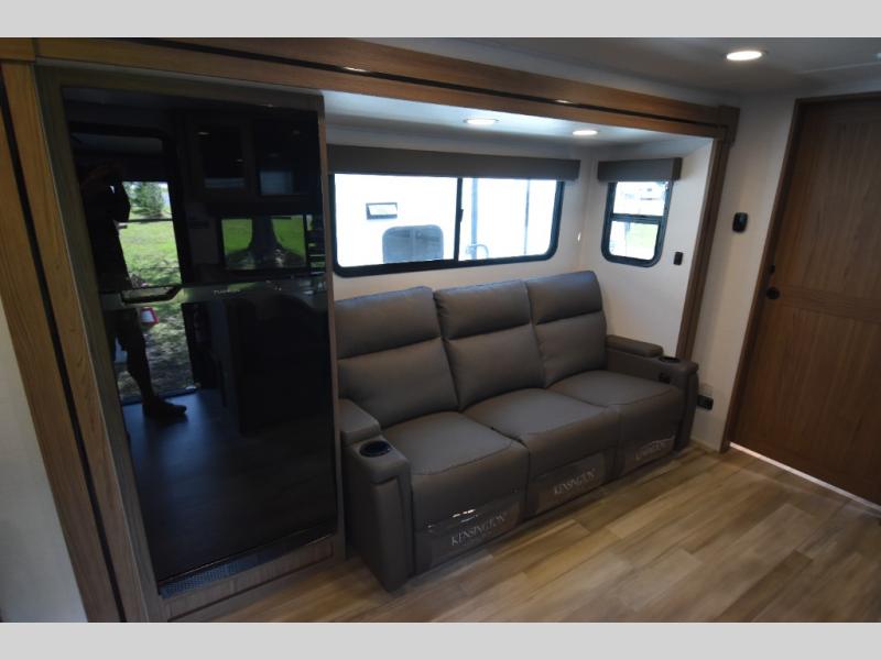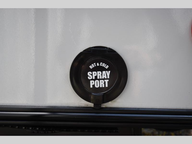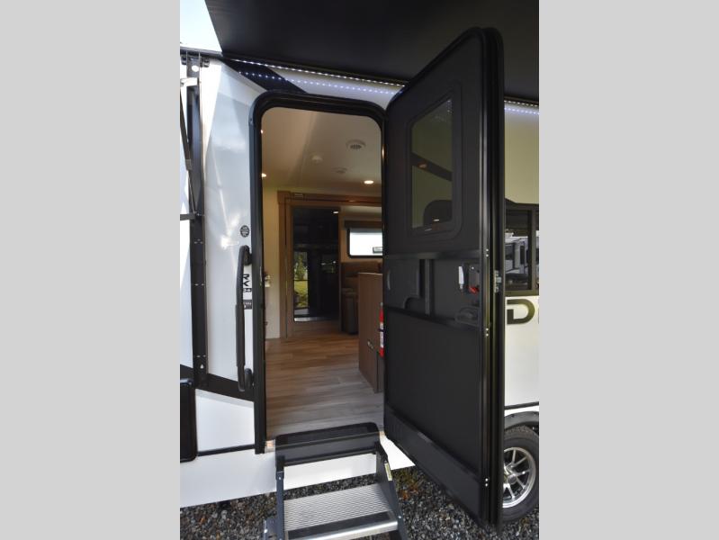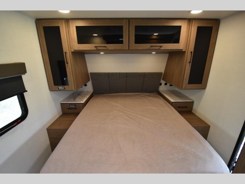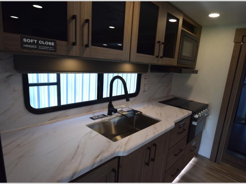 Inside, you’ll find a spacious rear kitchen with solid surface countertops, stainless steel appliances, a large farmhouse sink, and ample prep space – making meal prep easy and enjoyable while on the road. The living area features comfortable seating, panoramic windows for natural light, and entertainment options to keep you relaxed after a long day of exploring. The private bedroom includes a walk-around queen bed, generous wardrobe storage, and overhead cabinets, giving you a peaceful retreat at the end of the day. The bathroom is designed with convenience in mind, offering a roomy shower and modern fixtures.