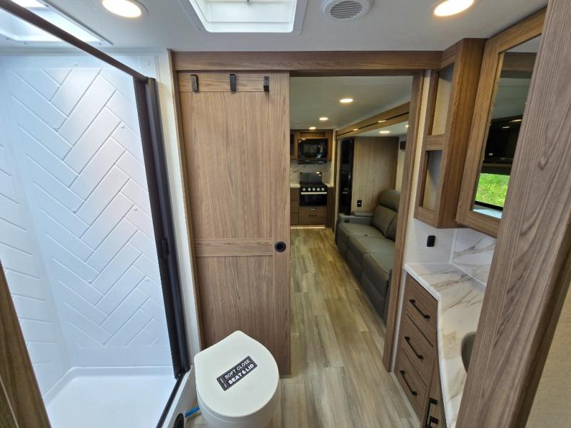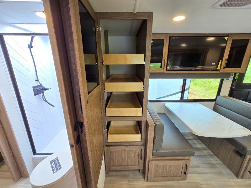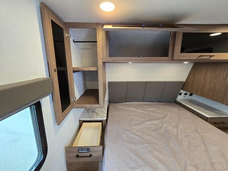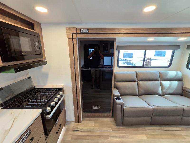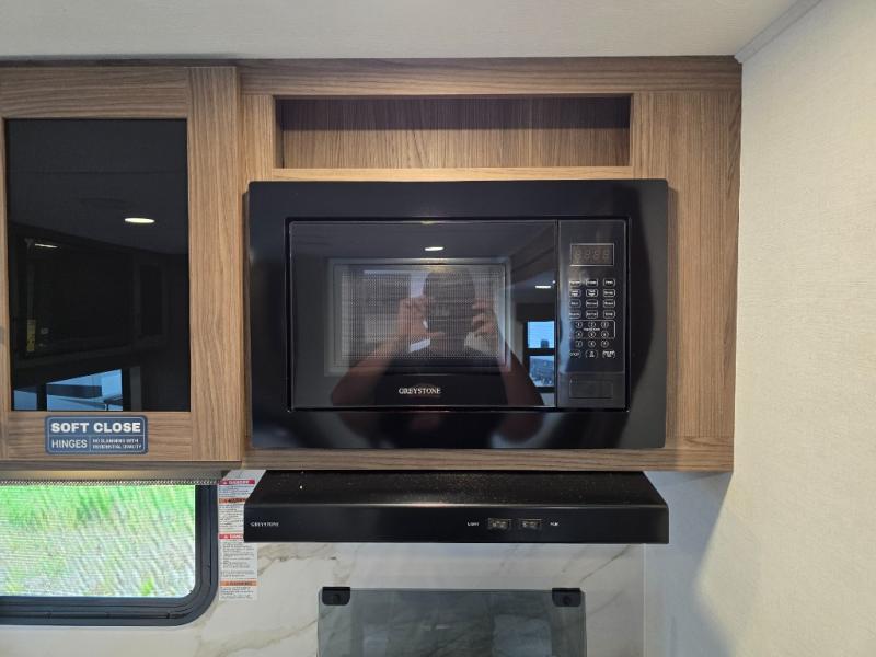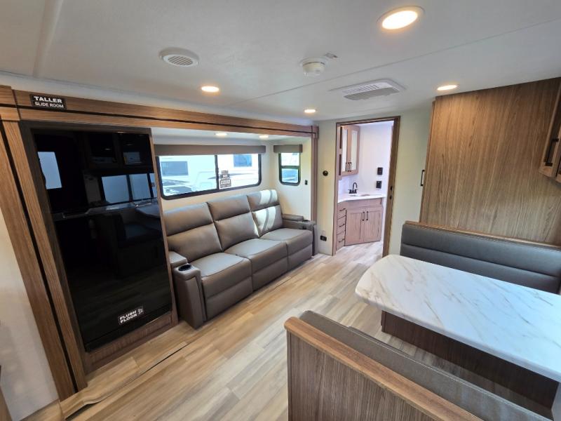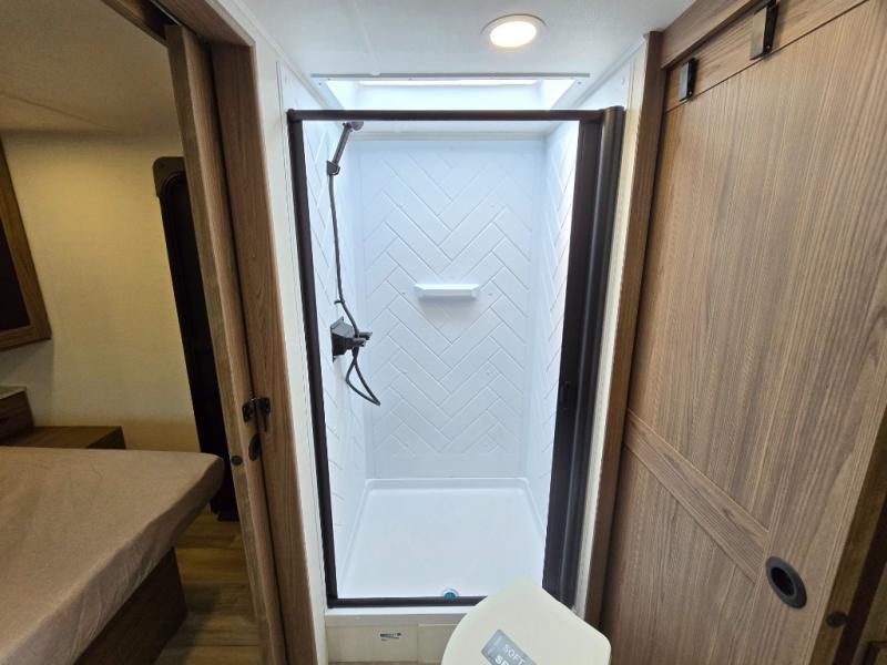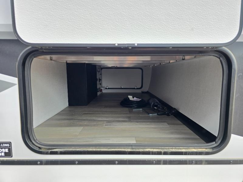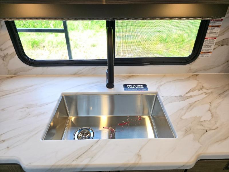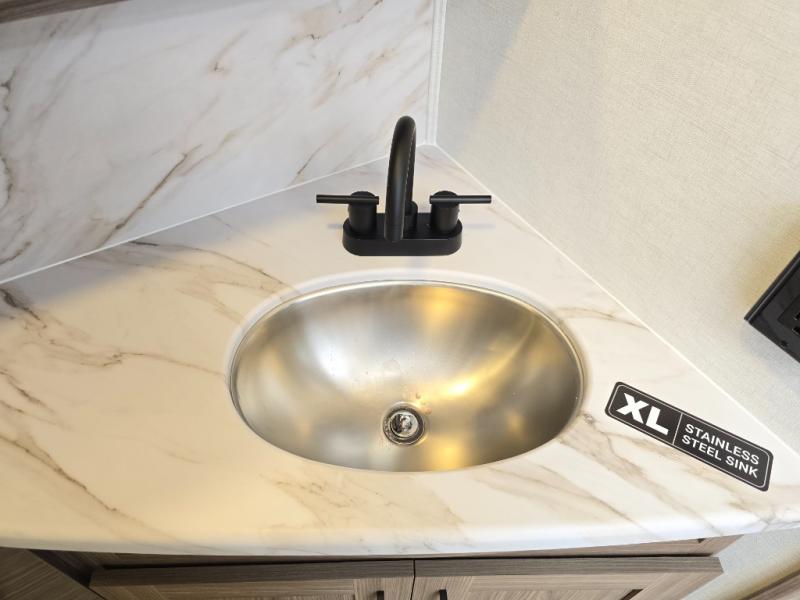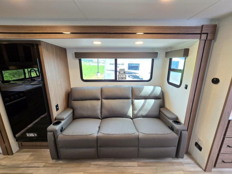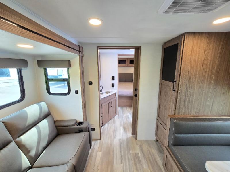 You'll love camping in this rear kitchen travel trailer with generous counter space and overhead storage for spices, dishes, and more. You can dine each day at the booth dinette or relax on the sofa slide out, which will provide more floor space. The spacious walk-thru bath includes a 30" x 36" shower, toilet, and vanity so you can clean up each day. Head to the front master bedroom where you can sleep soundly on the walk-around queen bed with dual nightstands and wardrobes. The second entry door is also found in this room so you can slip out for an early morning run!