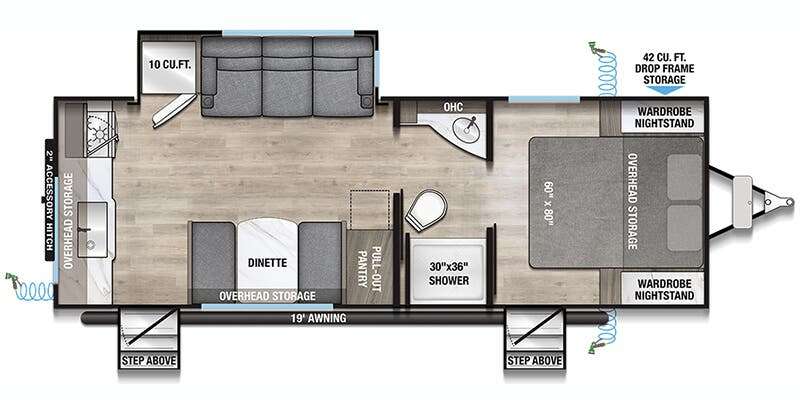 At just under 30 feet, the RK234 delivers a surprising sense of openness thanks to its rear kitchen layout, slide-out dinette, and large panoramic windows. The fully equipped kitchen features a residential microwave, high-rise faucet, and ample pantry storage, giving you everything you need to cook and dine comfortably wherever the road takes you.