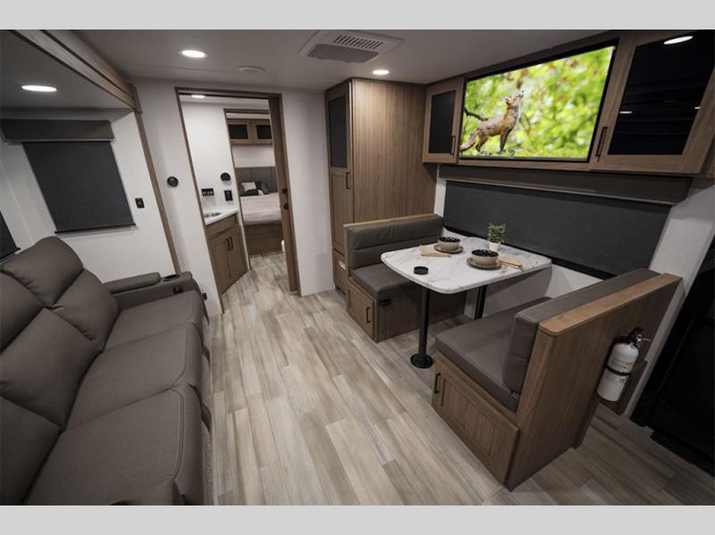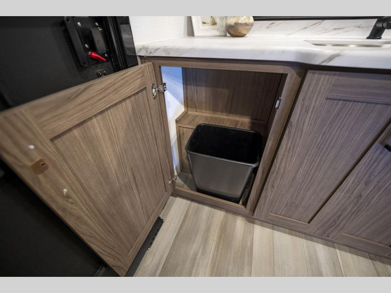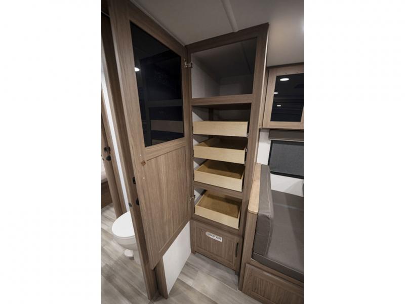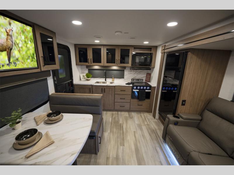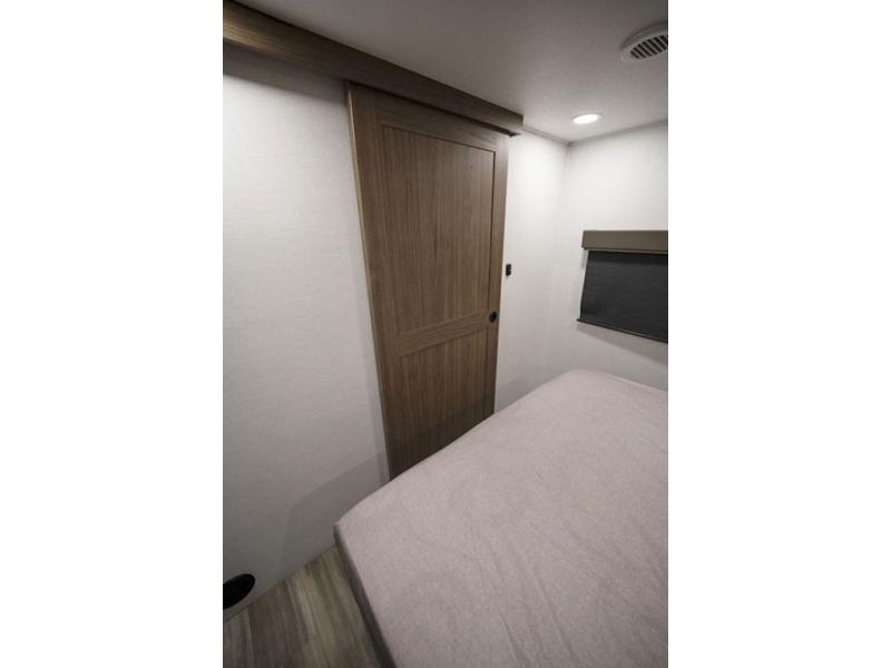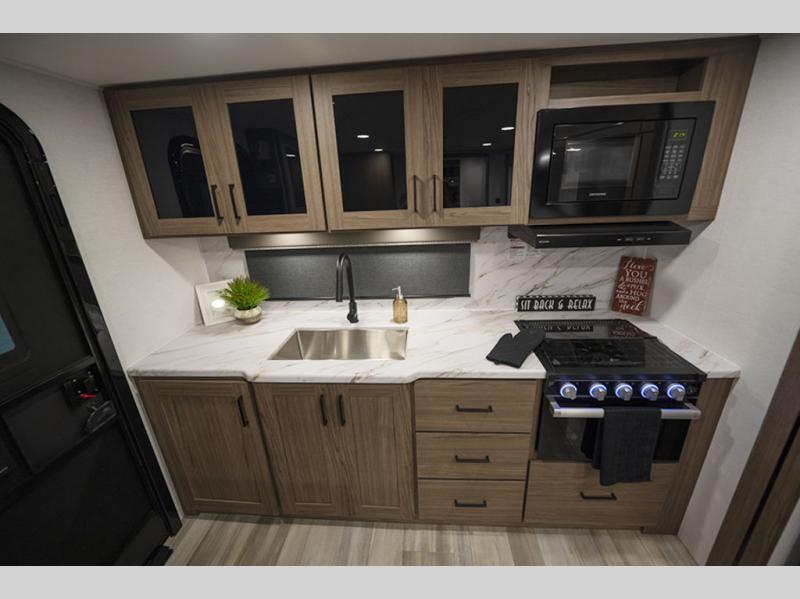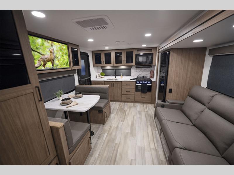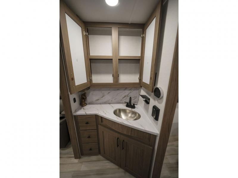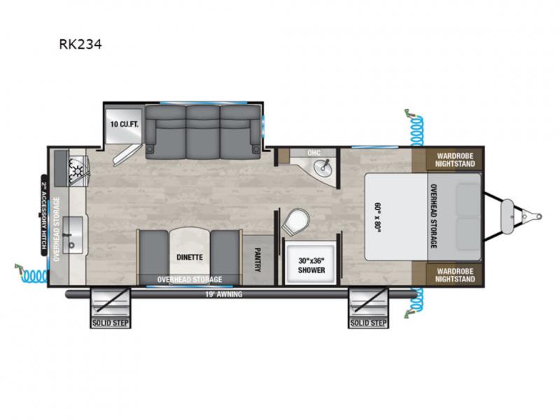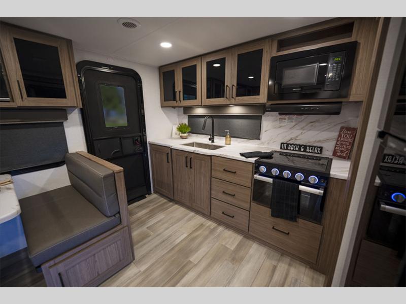 You'll love camping in this rear kitchen travel trailer with generous counter space and overhead storage for spices, dishes, and more. You can dine each day at the booth dinette or relax on the sofa slide out, which will provide more floor space. The spacious walk-thru bath includes a 30" x 36" shower, toilet, and vanity so you can clean up each day. Head to the front master bedroom where you can sleep soundly on the walk-around queen bed with dual nightstands and wardrobes. The second entry door is also found in this room so you can slip out for an early morning run!