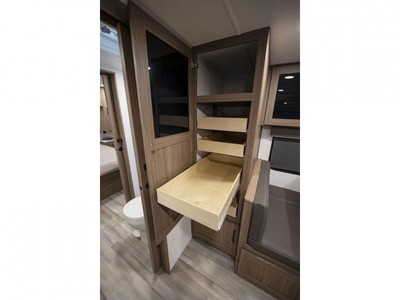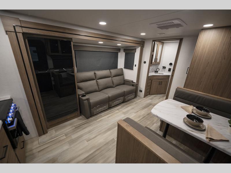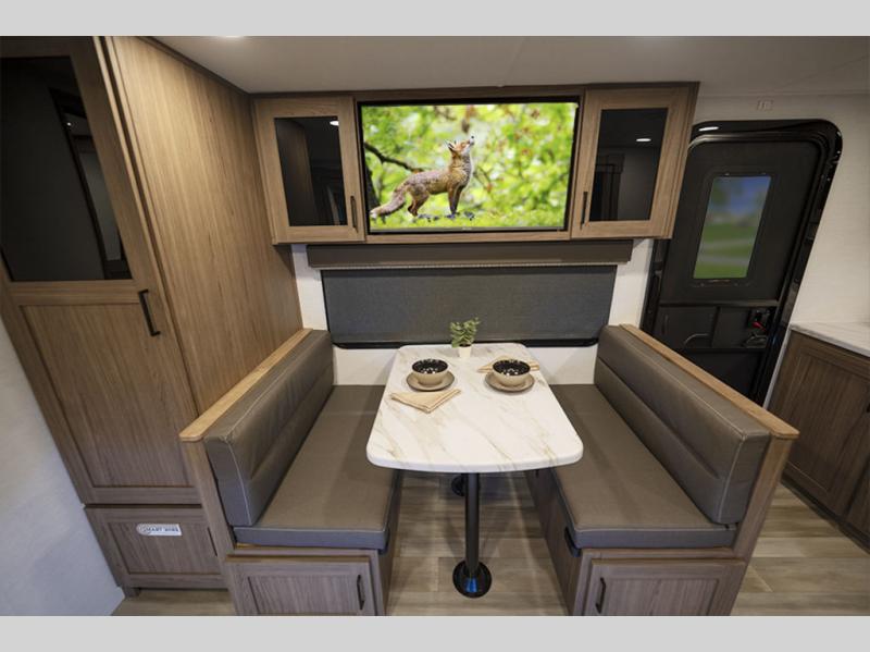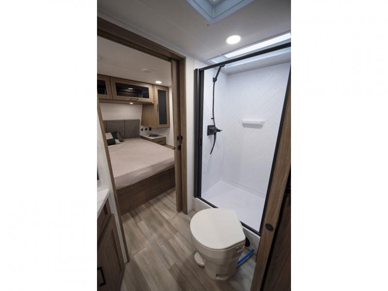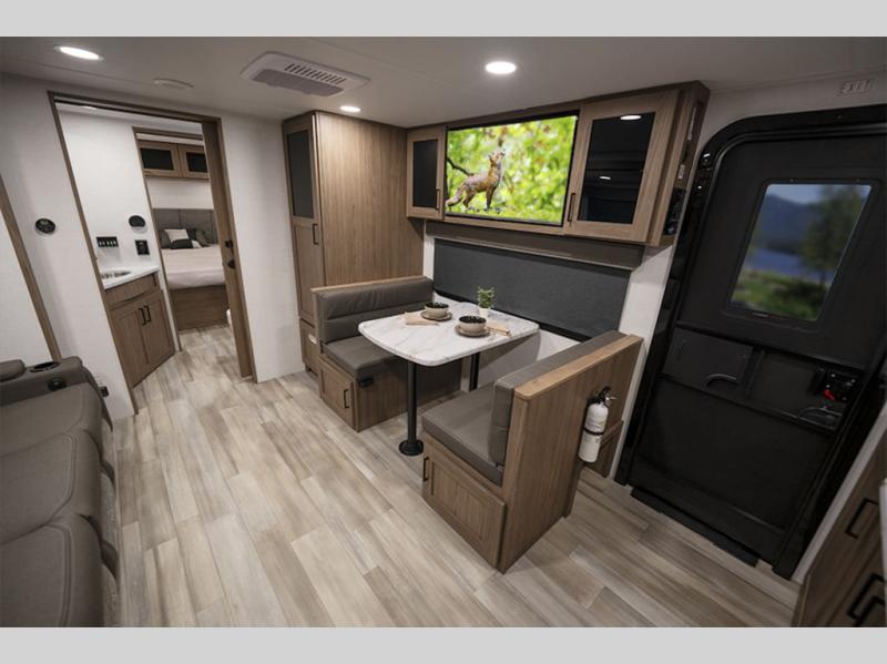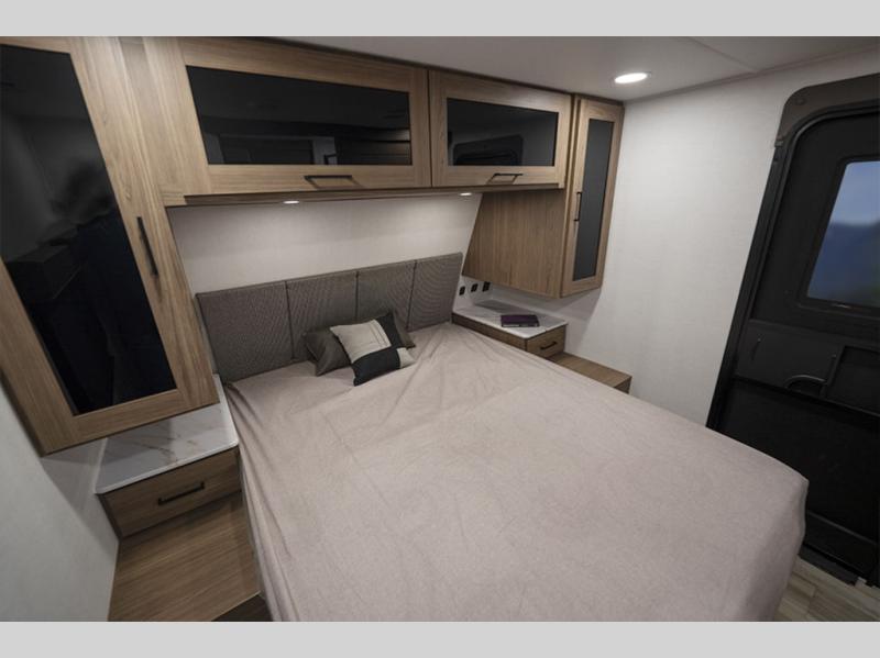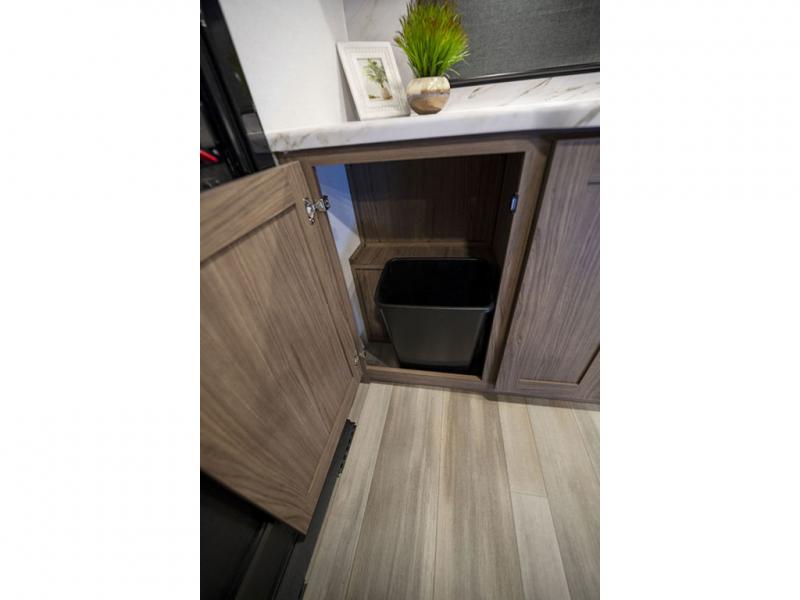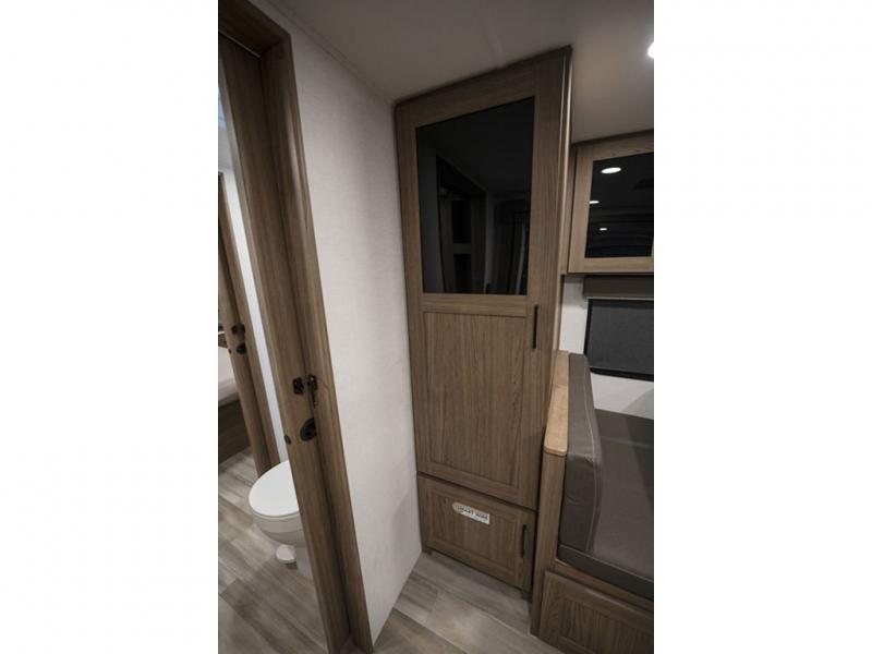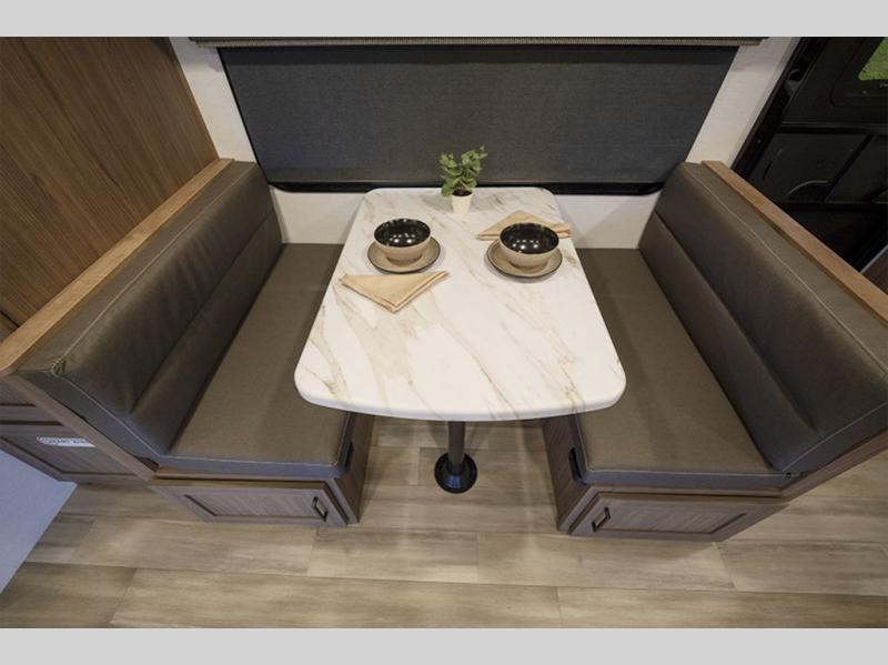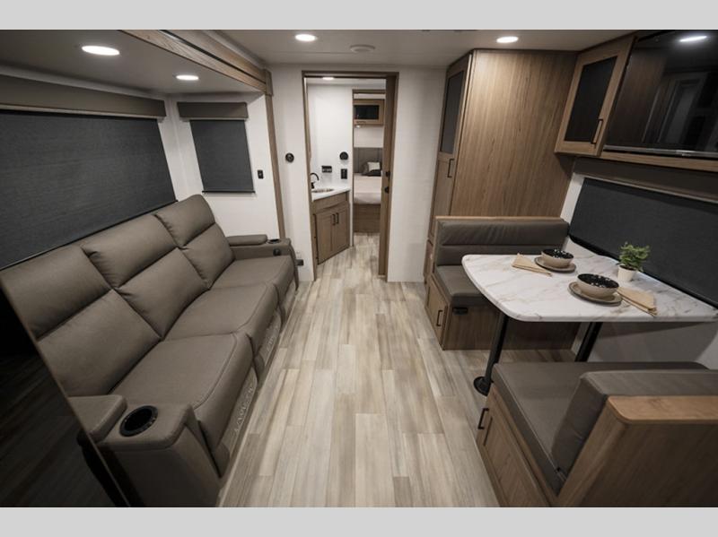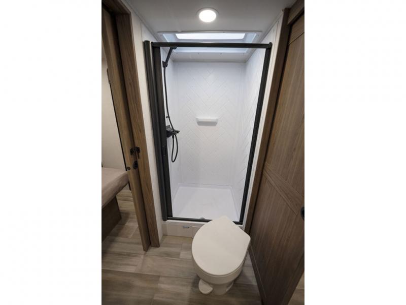 You'll love camping in this rear kitchen travel trailer with generous counter space and overhead storage for spices, dishes, and more. You can dine each day at the booth dinette or relax on the sofa slide out, which will provide more floor space. The spacious walk-thru bath includes a 30" x 36" shower, toilet, and vanity so you can clean up each day. Head to the front master bedroom where you can sleep soundly on the walk-around queen bed with dual nightstands and wardrobes. The second entry door is also found in this room so you can slip out for an early morning run!