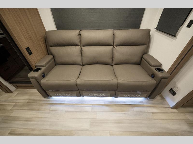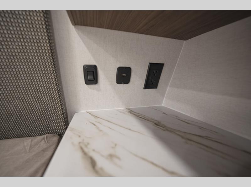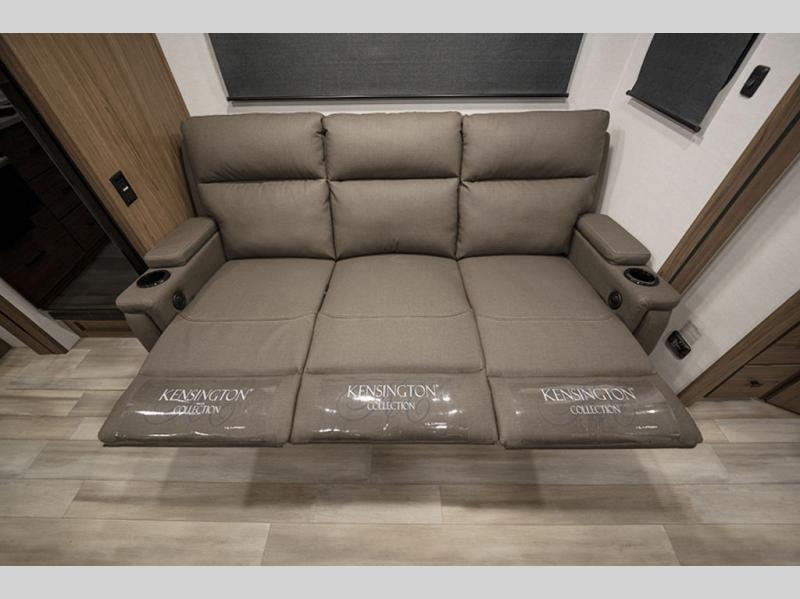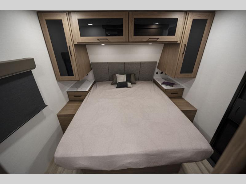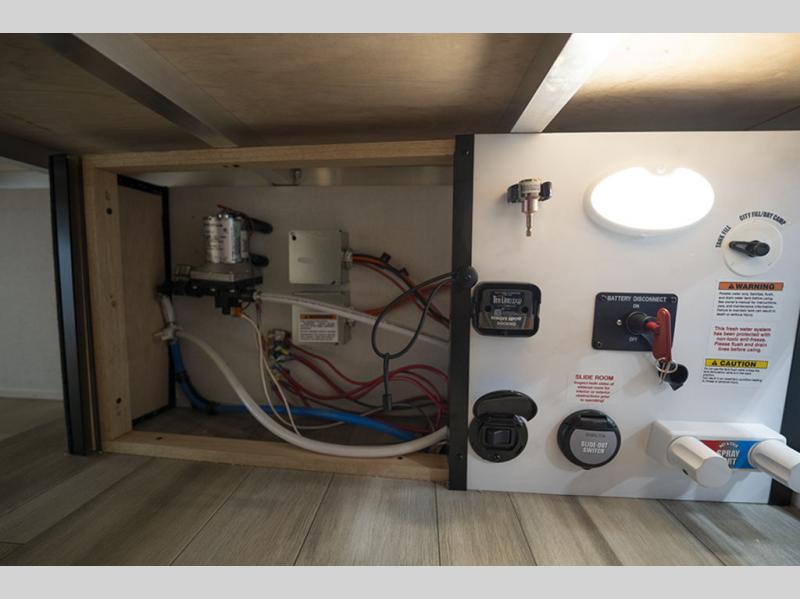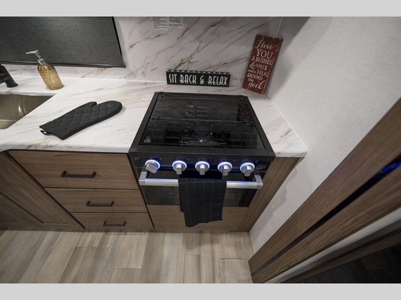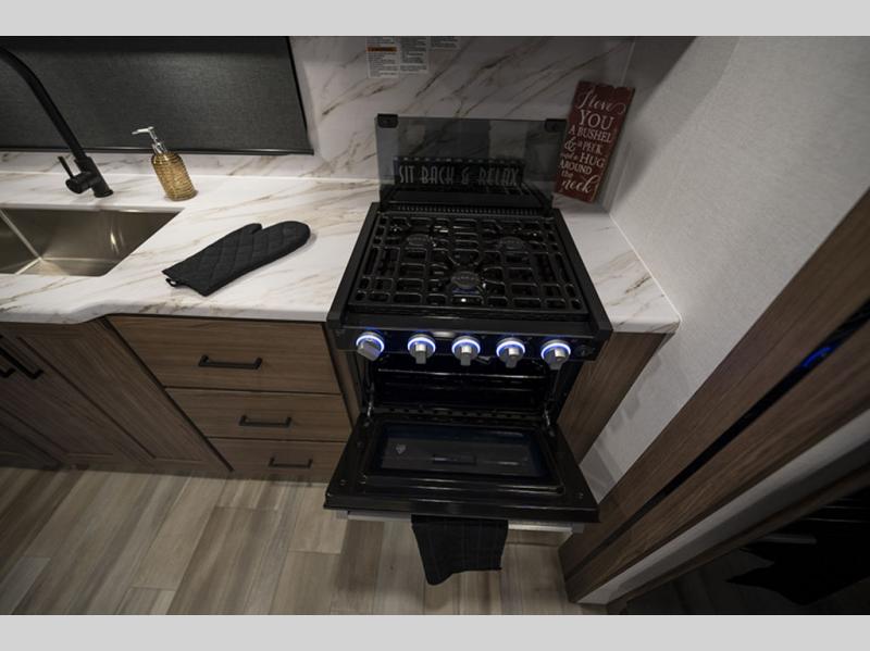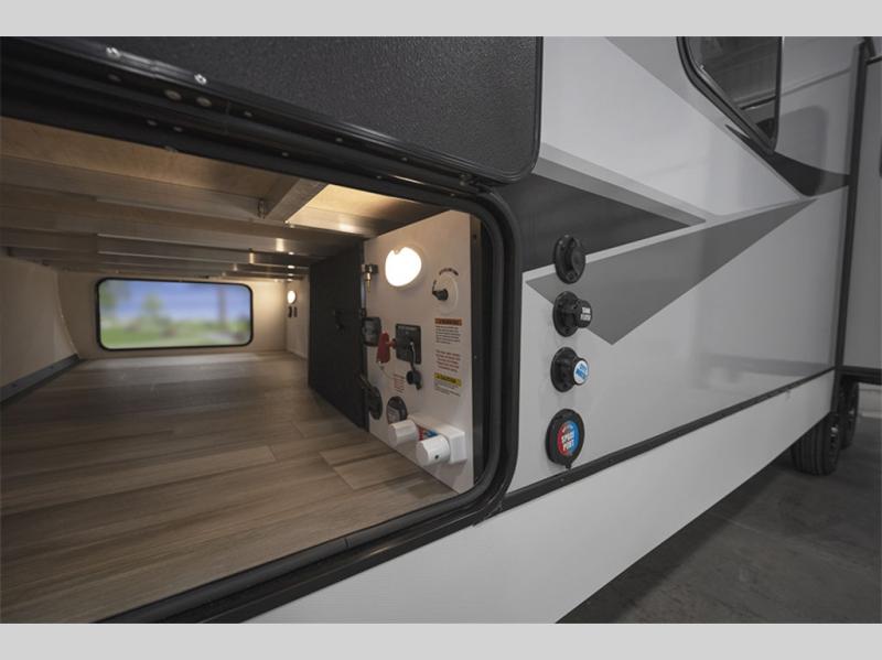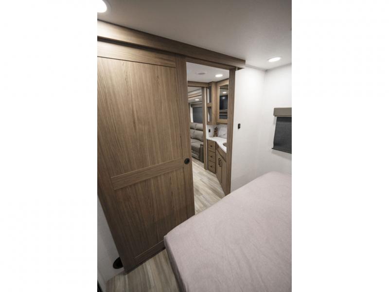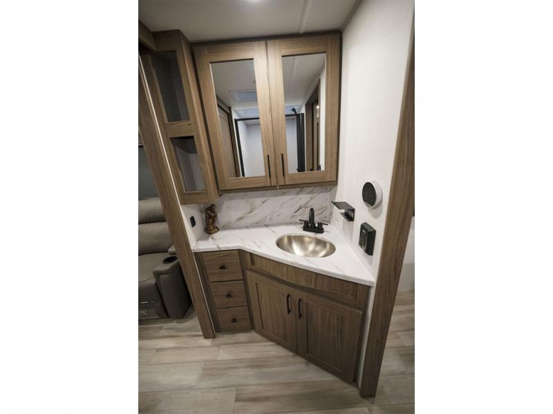 You'll love camping in this rear kitchen travel trailer with generous counter space and overhead storage for spices, dishes, and more. You can dine each day at the booth dinette or relax on the sofa slide out, which will provide more floor space. The spacious walk-thru bath includes a 30" x 36" shower, toilet, and vanity so you can clean up each day. Head to the front master bedroom where you can sleep soundly on the walk-around queen bed with dual nightstands and wardrobes. The second entry door is also found in this room so you can slip out for an early morning run!