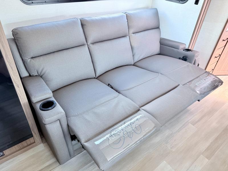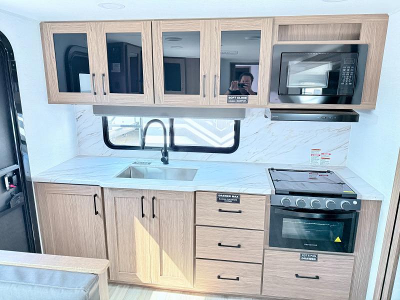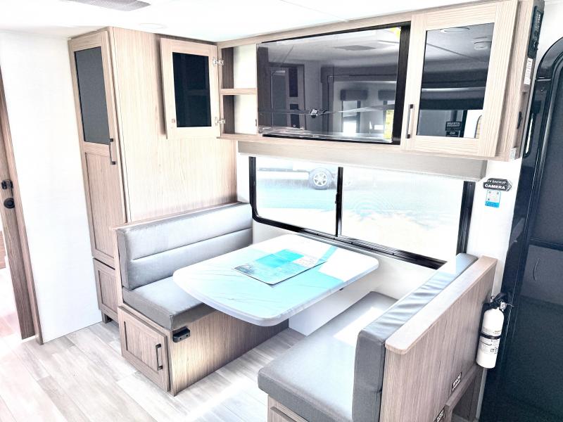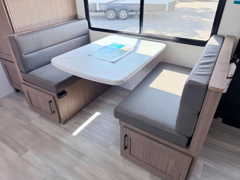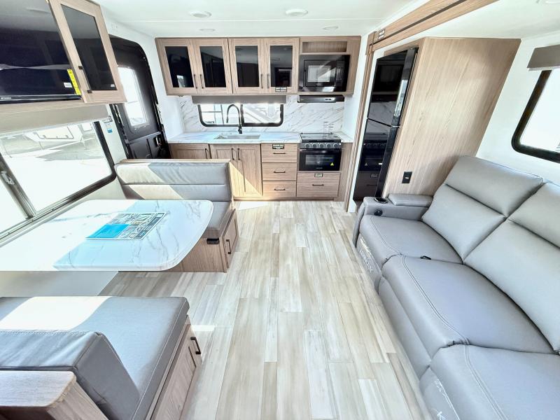 You'll love camping in this rear kitchen travel trailer with generous counter space and overhead storage for spices, dishes, and more. You can dine each day at the booth dinette or relax on the sofa slide out, which will provide more floor space. The spacious walk-thru bath includes a 30" x 36" shower, toilet, and vanity so you can clean up each day. Head to the front master bedroom where you can sleep soundly on the walk-around queen bed with dual nightstands and wardrobes. The second entry door is also found in this room so you can slip out for an early morning run!