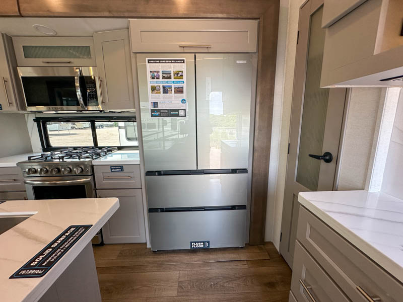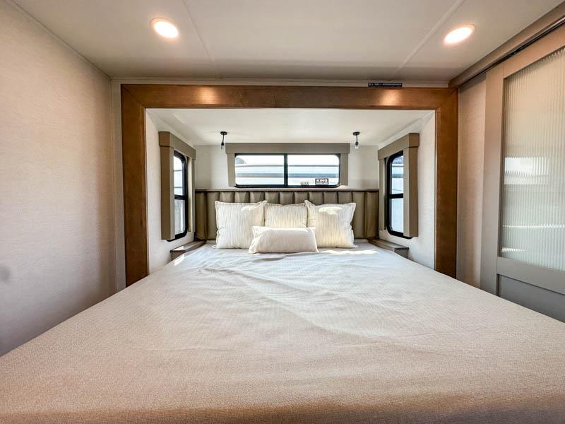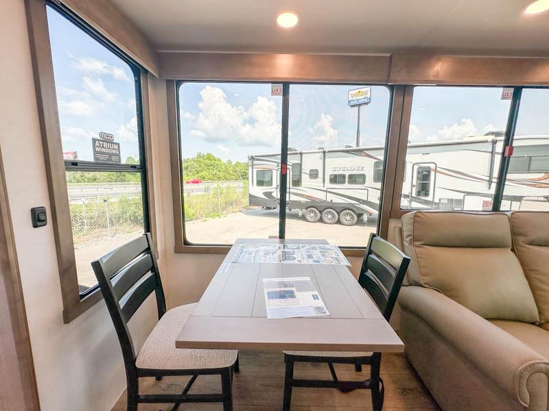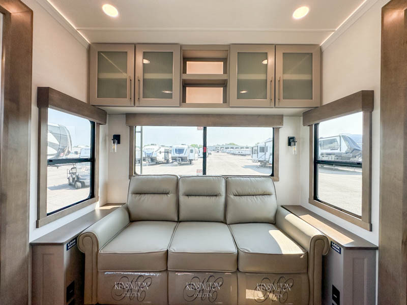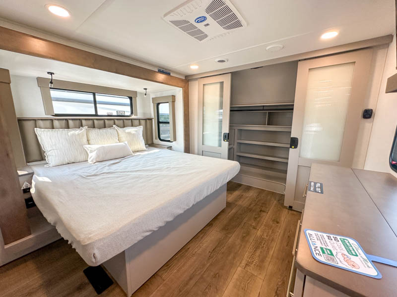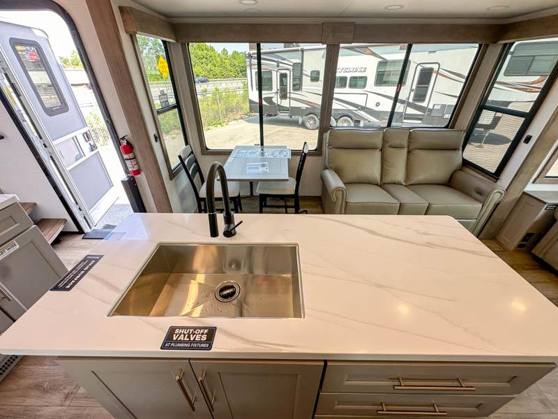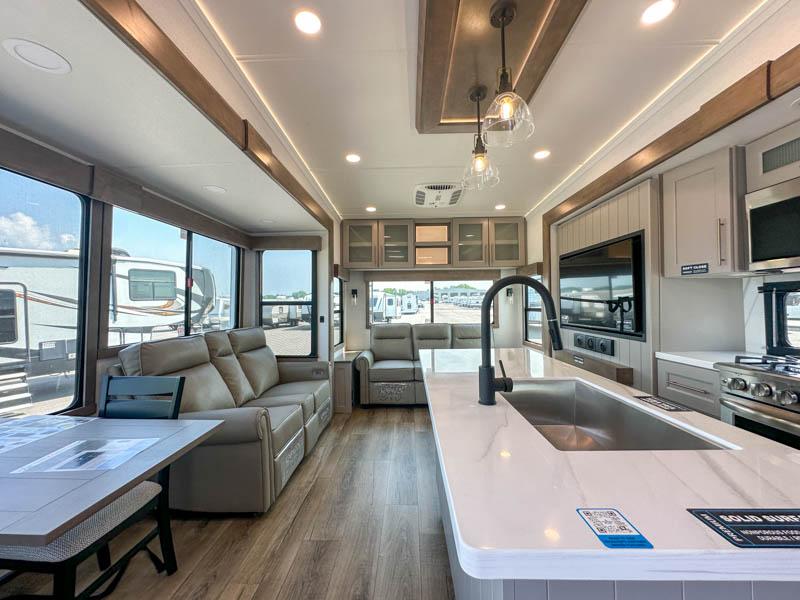 The Paradigm fifth wheels by Alliance RV are functional, high-quality, and luxurious for an unforgettable camping experience. There are three A/C units and a 40K BTU furnace to keep you comfortable year around, and you'll appreciate additional convenient amenities, like the all-in-one enclosed/heated utility center and the color coded and numbered wiring. A Rota-Flex pin box comes standard for hassle-free towing, along with Super-G 4,400 lb. rated tires and Dexter 7,000 lb. axles. You'll love the kitchen with its LG solid surface countertops and Insignia range, plus there is LED motion lighting in the pantry and a Maxx fan with a rain sensor to keep everything fresh when making dinner. Each model also includes an HD Smart TV in the living room and bedroom, plus a Winegard Air 360 antenna to keep you connected to the outside world. And of course there are a variety of options you can choose from to further customize your fifth wheel; dual pane windows, Super Solar Plus, slide out awning toppers, and generator prep or a generator to name a few!