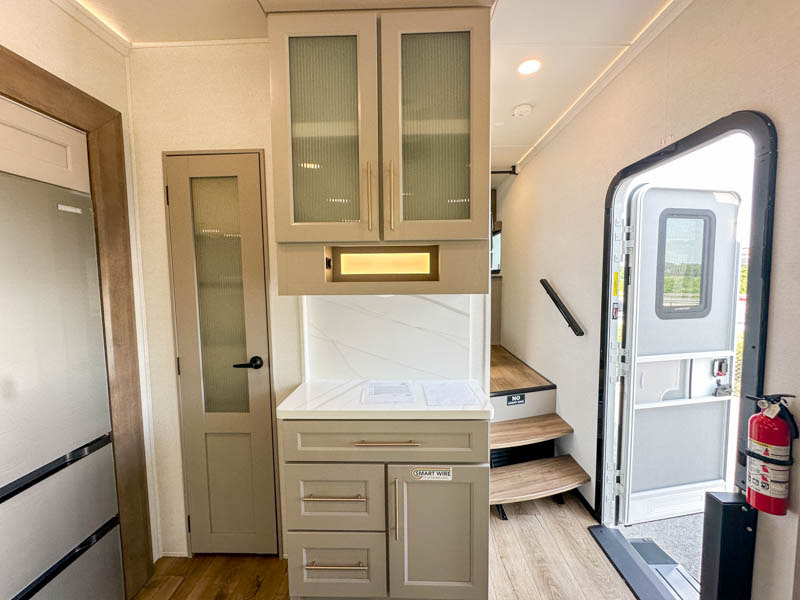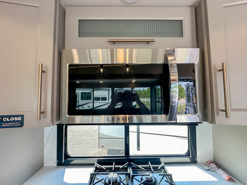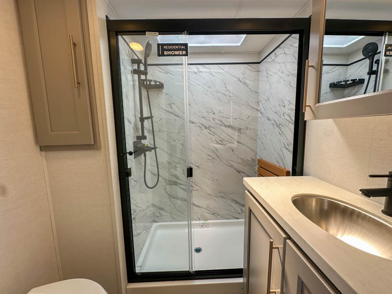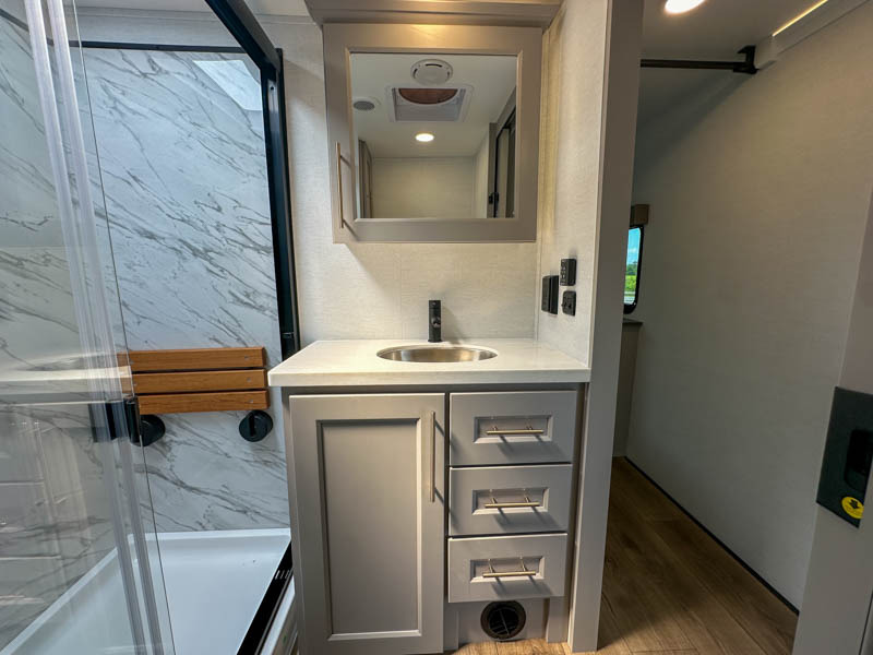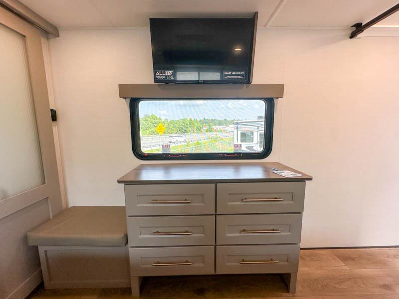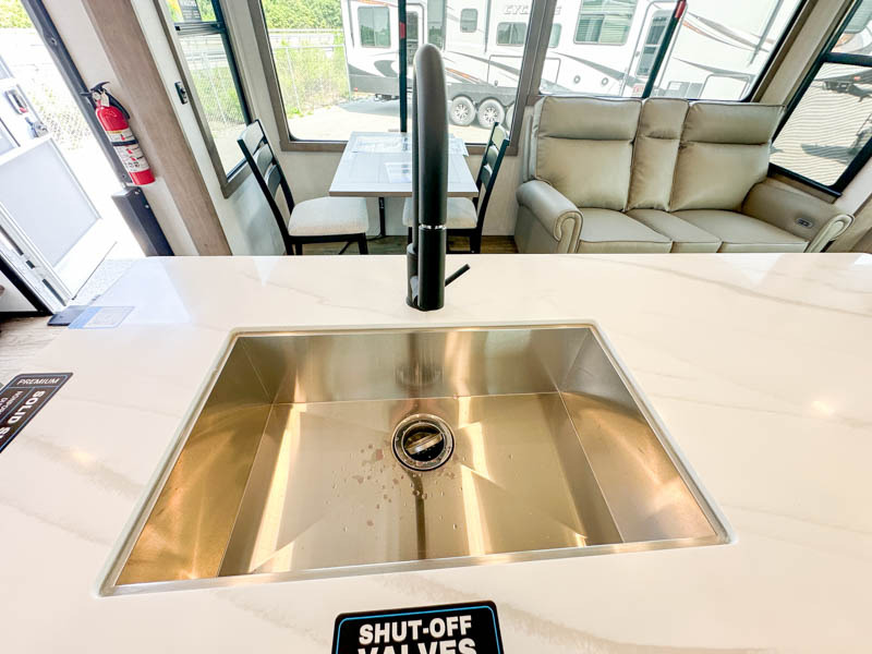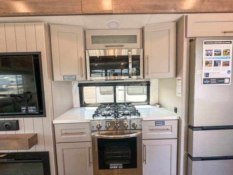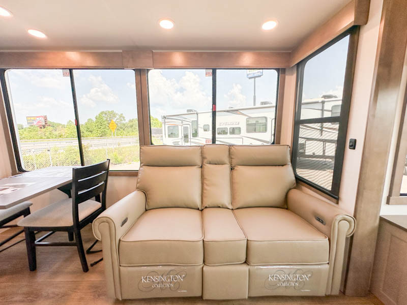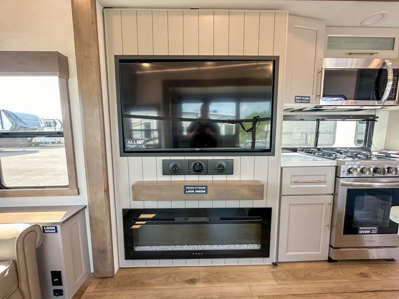 Search for the best views, the nicest RV park, or a place you haven't seen for years with this Paradigm in tow! There is a king bed slide in the master bedroom, a Smart TV, and a dresser with flip-up hidden storage for your belongings. The full bathroom offers a large residential shower, a porcelain toilet with a soft close seat, and storage for your linens, while the kitchen gives you two pantries, an island with a large undermount single basin sink and dishwasher prep if you want the option for easy clean up. You will also have a residential microwave and range, plus a 3.73 cu. ft. oven to make meals. When you're ready to relax for the evening, head to the rear living area to enjoy the dual recliner love seat across from the 50" Smart TV and fireplace!