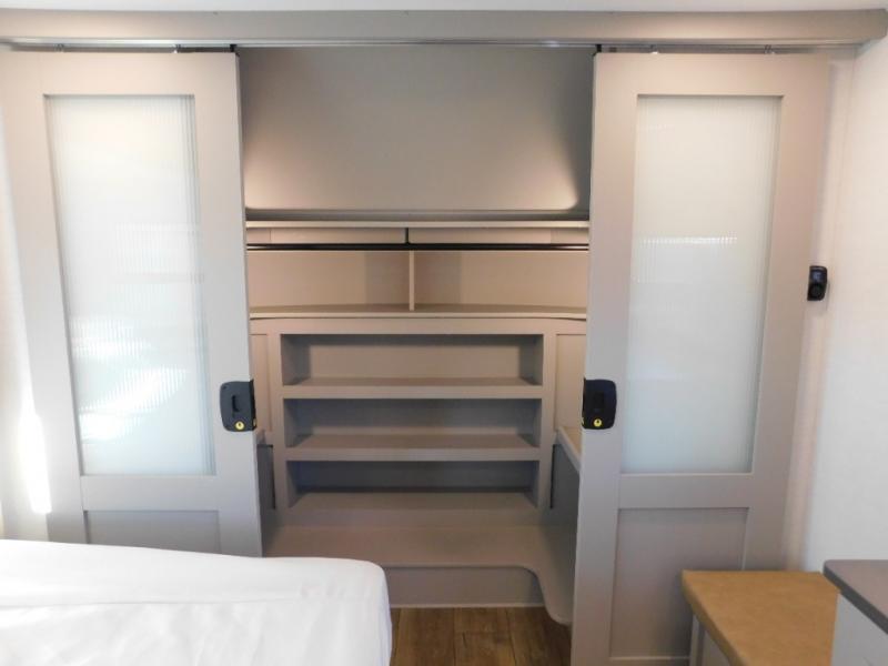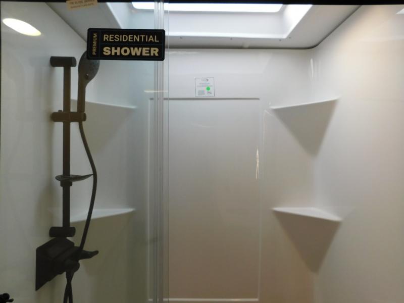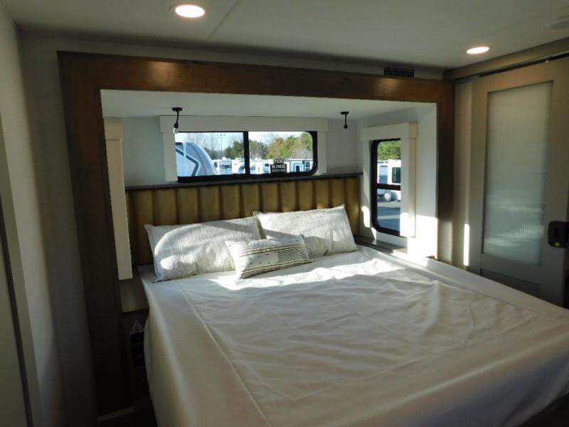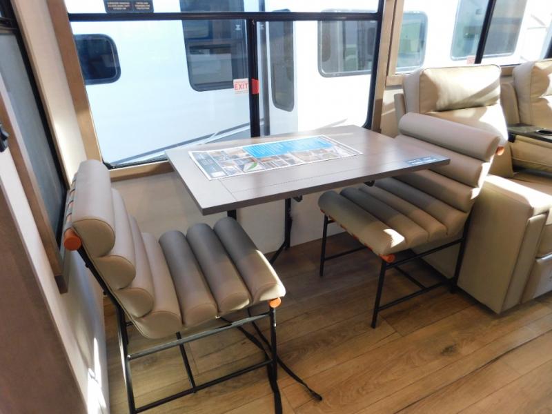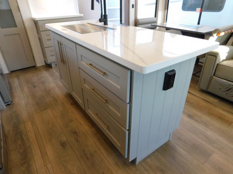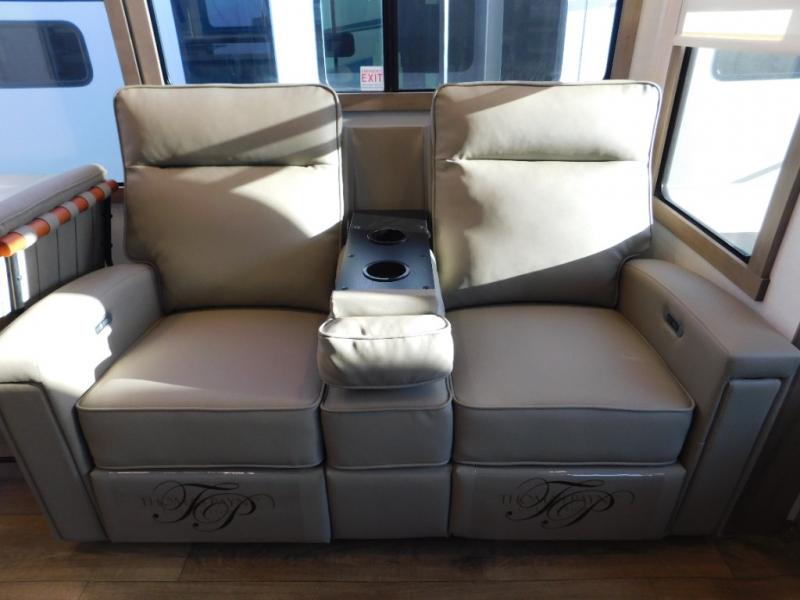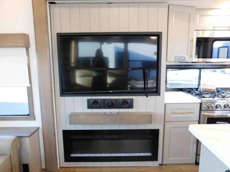 Search for the best views, the nicest RV park, or a place you haven't seen for years with this Paradigm in tow! There is a king bed slide in the master bedroom, a Smart TV, and a dresser with flip-up hidden storage for your belongings. The full bathroom offers a large residential shower, a porcelain toilet with a soft close seat, and storage for your linens, while the kitchen gives you two pantries, an island with a large undermount single basin sink and dishwasher prep if you want the option for easy clean up. You will also have a residential microwave and range, plus a 3.73 cu. ft. oven to make meals. When you're ready to relax for the evening, head to the rear living area to enjoy the dual recliner love seat across from the 50" Smart TV and fireplace!