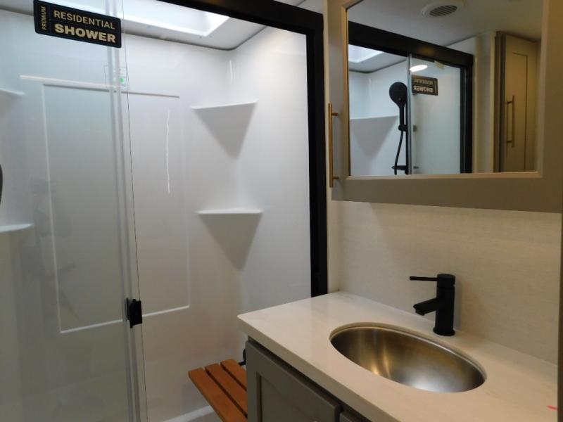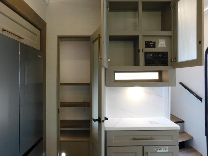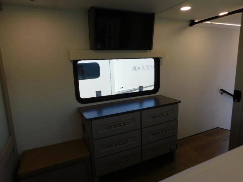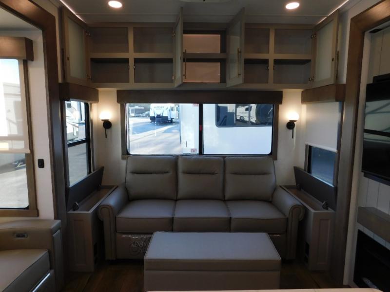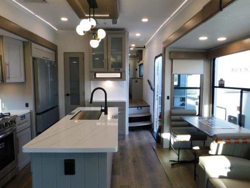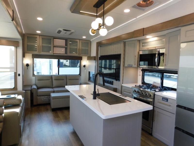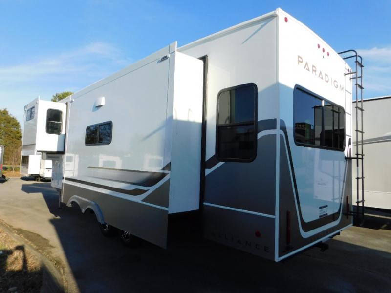 The Paradigm fifth wheels by Alliance RV are functional, high-quality, and luxurious for an unforgettable camping experience. There are three A/C units and a 40K BTU furnace to keep you comfortable year around, and you'll appreciate additional convenient amenities, like the all-in-one enclosed/heated utility center and the color coded and numbered wiring. A Rota-Flex pin box comes standard for hassle-free towing, along with Super-G 4,400 lb. rated tires and Dexter 7,000 lb. axles. You'll love the kitchen with its LG solid surface countertops and Lusso range, plus there is LED motion lighting in the pantry and a Maxx fan with a rain sensor to keep everything fresh when making dinner. Each model also includes an HD Smart TV in the living room and bedroom, plus a Winegard Air 360 antenna to keep you connected to the outside world. And of course there are a variety of options you can choose from to further customize your fifth wheel; dual pane windows, Super Solar Plus, slide out awning toppers, and generator prep or a generator to name a few!