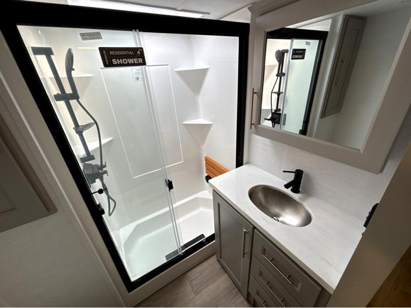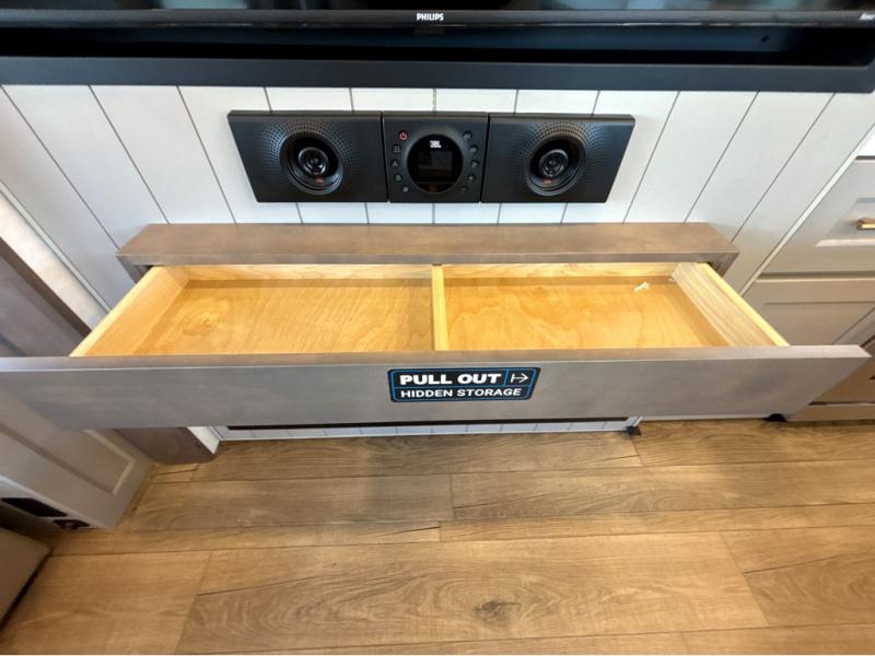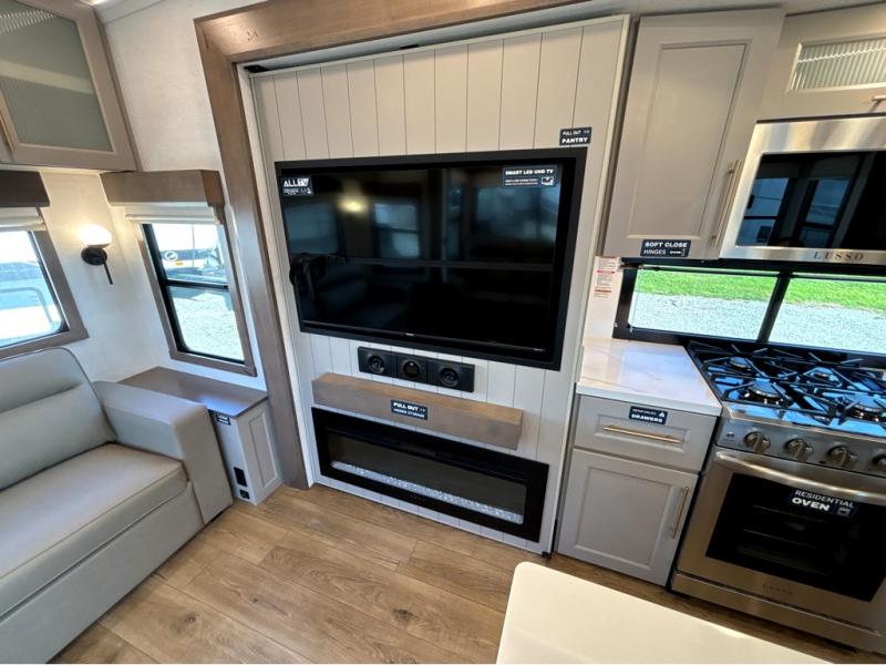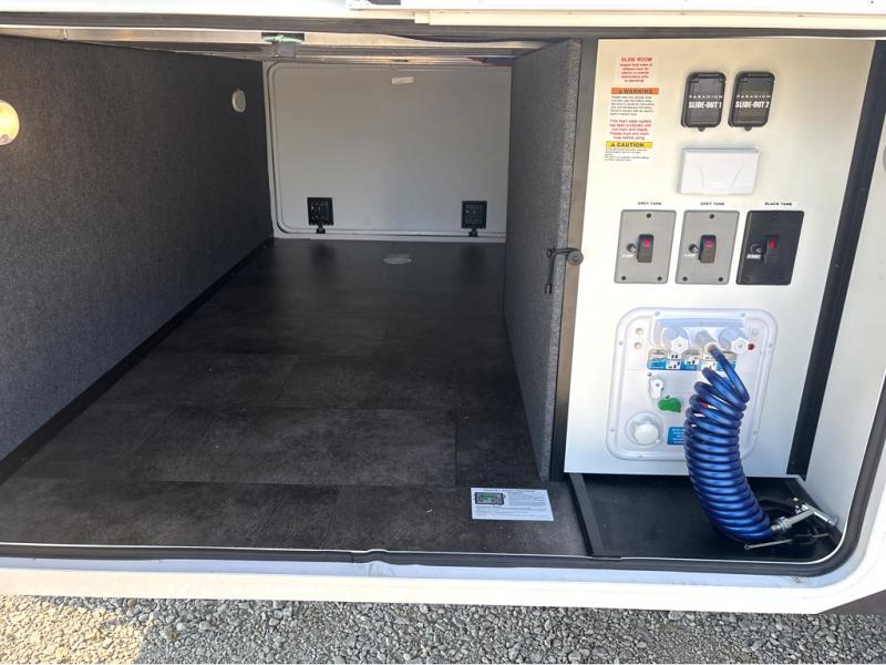 Search for the best views, the nicest RV park, or a place you haven't seen for years with this Paradigm in tow! There is a king bed slide in the master bedroom, a Smart TV, and a dresser with flip-up hidden storage for your belongings. The full bathroom offers a large residential shower, a porcelain toilet with a soft close seat, and storage for your linens, while the kitchen gives you two pantries, an island with a large undermount single basin sink and dishwasher prep if you want the option for easy clean up. You will also have a residential microwave and range, plus a 3.73 cu. ft. oven to make meals. When you're ready to relax for the evening, head to the rear living area to enjoy the dual recliner love seat across from the 50" Smart TV and fireplace!