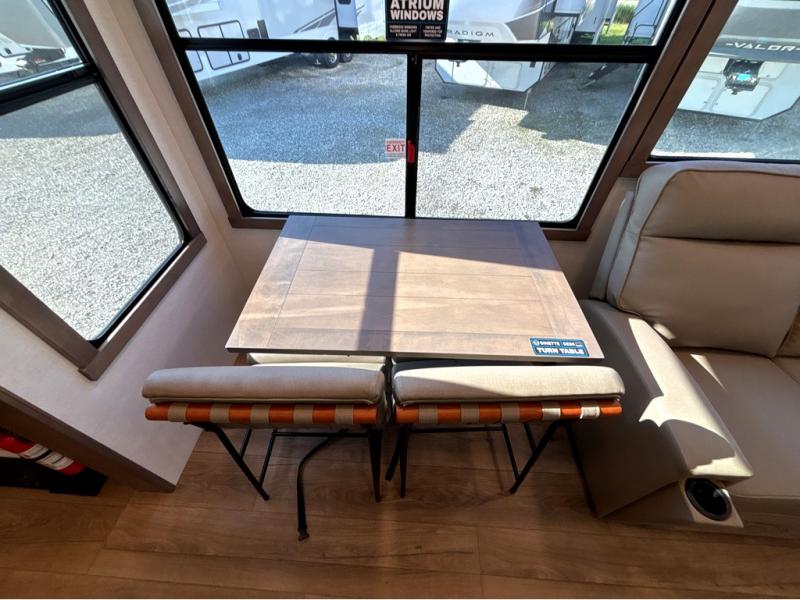 The Paradigm fifth wheels by Alliance RV are functional, high-quality, and luxurious for an unforgettable camping experience. There are three A/C units and a 40K BTU furnace to keep you comfortable year around, and you'll appreciate additional convenient amenities, like the all-in-one enclosed/heated utility center and the color coded and numbered wiring. A Rota-Flex pin box comes standard for hassle-free towing, along with Super-G 4,400 lb. rated tires and Dexter 7,000 lb. axles. You'll love the kitchen with its LG solid surface countertops and Lusso range, plus there is LED motion lighting in the pantry and a Maxx fan with a rain sensor to keep everything fresh when making dinner. Each model also includes an HD Smart TV in the living room and bedroom, plus a Winegard Air 360 antenna to keep you connected to the outside world. And of course there are a variety of options you can choose from to further customize your fifth wheel; dual pane windows, Super Solar Plus, slide out awning toppers, and generator prep or a generator to name a few!