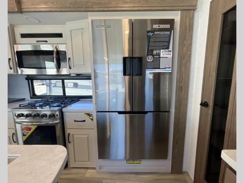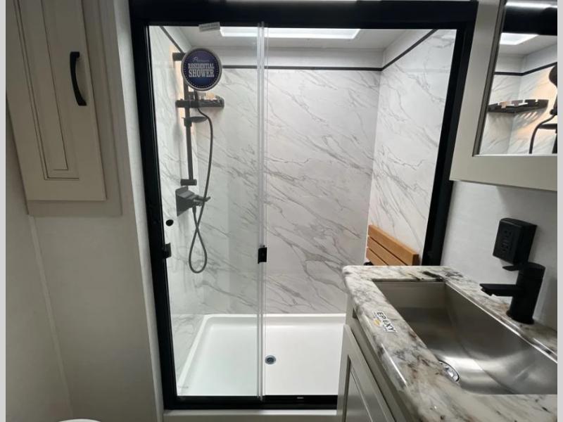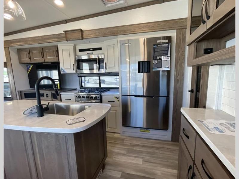 The Paradigm fifth wheels by Alliance RV are functional, high-quality, and luxurious for an unforgettable camping experience. There are three A/C units and a 40K BTU furnace to keep you comfortable year around, and you'll appreciate additional convenient amenities, like the all-in-one enclosed/heated utility center and the color coded and numbered wiring. A Helux Series coil spring pin box comes standard for hassle-free towing, along with Super-G 4,400 lb. rated tires and Dexter 7,000 lb. axles. You'll love the kitchen with its LG solid surface countertops and Lusso range, plus there is LED motion lighting in the pantry and a Maxx fan with a rain sensor to keep everything fresh when making dinner. Each model also includes an HD Smart TV in the living room and bedroom, plus a Winegard Air 360 antenna to keep you connected to the outside world. And of course there are a variety of options you can choose from to further customize your fifth wheel; dual pane windows, Super Solar Plus, slide out awning toppers, and generator prep or a generator to name a few!