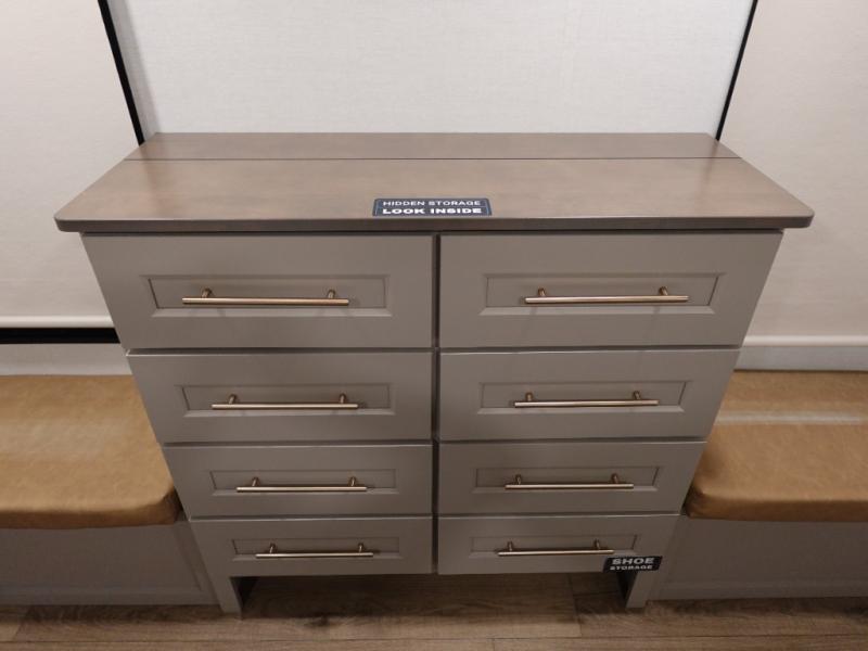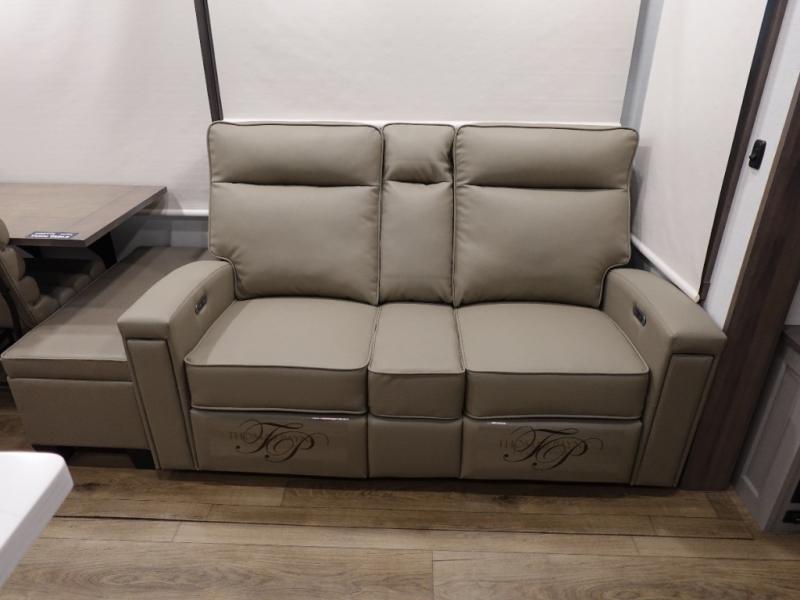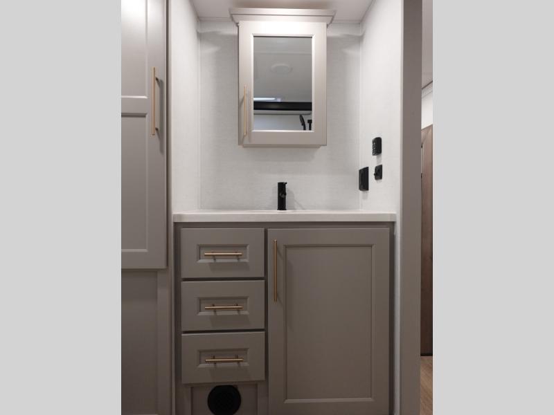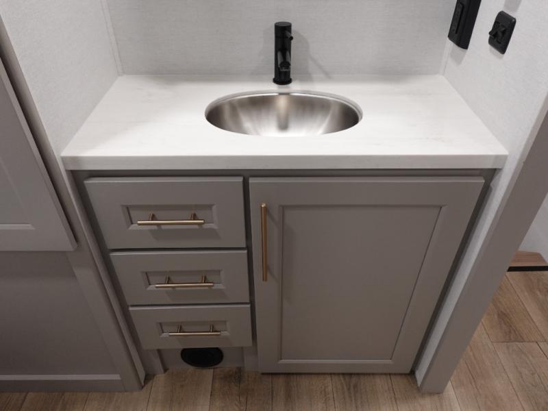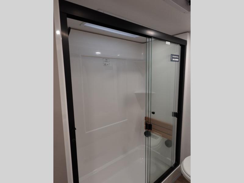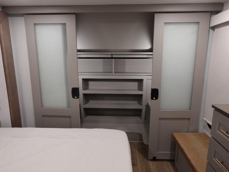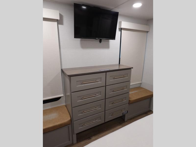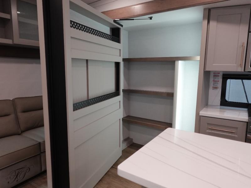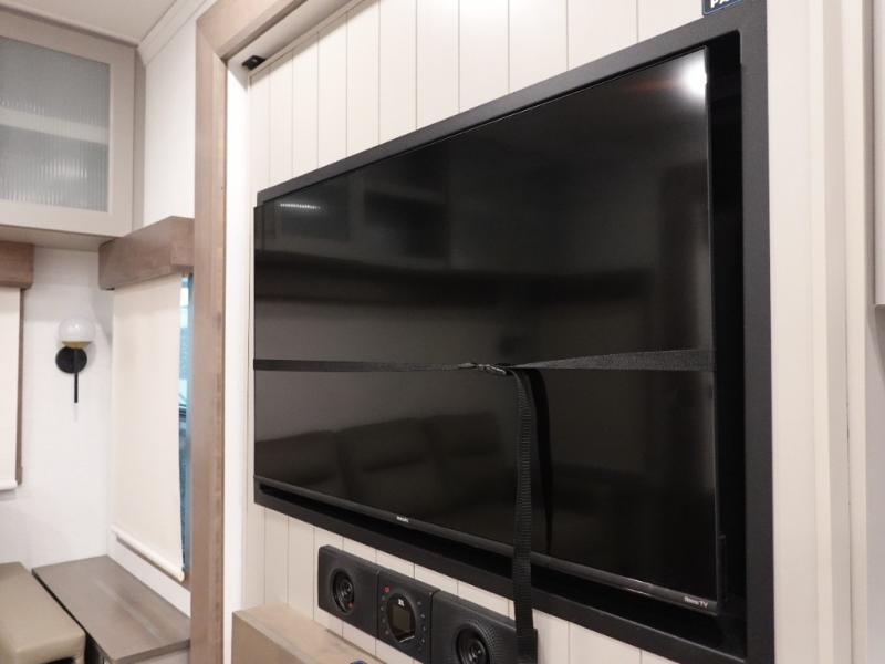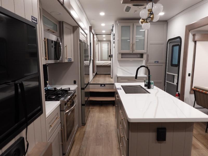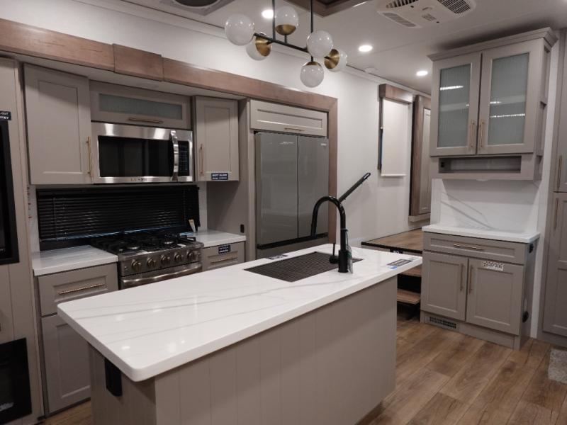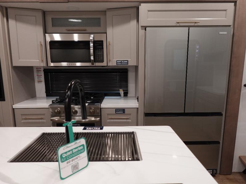 The Paradigm fifth wheels by Alliance RV are functional, high-quality, and luxurious for an unforgettable camping experience. There are three A/C units and a 40K BTU furnace to keep you comfortable year around, and you'll appreciate additional convenient amenities, like the all-in-one enclosed/heated utility center and the color coded and numbered wiring. A Rota-Flex pin box comes standard for hassle-free towing, along with Super-G 4,400 lb. rated tires and Dexter 7,000 lb. axles. You'll love the kitchen with its LG solid surface countertops and Lusso range, plus there is LED motion lighting in the pantry and a Maxx fan with a rain sensor to keep everything fresh when making dinner. Each model also includes an HD Smart TV in the living room and bedroom, plus a Winegard Air 360 antenna to keep you connected to the outside world.