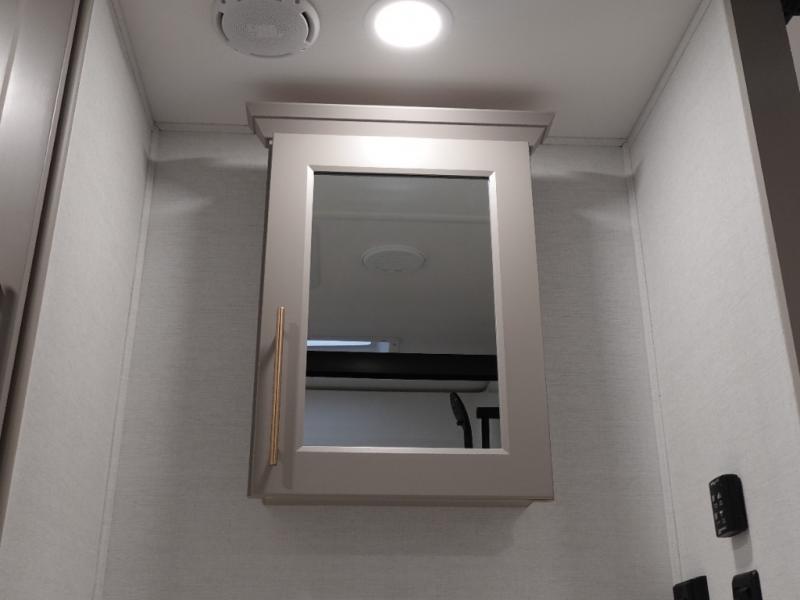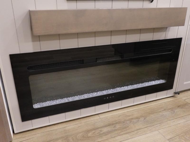 Travel to see family and friends while living in this RV or while on vacation! You will love the spacious rear living area thanks to the dual opposing slides which include the kitchen amenities and the 50" Smart TV with a fireplace. There is also a hidden pantry storage behind the TV for smart storage spaces! You can get comfortable on the dual recliner love seat or dine at the swivel table and desk. The kitchen island includes a sink and counter space to utilize many ways. The full bathroom is up the steps towards the front bedroom and includes a spacious 61" x 30" shower. You even have more floor space in the hallway thanks to the third slide out which includes shelf storage, plus more shelves and a king bed in the bedroom.