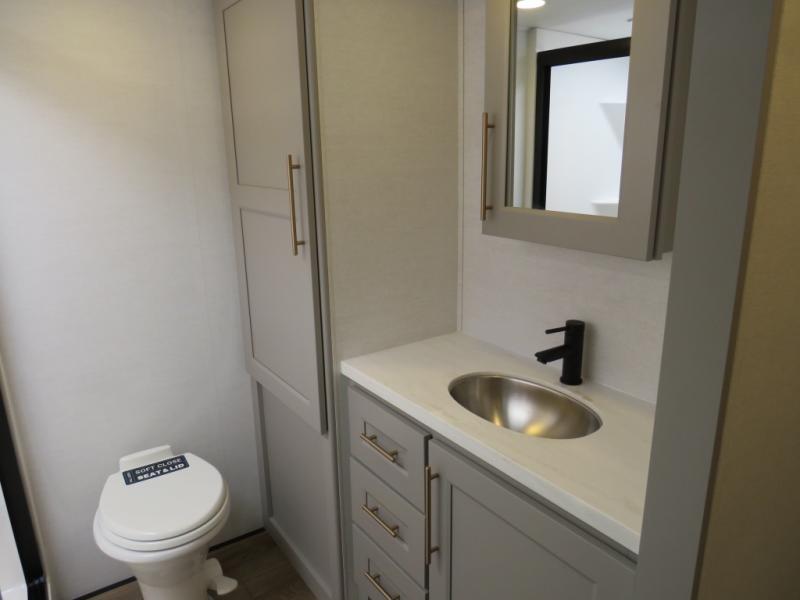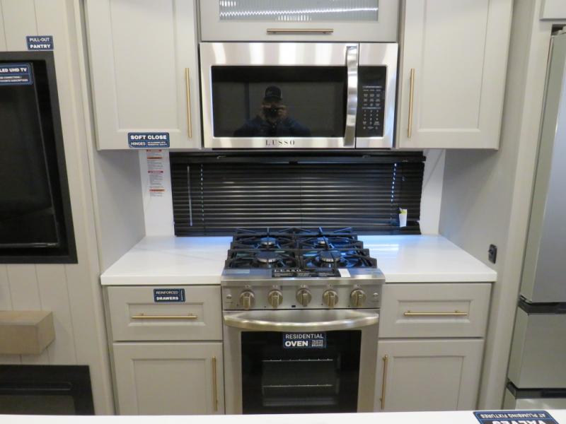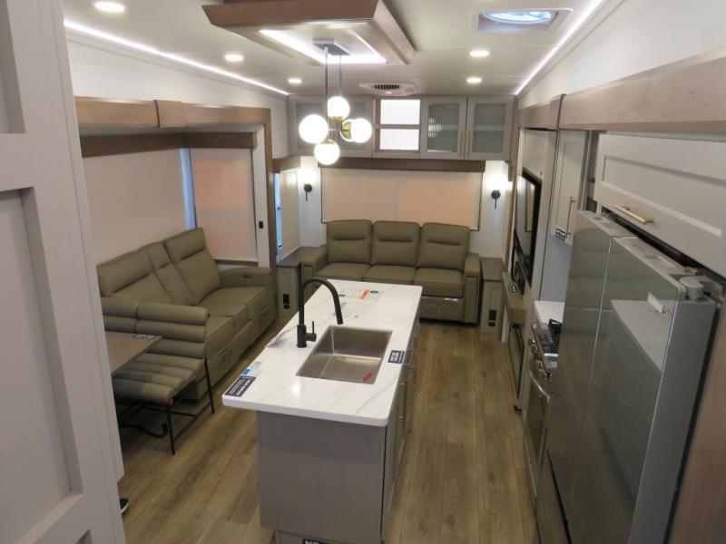 The Paradigm fifth wheels by Alliance RV are functional, high-quality, and luxurious for an unforgettable camping experience. There are three A/C units and a 40K BTU furnace to keep you comfortable year around, and you'll appreciate additional convenient amenities, like the all-in-one enclosed/heated utility center and the color coded and numbered wiring. A Rota-Flex pin box comes standard for hassle-free towing, along with Super-G 4,400 lb. rated tires and Dexter 7,000 lb. axles. You'll love the kitchen with its LG solid surface countertops and Lusso range, plus there is LED motion lighting in the pantry and a Maxx fan with a rain sensor to keep everything fresh when making dinner. Each model also includes an HD Smart TV in the living room and bedroom, plus a Winegard Air 360 antenna to keep you connected to the outside world. And of course there are a variety of options you can choose from to further customize your fifth wheel; dual pane windows, Super Solar Plus, slide out awning toppers, and generator prep or a generator to name a few!