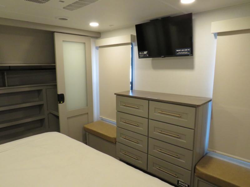 Travel to see family and friends while living in this RV or while on vacation! You will love the spacious rear living area thanks to the dual opposing slides which include the kitchen amenities and the 50" Smart TV with a fireplace. There is also a hidden pantry storage behind the TV for smart storage spaces! You can get comfortable on the dual recliner love seat or dine at the swivel table and desk. The kitchen island includes a sink and counter space to utilize many ways, plus there is dishwasher prep if you want to add that option. The full bathroom is up the steps towards the front bedroom and includes a spacious 61" x 30" shower. You even have more floor space in the hallway thanks to the third slide out which includes shelf storage, plus more shelves and a king bed in the bedroom.