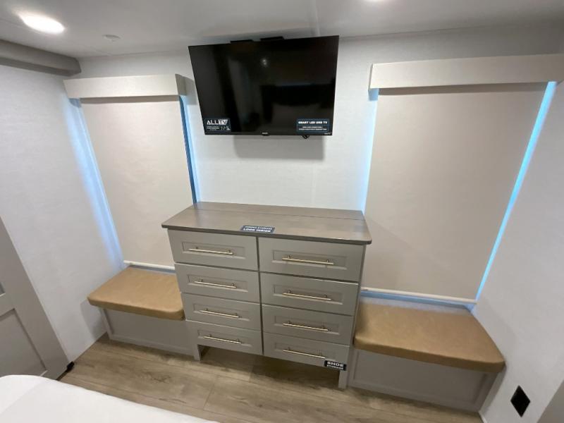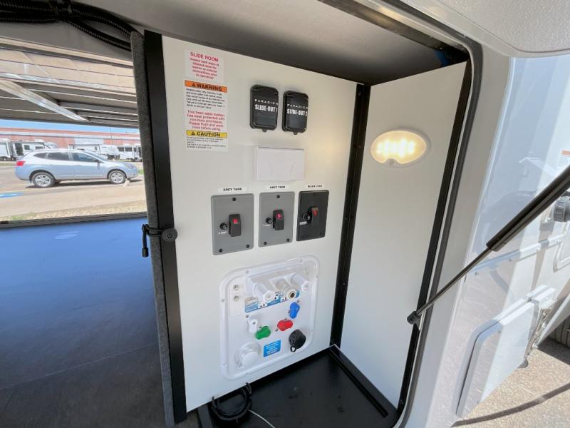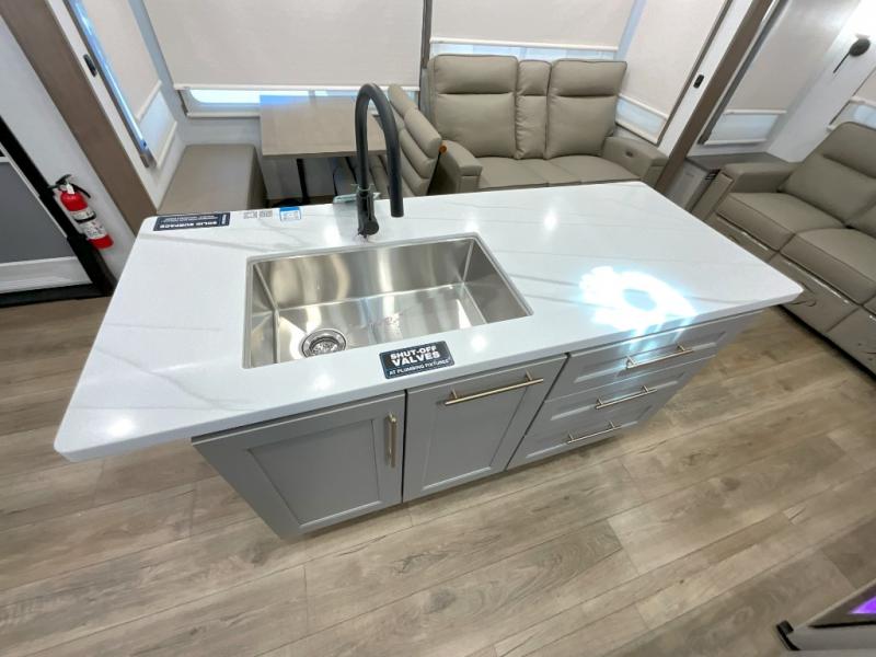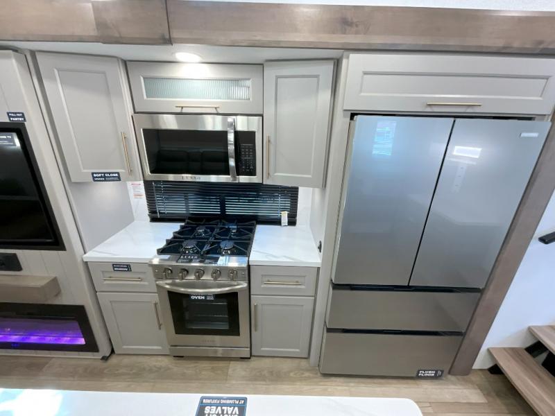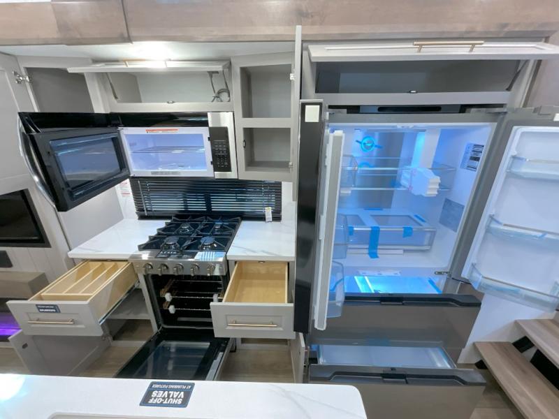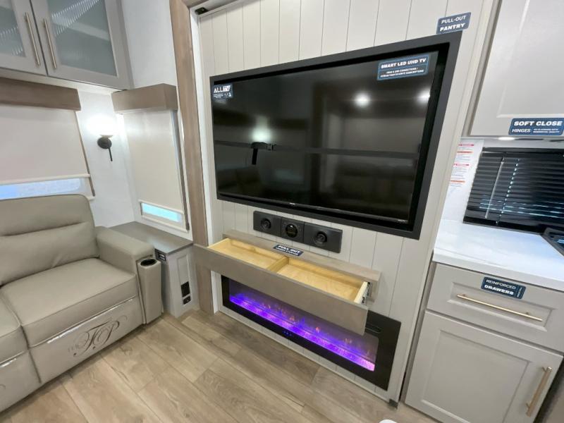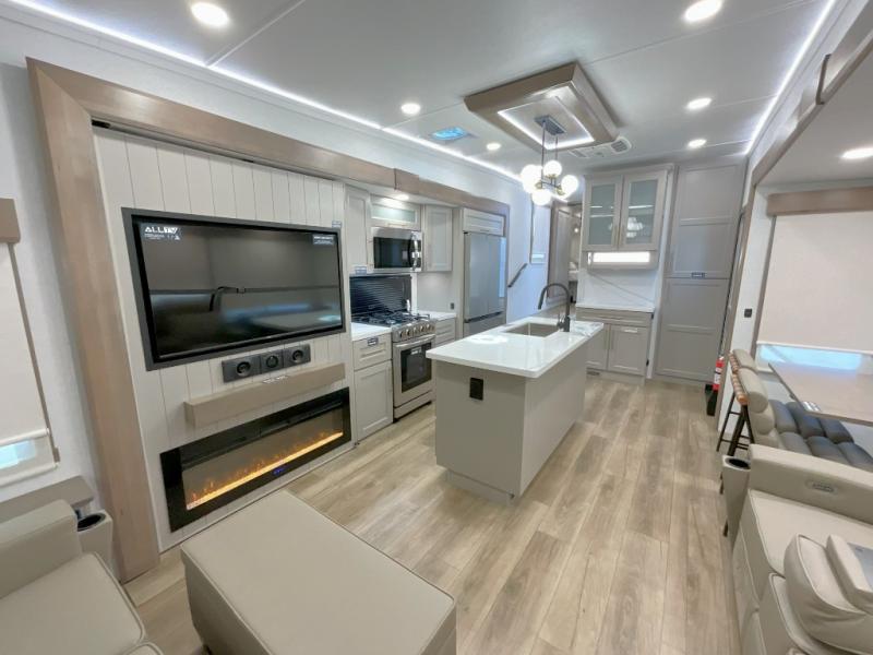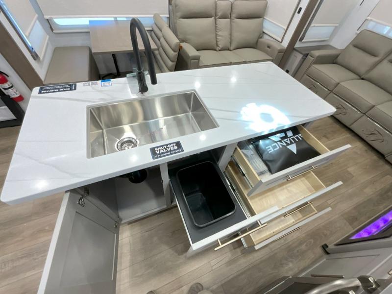 The Paradigm fifth wheels by Alliance RV are functional, high-quality, and luxurious for an unforgettable camping experience. There are three A/C units and a 40K BTU furnace to keep you comfortable year around, and you'll appreciate additional convenient amenities, like the all-in-one enclosed/heated utility center and the color coded and numbered wiring. A Rota-Flex pin box comes standard for hassle-free towing, along with Super-G 4,400 lb. rated tires and Dexter 7,000 lb. axles. You'll love the kitchen with its LG solid surface countertops and Lusso range, plus there is LED motion lighting in the pantry and a Maxx fan with a rain sensor to keep everything fresh when making dinner. Each model also includes an HD Smart TV in the living room and bedroom, plus a Winegard Air 360 antenna to keep you connected to the outside world. And of course there are a variety of options you can choose from to further customize your fifth wheel; dual pane windows, Super Solar Plus, slide out awning toppers, and generator prep or a generator to name a few!