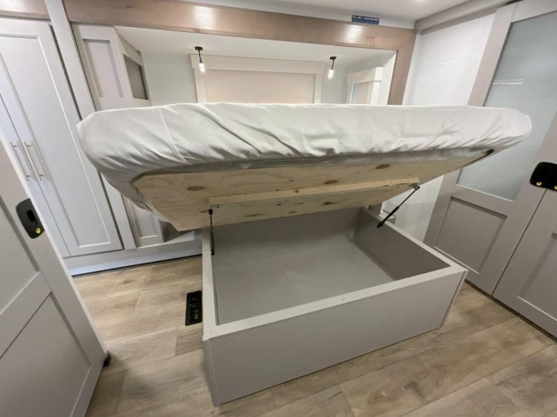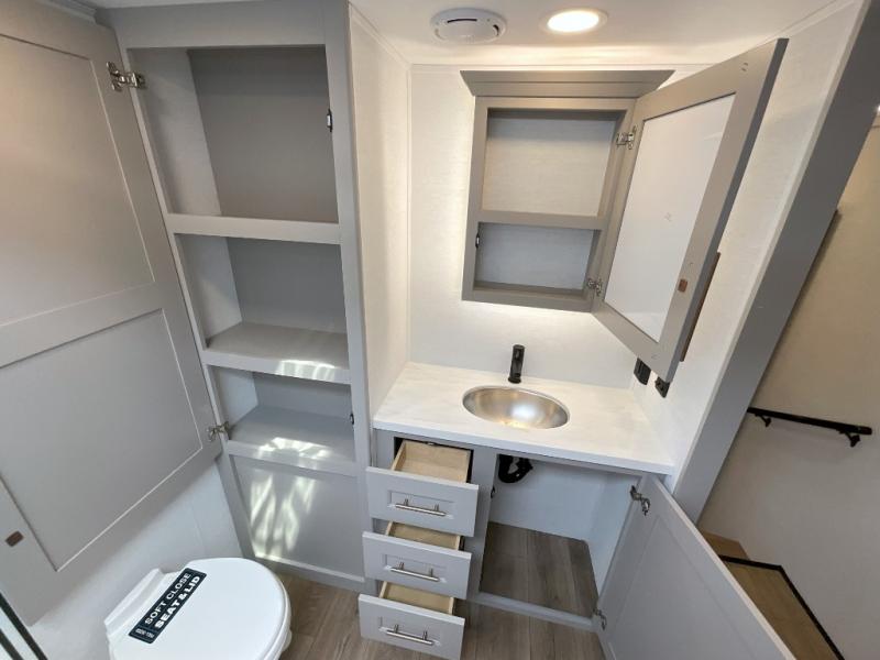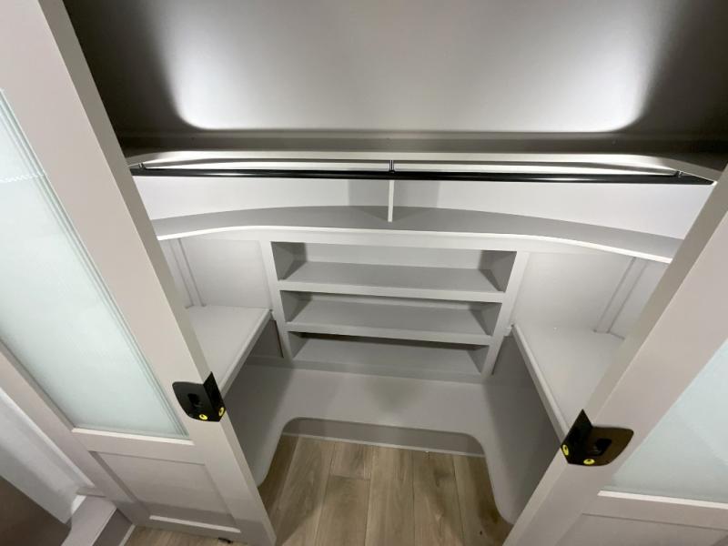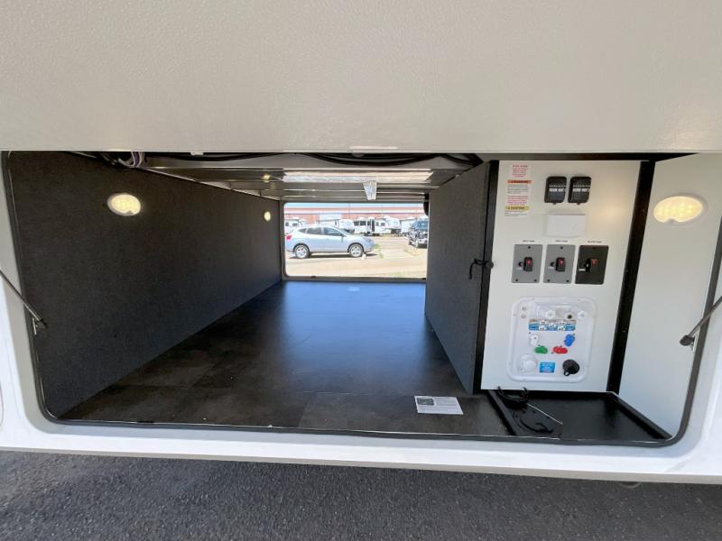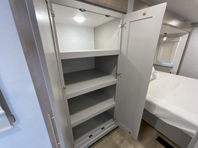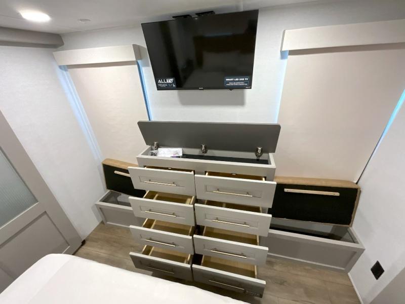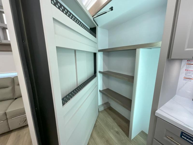 Travel to see family and friends while living in this RV or while on vacation! You will love the spacious rear living area thanks to the dual opposing slides which include the kitchen amenities and the 50" Smart TV with a fireplace. There is also a hidden pantry storage behind the TV for smart storage spaces! You can get comfortable on the dual recliner love seat or dine at the swivel table and desk. The kitchen island includes a sink and counter space to utilize many ways, plus there is dishwasher prep if you want to add that option. The full bathroom is up the steps towards the front bedroom and includes a spacious 61" x 30" shower. You even have more floor space in the hallway thanks to the third slide out which includes shelf storage, plus more shelves and a king bed in the bedroom.