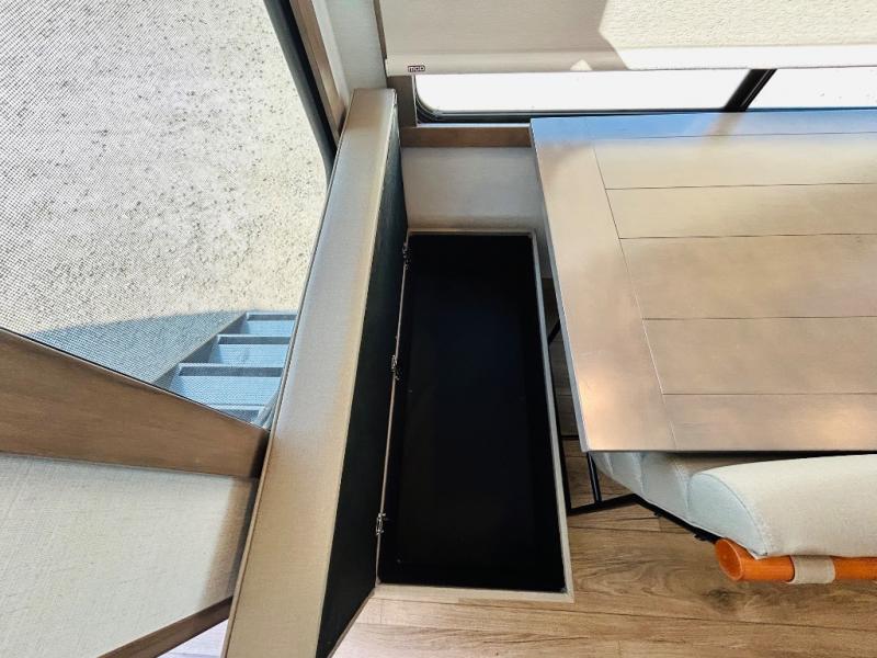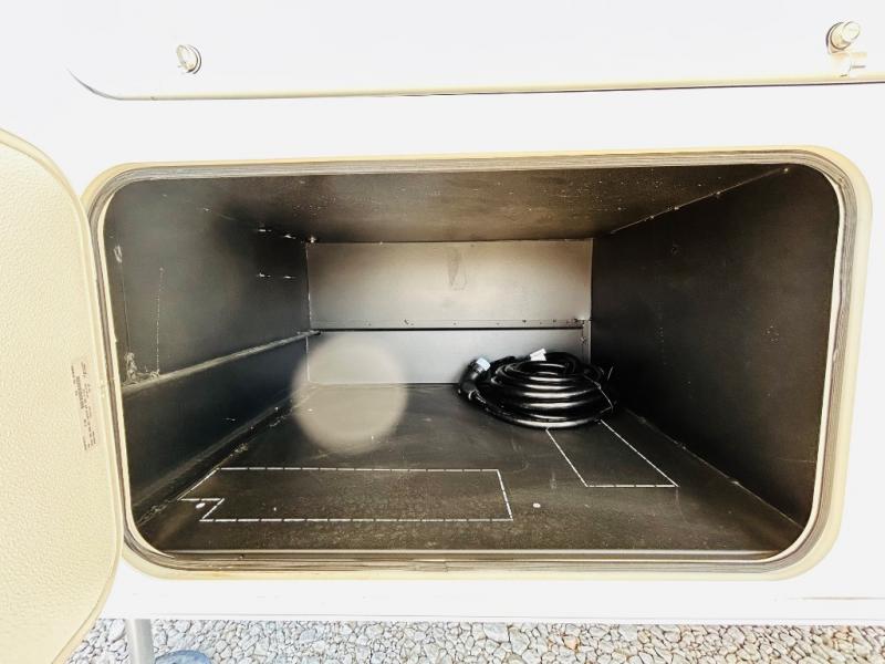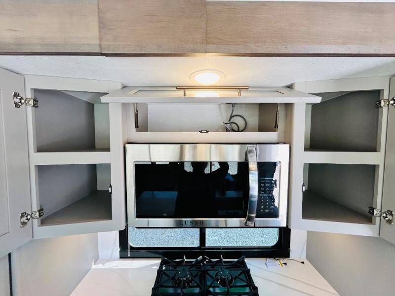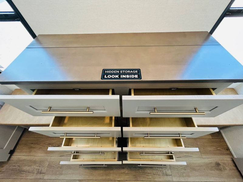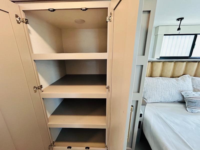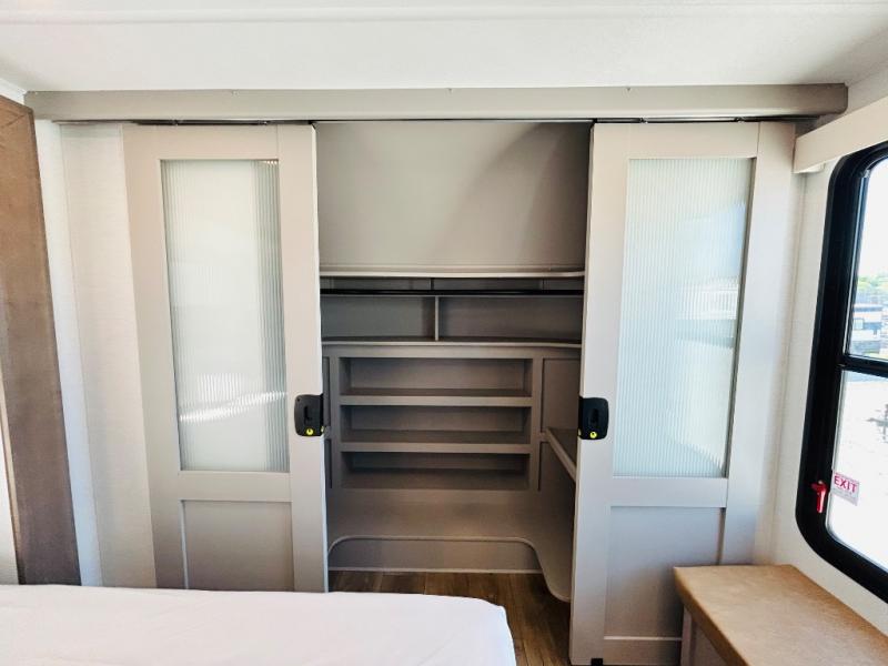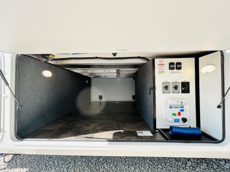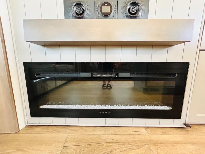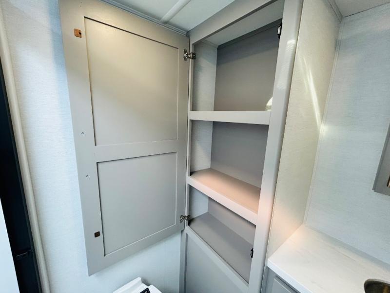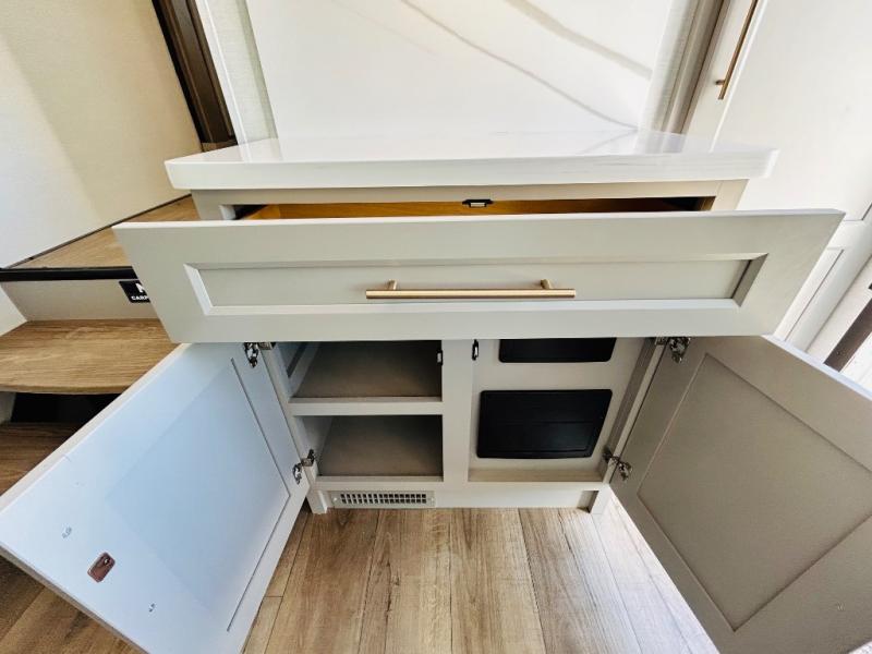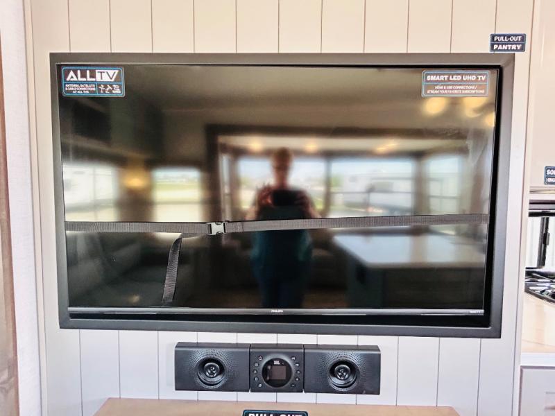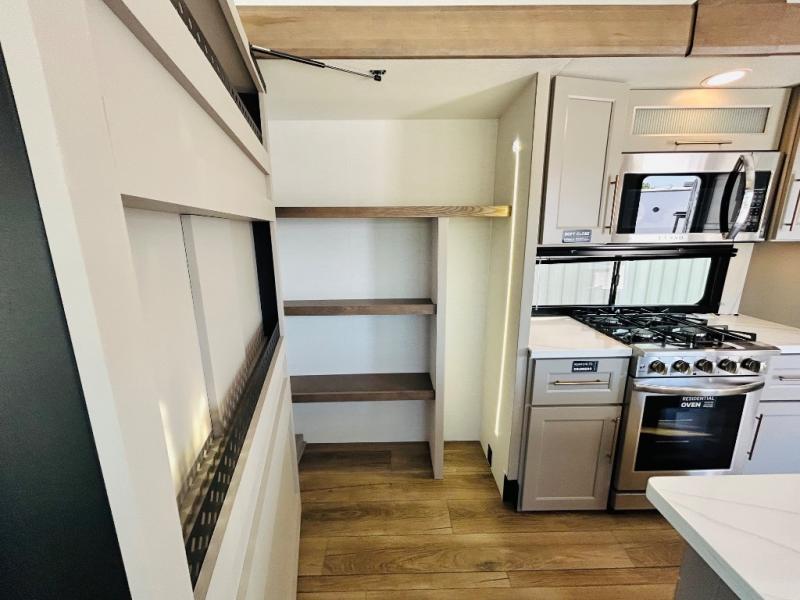 Travel to see family and friends while living in this RV or while on vacation! You will love the spacious rear living area thanks to the dual opposing slides which include the kitchen amenities and the 50" Smart TV with a fireplace. There is also a hidden pantry storage behind the TV for smart storage spaces! You can get comfortable on the dual recliner love seat or dine at the swivel table and desk. The kitchen island includes a sink and counter space to utilize many ways, plus there is dishwasher prep if you want to add that option. The full bathroom is up the steps towards the front bedroom and includes a spacious 61" x 30" shower. You even have more floor space in the hallway thanks to the third slide out which includes shelf storage, plus more shelves and a king bed in the bedroom.