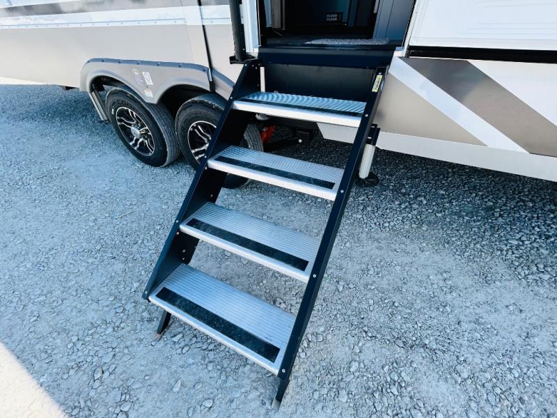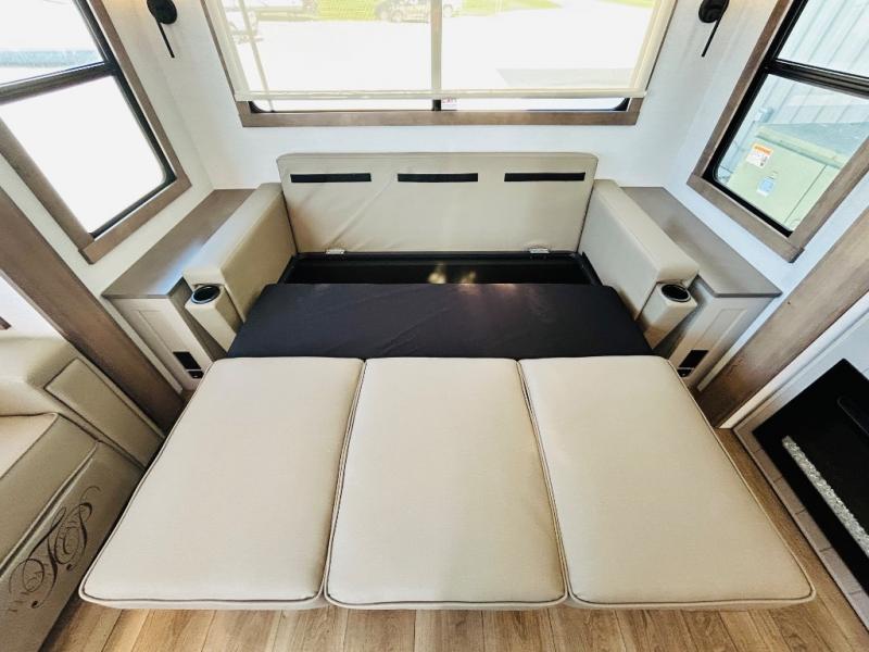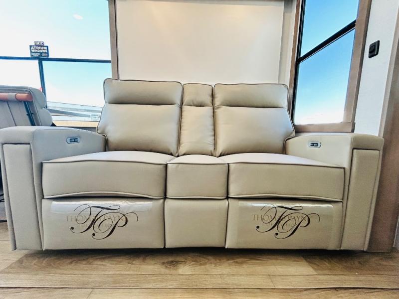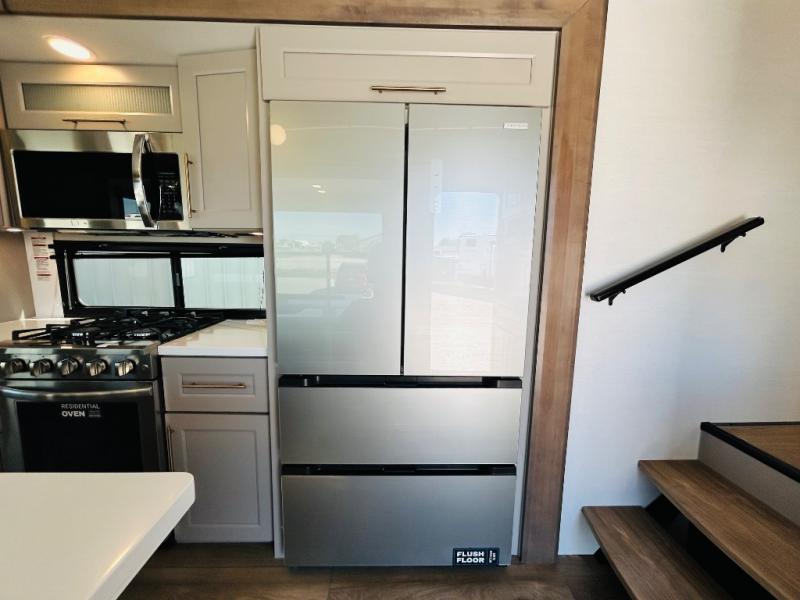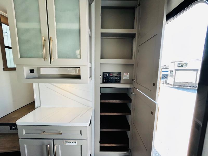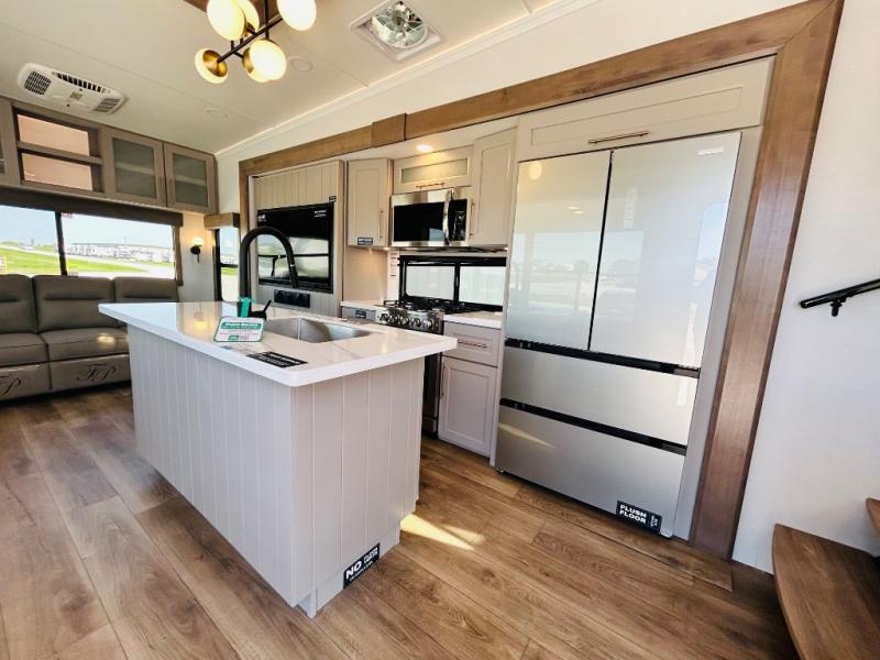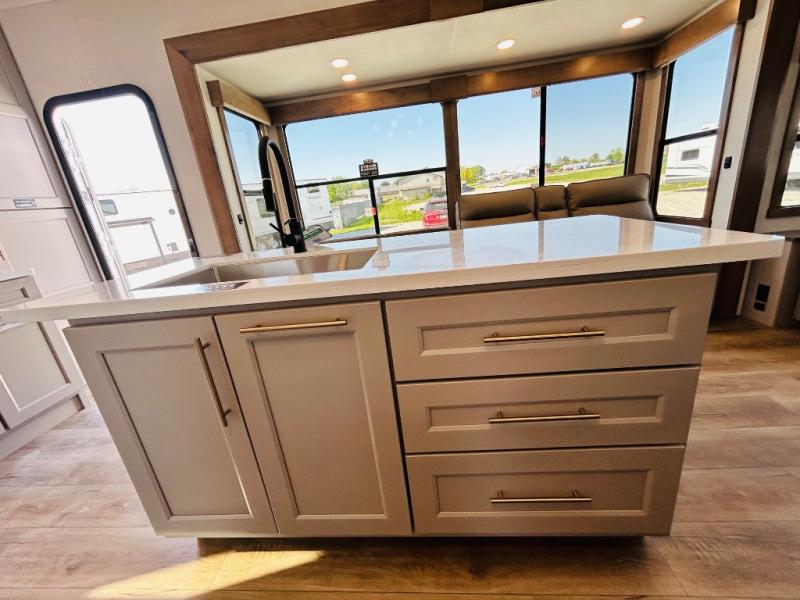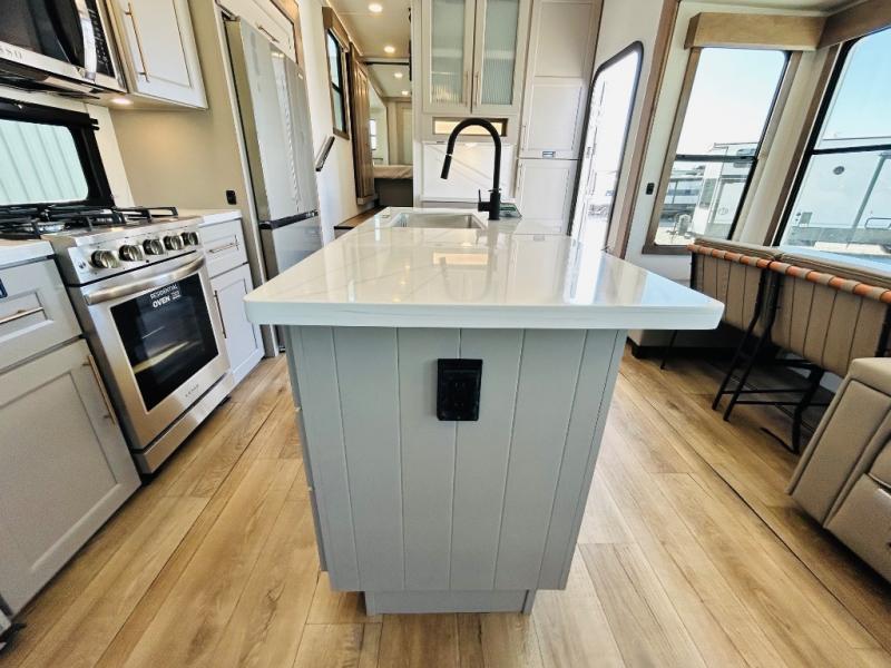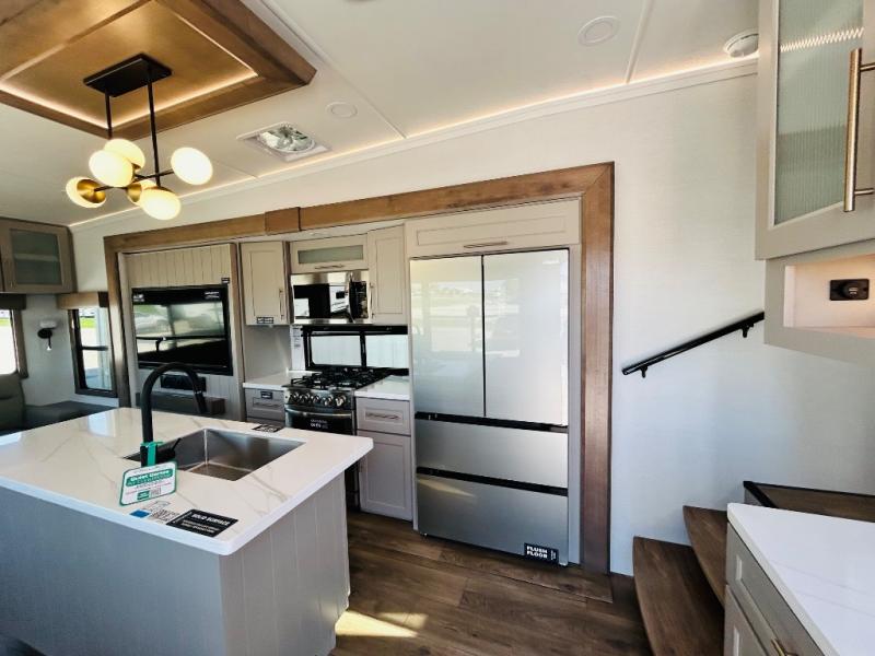 The Paradigm fifth wheels by Alliance RV are functional, high-quality, and luxurious for an unforgettable camping experience. There are three A/C units and a 40K BTU furnace to keep you comfortable year around, and you'll appreciate additional convenient amenities, like the all-in-one enclosed/heated utility center and the color coded and numbered wiring. A Rota-Flex pin box comes standard for hassle-free towing, along with Super-G 4,400 lb. rated tires and Dexter 7,000 lb. axles. You'll love the kitchen with its LG solid surface countertops and Lusso range, plus there is LED motion lighting in the pantry and a Maxx fan with a rain sensor to keep everything fresh when making dinner. Each model also includes an HD Smart TV in the living room and bedroom, plus a Winegard Air 360 antenna to keep you connected to the outside world. And of course there are a variety of options you can choose from to further customize your fifth wheel; dual pane windows, Super Solar Plus, slide out awning toppers, and generator prep or a generator to name a few!