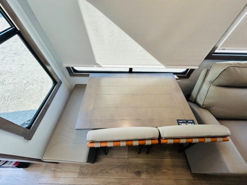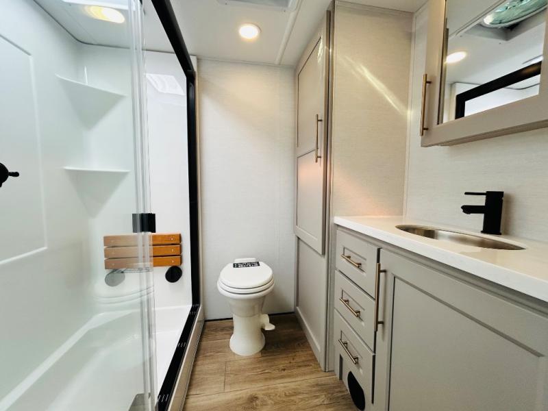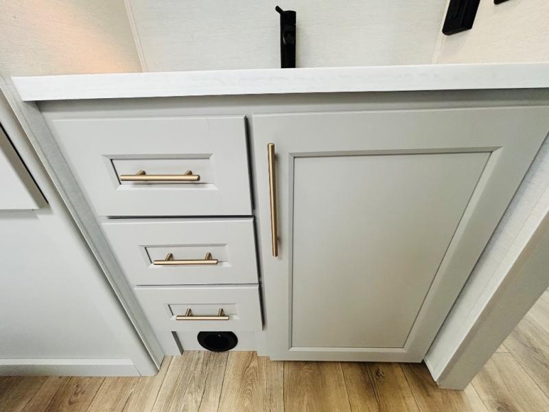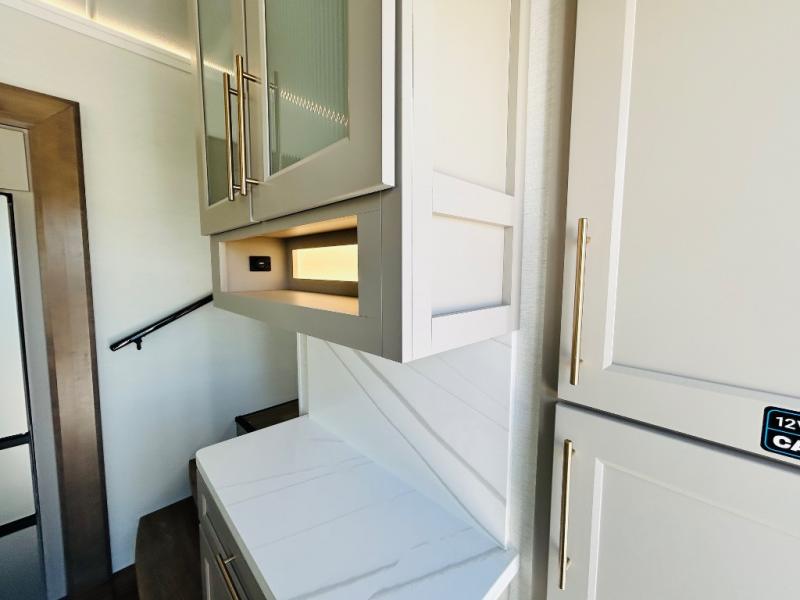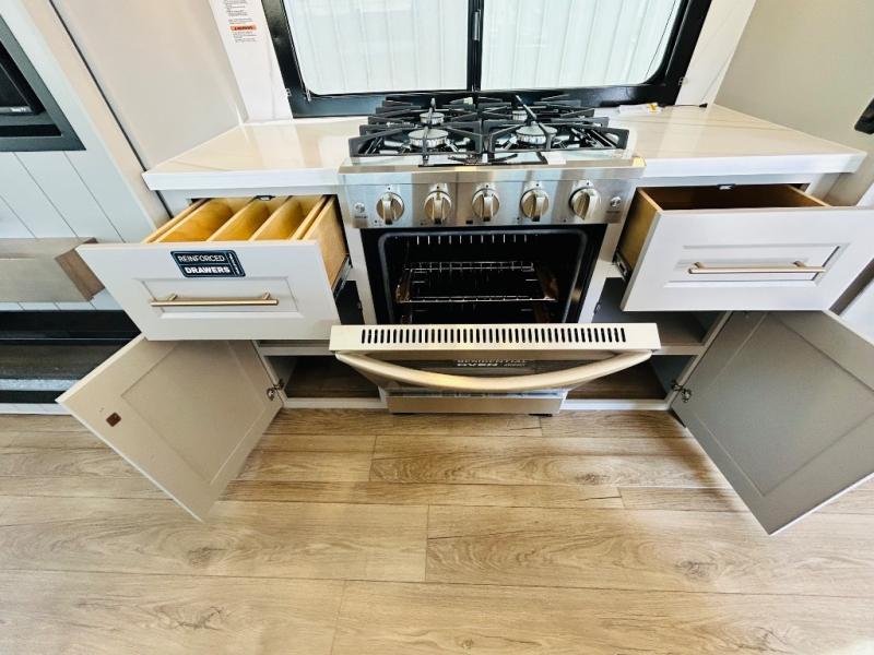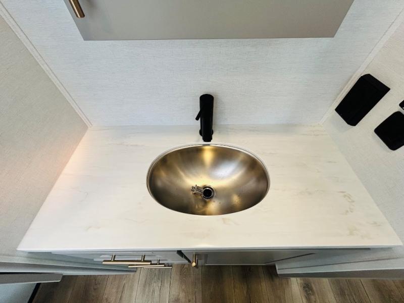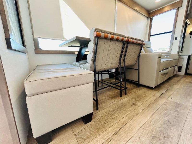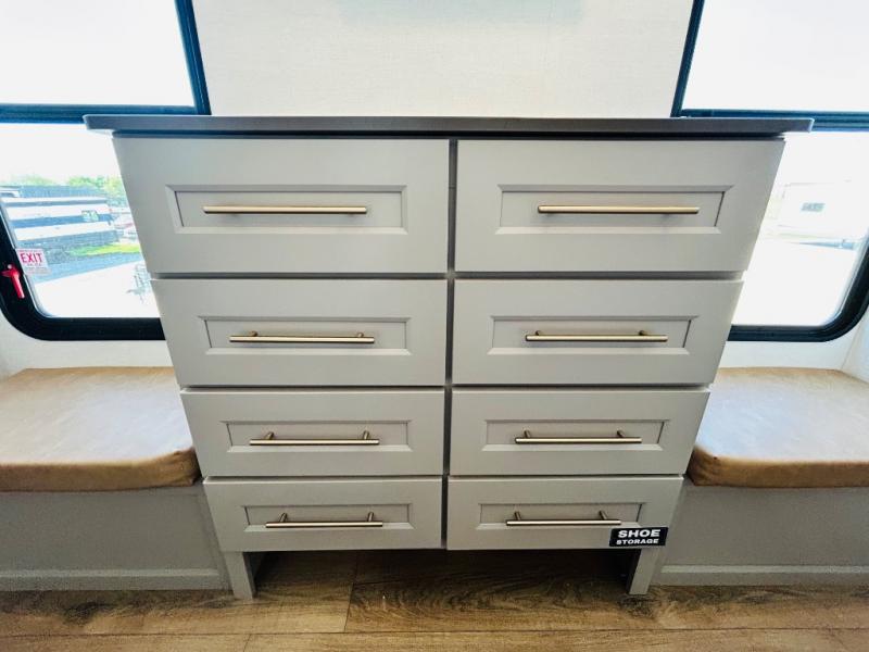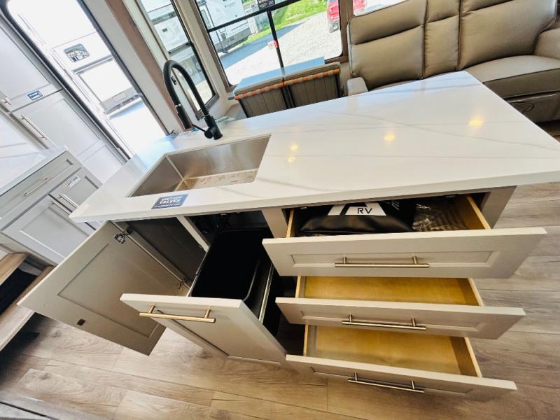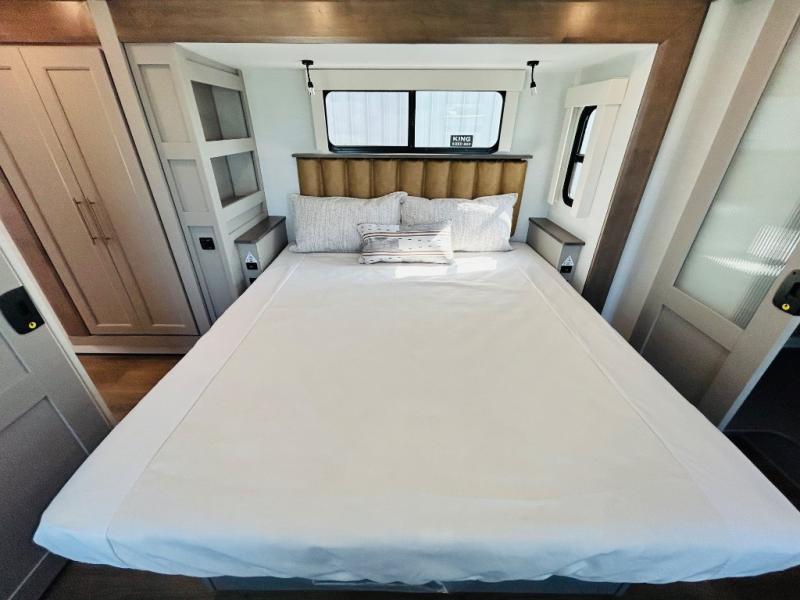 The Paradigm fifth wheels by Alliance RV are functional, high-quality, and luxurious for an unforgettable camping experience. There are three A/C units and a 40K BTU furnace to keep you comfortable year around, and you'll appreciate additional convenient amenities, like the all-in-one enclosed/heated utility center and the color coded and numbered wiring. A Rota-Flex pin box comes standard for hassle-free towing, along with Super-G 4,400 lb. rated tires and Dexter 7,000 lb. axles. You'll love the kitchen with its LG solid surface countertops and Lusso range, plus there is LED motion lighting in the pantry and a Maxx fan with a rain sensor to keep everything fresh when making dinner. Each model also includes an HD Smart TV in the living room and bedroom, plus a Winegard Air 360 antenna to keep you connected to the outside world. And of course there are a variety of options you can choose from to further customize your fifth wheel; dual pane windows, Super Solar Plus, slide out awning toppers, and generator prep or a generator to name a few!