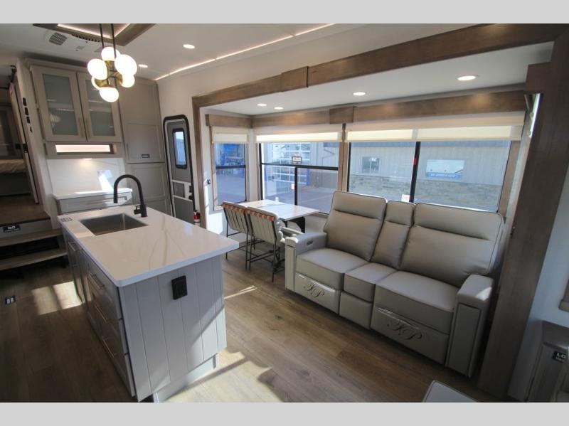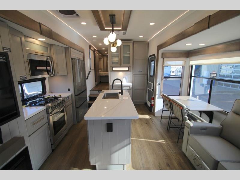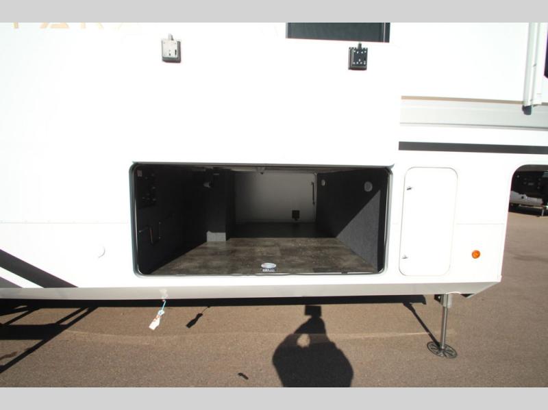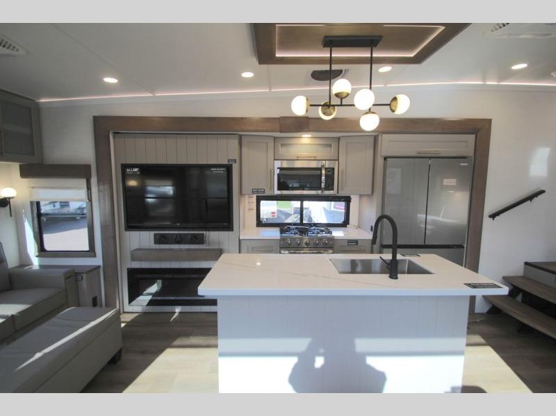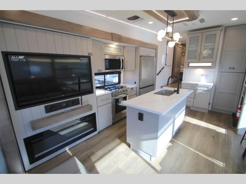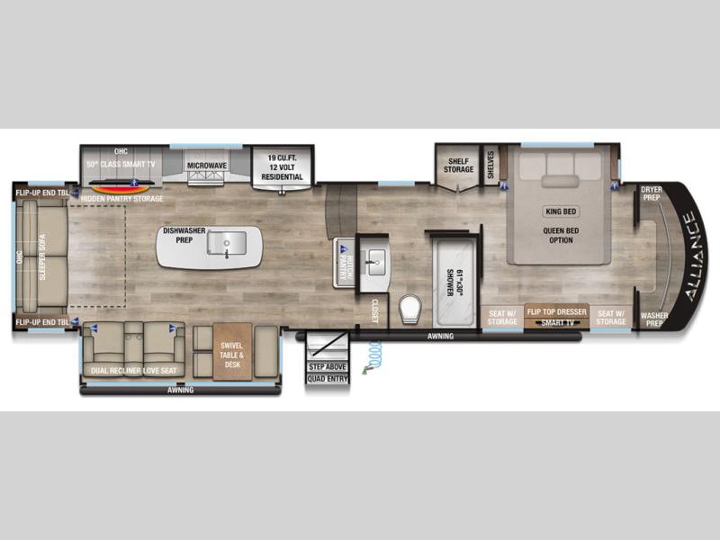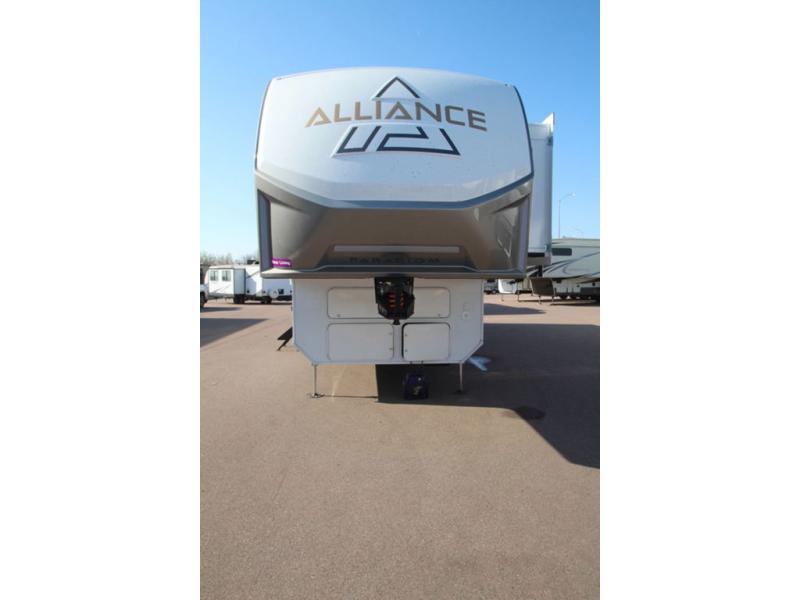The Paradigm fifth wheels by Alliance RV are functional, high-quality, and luxurious for an unforgettable camping experience. There are three A/C units and a 40K BTU furnace to keep you comfortable year around, and you'll appreciate additional convenient amenities, like the all-in-one enclosed/heated utility center and the color coded and numbered wiring. A Helux Series coil spring pin box comes standard for hassle-free towing, along with Super-G 4,400 lb. rated tires and Dexter 7,000 lb. axles. You'll love the kitchen with its LG solid surface countertops and Lusso range, plus there is LED motion lighting in the pantry and a Maxx fan with a rain sensor to keep everything fresh when making dinner. Each model also includes an HD Smart TV in the living room and bedroom, plus a Winegard Air 360 antenna to keep you connected to the outside world. And of course there are a variety of options you can choose from to further customize your fifth wheel; dual pane windows, Super Solar Plus, slide out awning toppers, and generator prep or a generator to name a few!