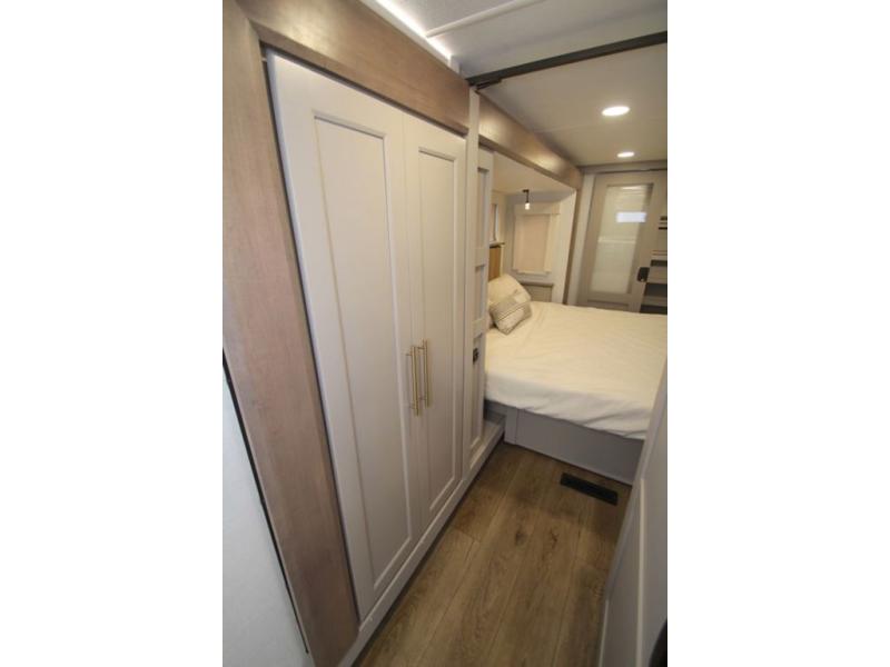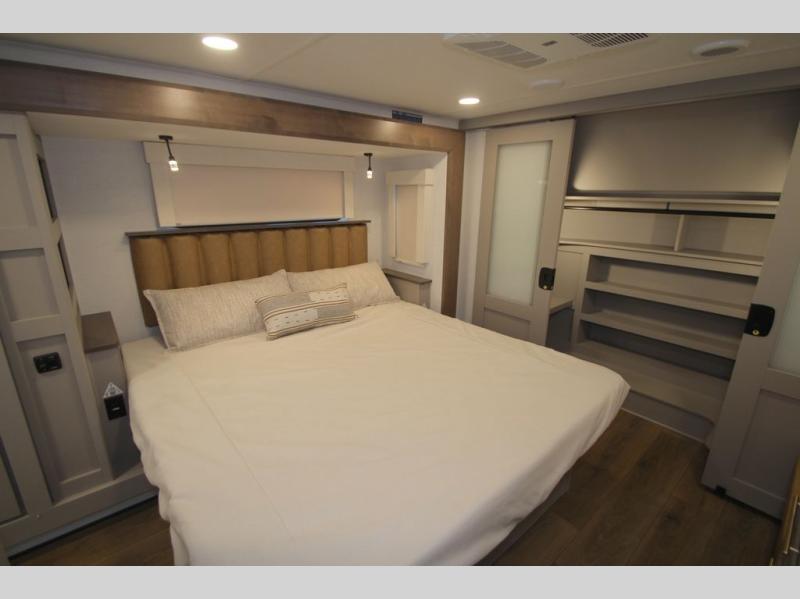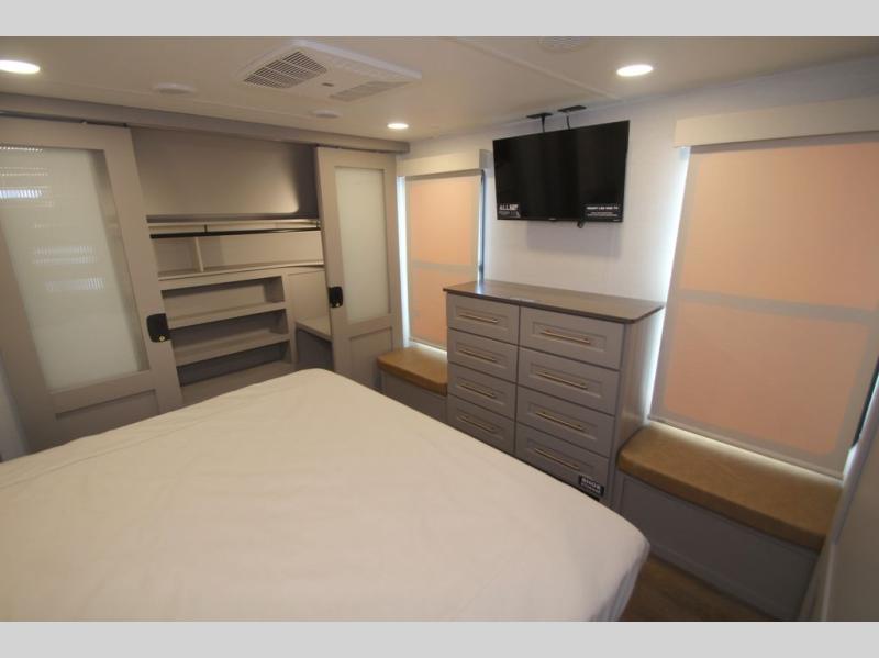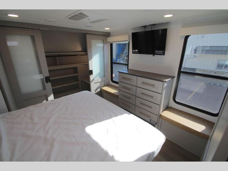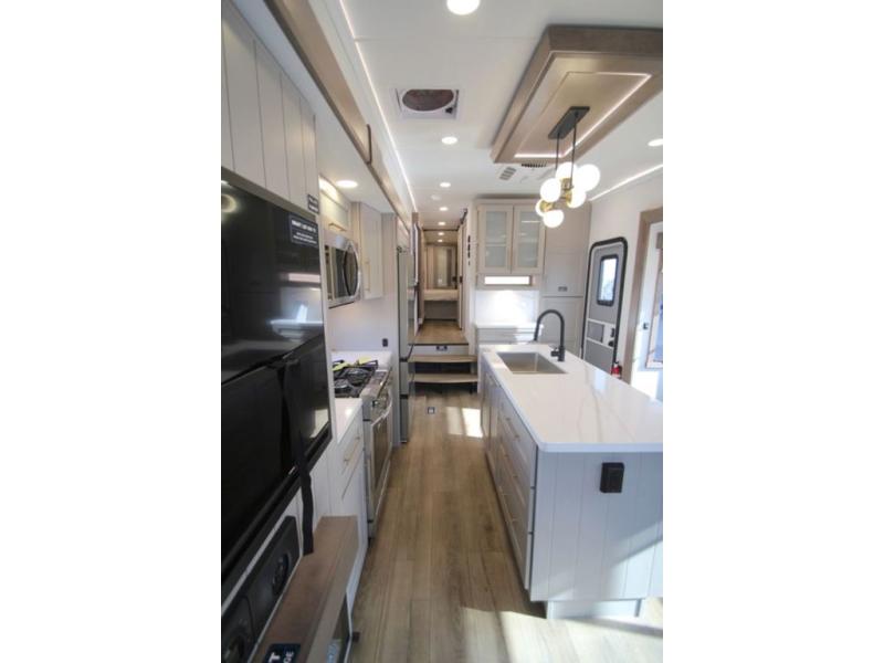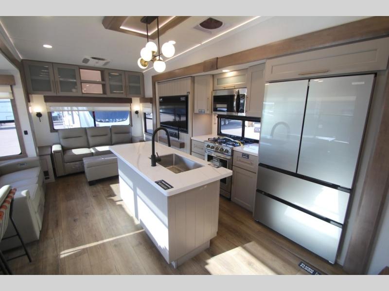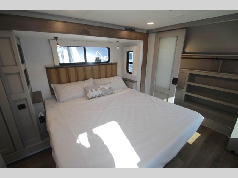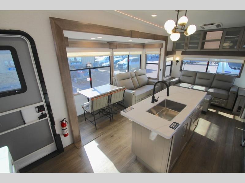 The Paradigm fifth wheels by Alliance RV are functional, high-quality, and luxurious for an unforgettable camping experience. There are three A/C units and a 40K BTU furnace to keep you comfortable year around, and you'll appreciate additional convenient amenities, like the all-in-one enclosed/heated utility center and the color coded and numbered wiring. A Helux Series coil spring pin box comes standard for hassle-free towing, along with Super-G 4,400 lb. rated tires and Dexter 7,000 lb. axles. You'll love the kitchen with its LG solid surface countertops and Lusso range, plus there is LED motion lighting in the pantry and a Maxx fan with a rain sensor to keep everything fresh when making dinner. Each model also includes an HD Smart TV in the living room and bedroom, plus a Winegard Air 360 antenna to keep you connected to the outside world. And of course there are a variety of options you can choose from to further customize your fifth wheel; dual pane windows, Super Solar Plus, slide out awning toppers, and generator prep or a generator to name a few!