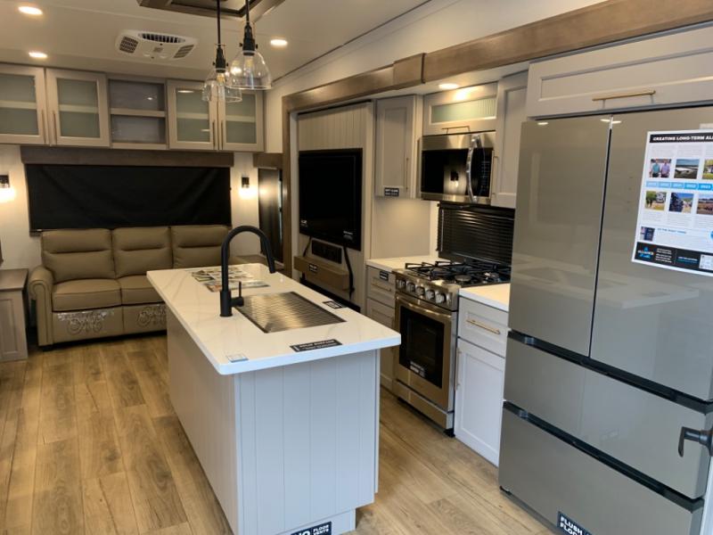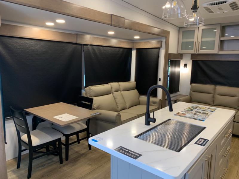 The Paradigm fifth wheels by Alliance RV are functional, high-quality, and luxurious for an unforgettable camping experience. There are three A/C units and a 40K BTU furnace to keep you comfortable year around, and you'll appreciate additional convenient amenities, like the all-in-one enclosed/heated utility center and the color coded and numbered wiring. A Rota-Flex pin box comes standard for hassle-free towing, along with Super-G 4,400 lb. rated tires and Dexter 7,000 lb. axles. You'll love the kitchen with its LG solid surface countertops and Insignia range, plus there is LED motion lighting in the pantry and a Maxx fan with a rain sensor to keep everything fresh when making dinner. Each model also includes an HD Smart TV in the living room and bedroom, plus a Winegard Air 360 antenna to keep you connected to the outside world. And of course there are a variety of options you can choose from to further customize your fifth wheel; dual pane windows, Super Solar Plus, slide out awning toppers, and generator prep or a generator to name a few!