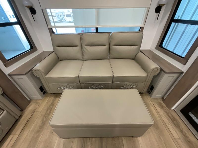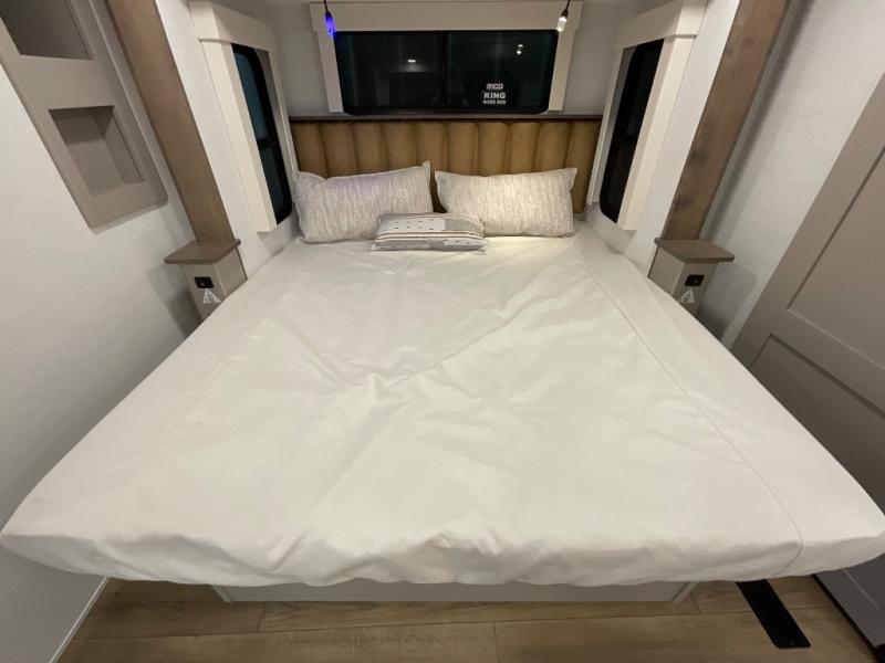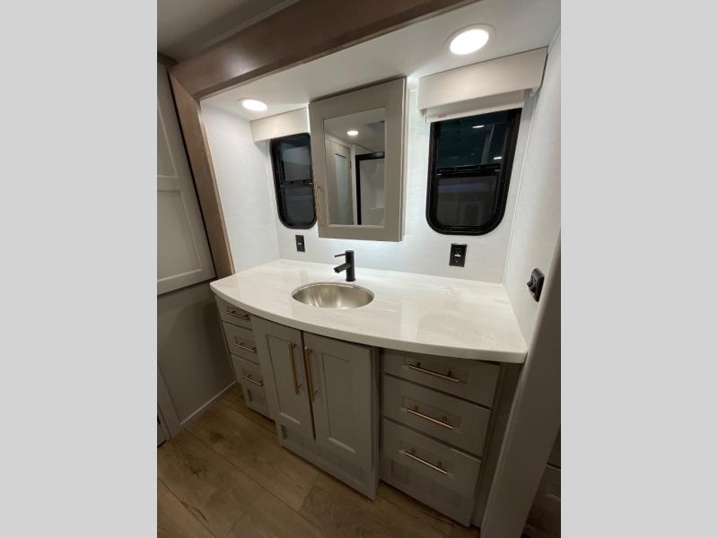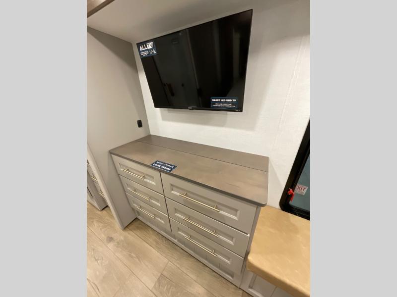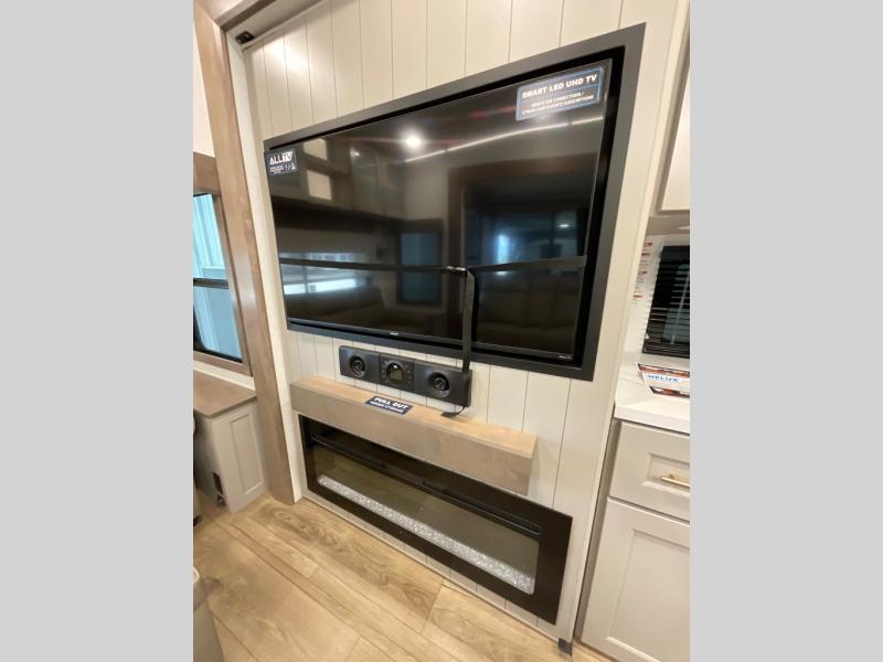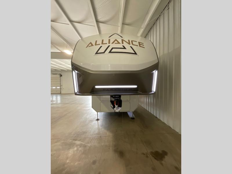 The Paradigm fifth wheels by Alliance RV are functional, high-quality, and luxurious for an unforgettable camping experience. There are three A/C units and a 40K BTU furnace to keep you comfortable year around, and you'll appreciate additional convenient amenities, like the all-in-one enclosed/heated utility center and the color coded and numbered wiring. A Rota-Flex pin box comes standard for hassle-free towing, along with Super-G 4,400 lb. rated tires and Dexter 7,000 lb. axles. You'll love the kitchen with its LG solid surface countertops and Lusso range, plus there is LED motion lighting in the pantry and a Maxx fan with a rain sensor to keep everything fresh when making dinner. Each model also includes an HD Smart TV in the living room and bedroom, plus a Winegard Air 360 antenna to keep you connected to the outside world. And of course there are a variety of options you can choose from to further customize your fifth wheel; dual pane windows, Super Solar Plus, slide out awning toppers, and generator prep or a generator to name a few!