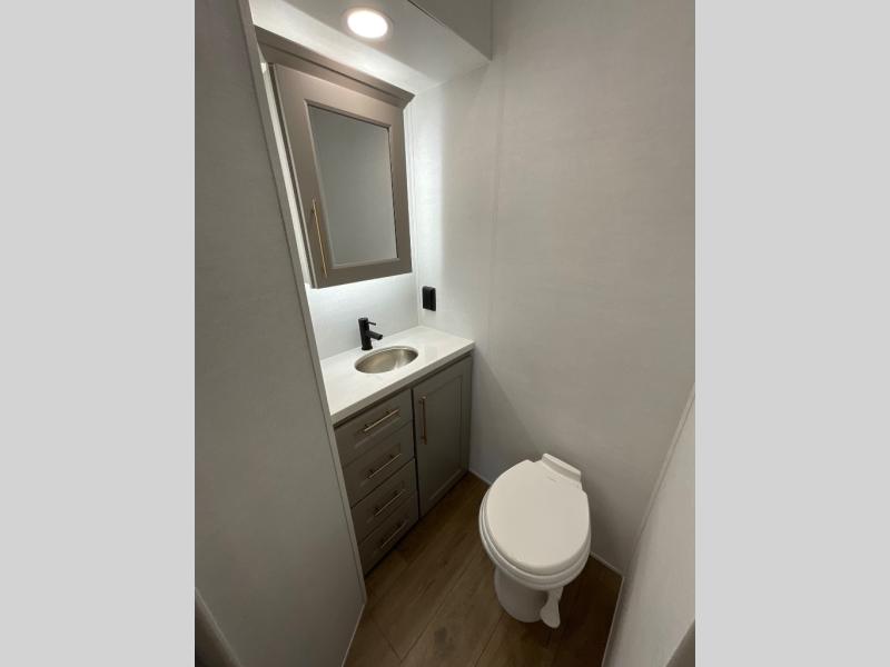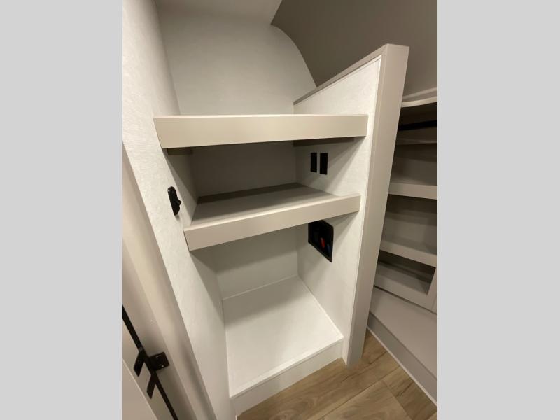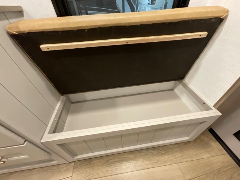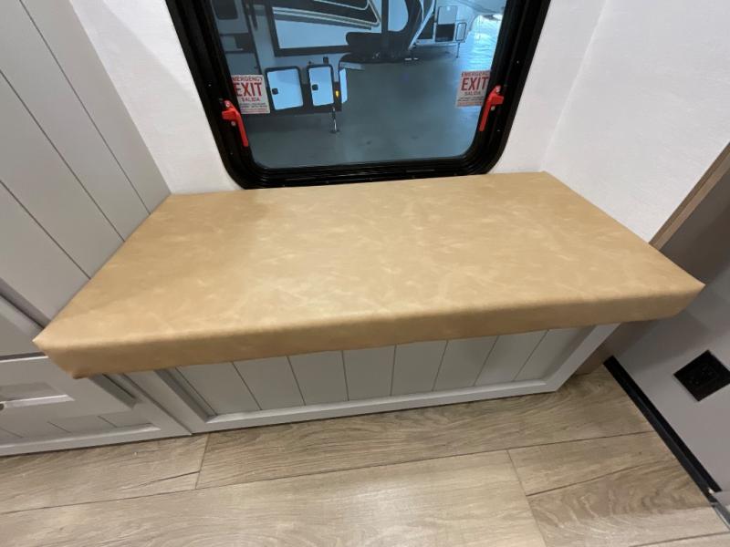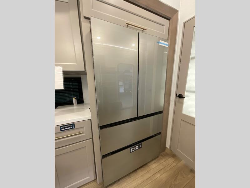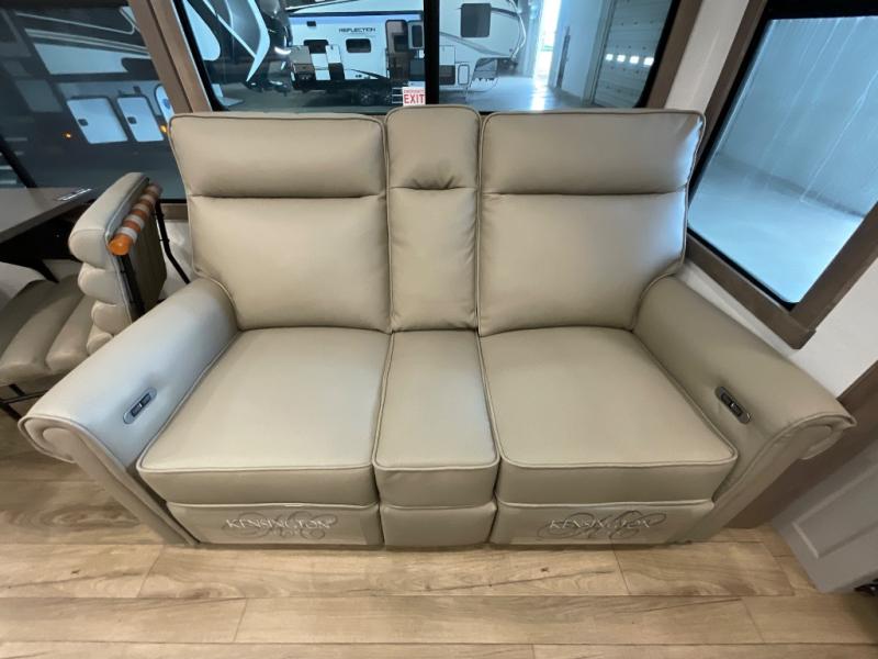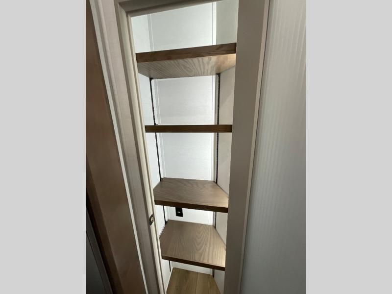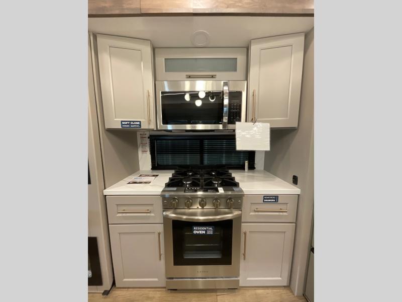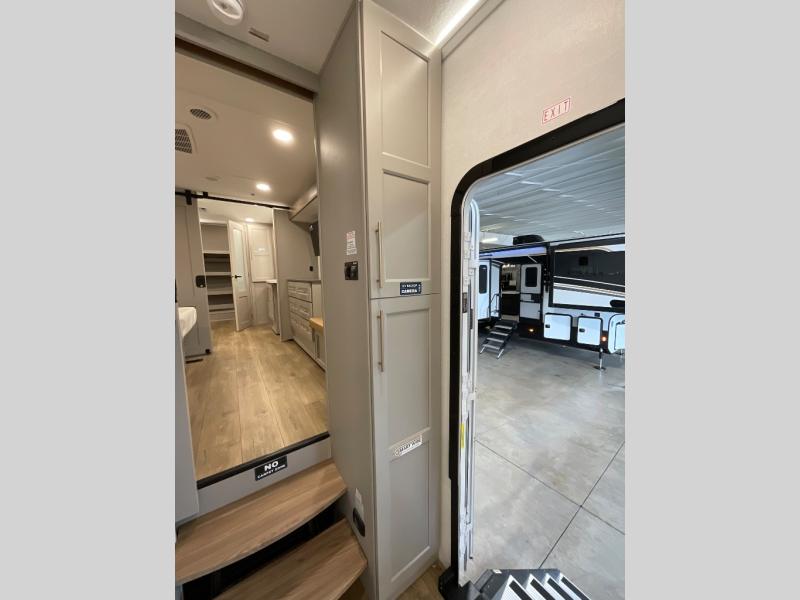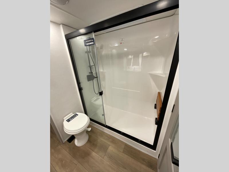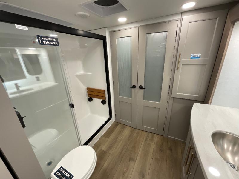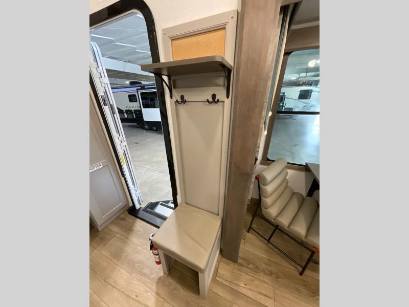 Whether you decide to be a full-timer or a long-trip traveler, this Paradigm offers so many comforts and conveniences you will love! The large full bathroom might be the reason you decide to be a new owner because you will have a large 61" x 30" shower to get cleaned up in, linen storage, and a walk-in closet with a hamper, shelves, and a space prepped for an optional washer/dryer. The bedroom allows you to sleep like a king and gives you extra floor space with the two slides, and there is storage in the flip-top dresser and under the seat, plus you can watch the Smart TV. The space saving sliding doors offer style as well. The cook will love all the residential appliances, including a residential refrigerator. The kitchen island gives you a large sink and dishwasher prep also. The half bath is super convenient just like the entry sitting bench/coat rack and closet. And you can relax on the sleeper sofa, dual recliner love seat, or swivel table and desk.