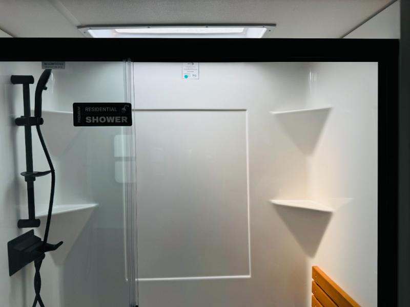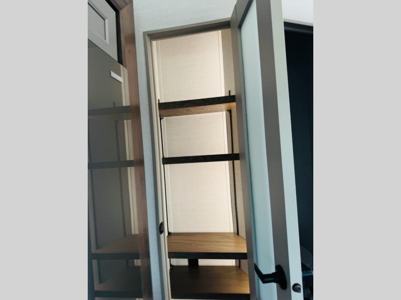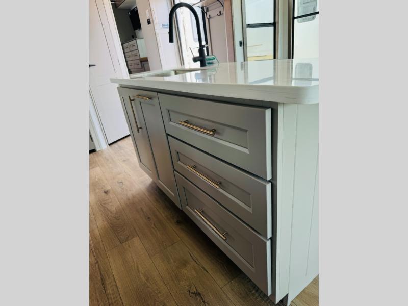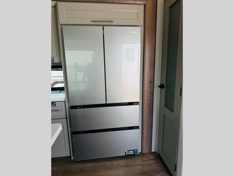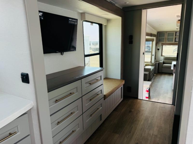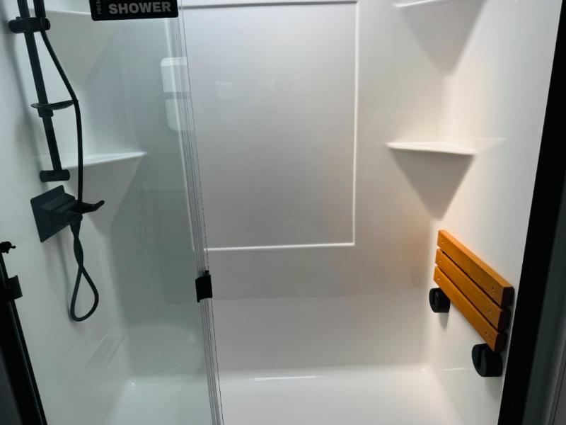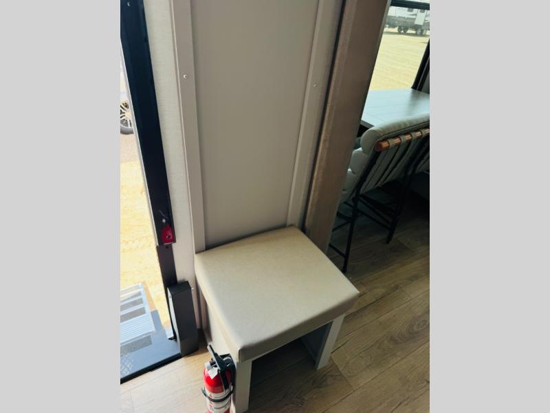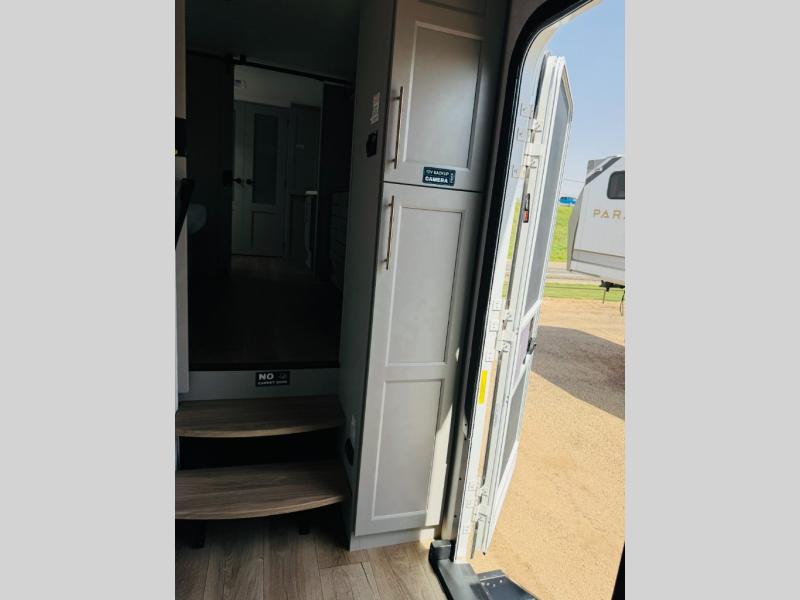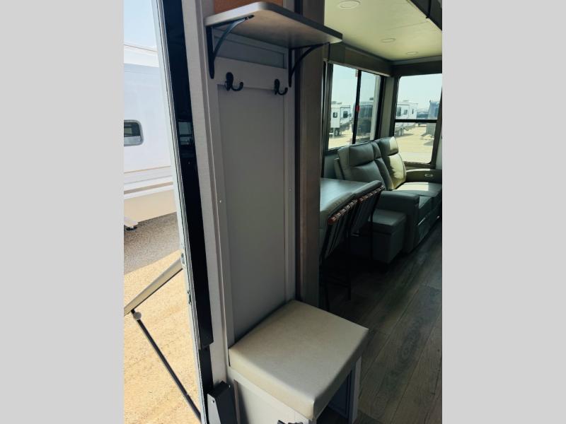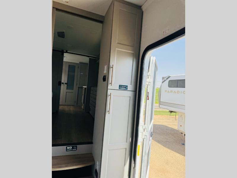 Whether you decide to be a full-timer or a long-trip traveler, this Paradigm offers so many comforts and conveniences you will love! The large full bathroom might be the reason you decide to be a new owner because you will have a large 61" x 30" shower to get cleaned up in, linen storage, and a walk-in closet with a hamper, shelves, and a space prepped for an optional washer/dryer. The bedroom allows you to sleep like a king and gives you extra floor space with the two slides, and there is storage in the flip-top dresser and under the seat, plus you can watch the Smart TV. The space saving sliding doors offer style as well. The cook will love all the residential appliances, including a residential refrigerator. The kitchen island gives you a large sink and dishwasher prep also. The half bath is super convenient just like the entry sitting bench/coat rack and closet. And you can relax on the sleeper sofa, dual recliner love seat, or swivel table and desk.