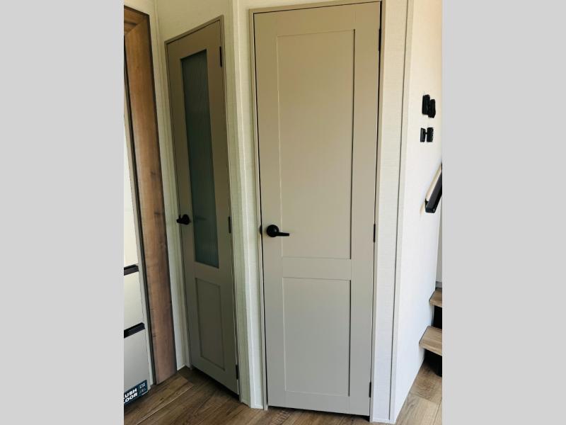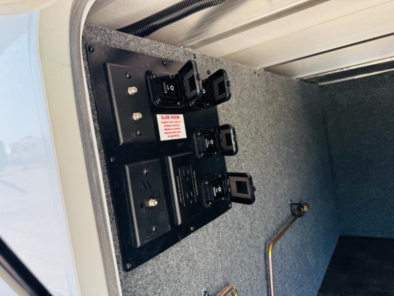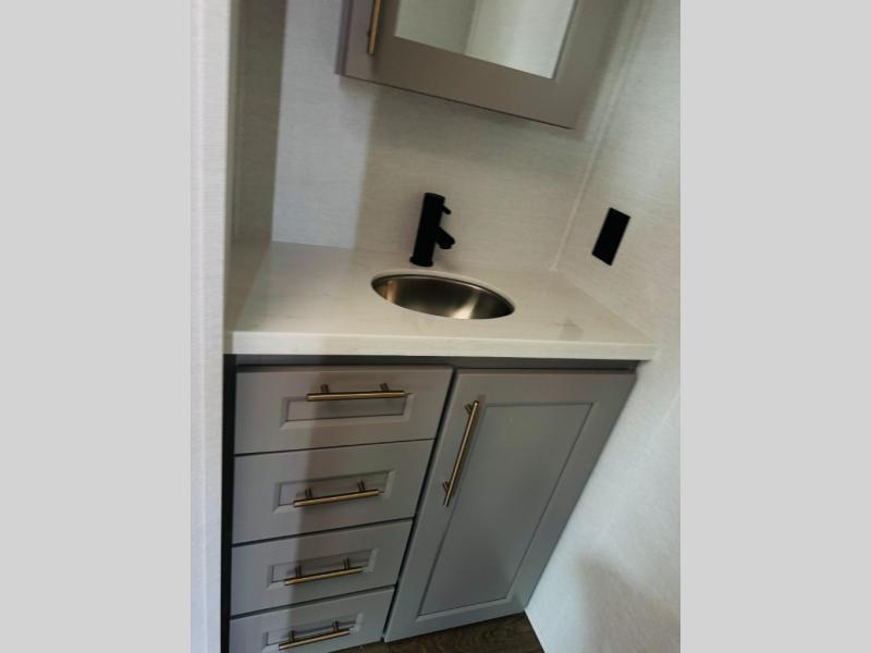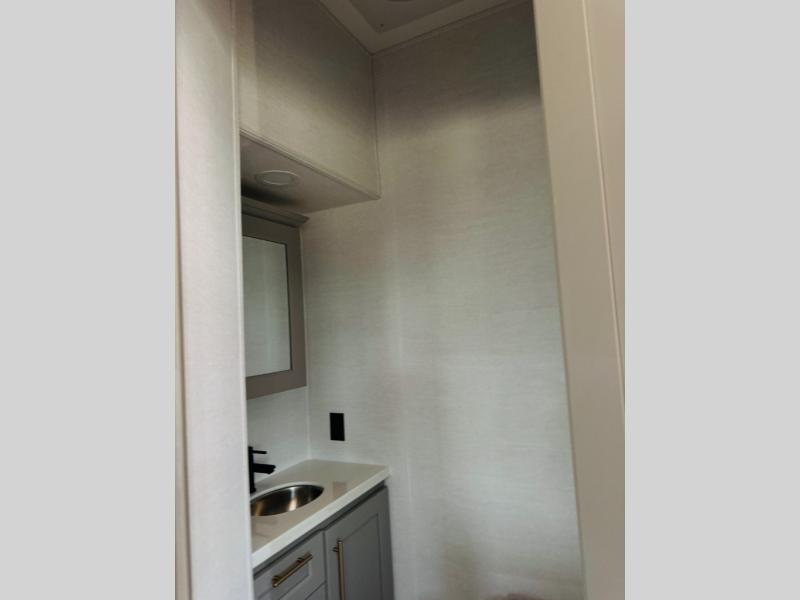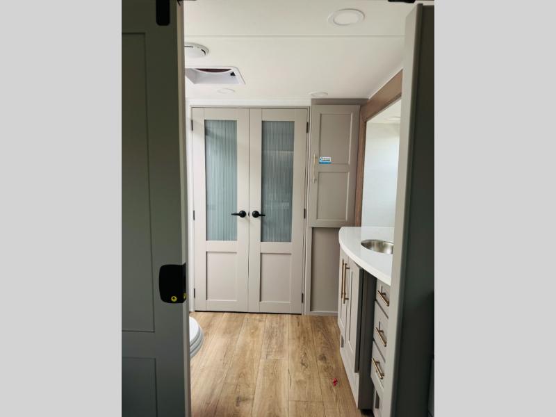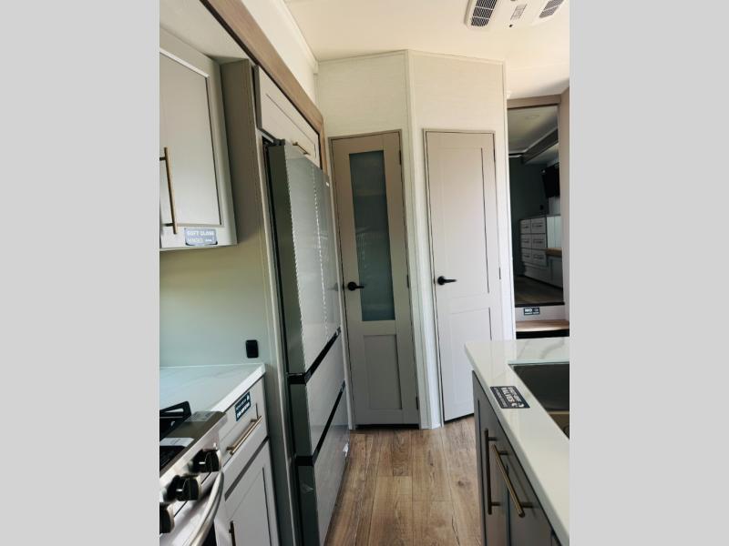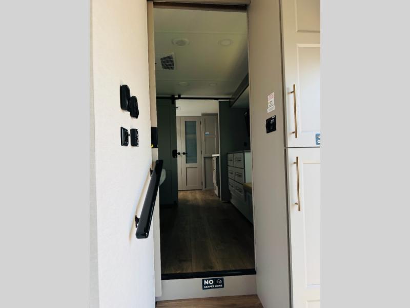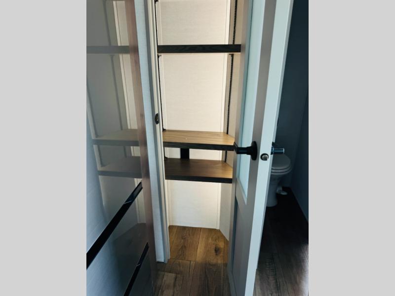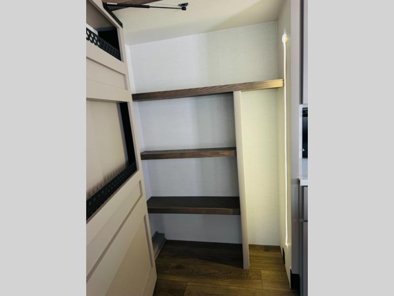 Whether you decide to be a full-timer or a long-trip traveler, this Paradigm offers so many comforts and conveniences you will love! The large full bathroom might be the reason you decide to be a new owner because you will have a large 61" x 30" shower to get cleaned up in, linen storage, and a walk-in closet with a hamper, shelves, and a space prepped for an optional washer/dryer. The bedroom allows you to sleep like a king and gives you extra floor space with the two slides, and there is storage in the flip-top dresser and under the seat, plus you can watch the Smart TV. The space saving sliding doors offer style as well. The cook will love all the residential appliances, including a residential refrigerator. The kitchen island gives you a large sink and dishwasher prep also. The half bath is super convenient just like the entry sitting bench/coat rack and closet. And you can relax on the sleeper sofa, dual recliner love seat, or swivel table and desk.