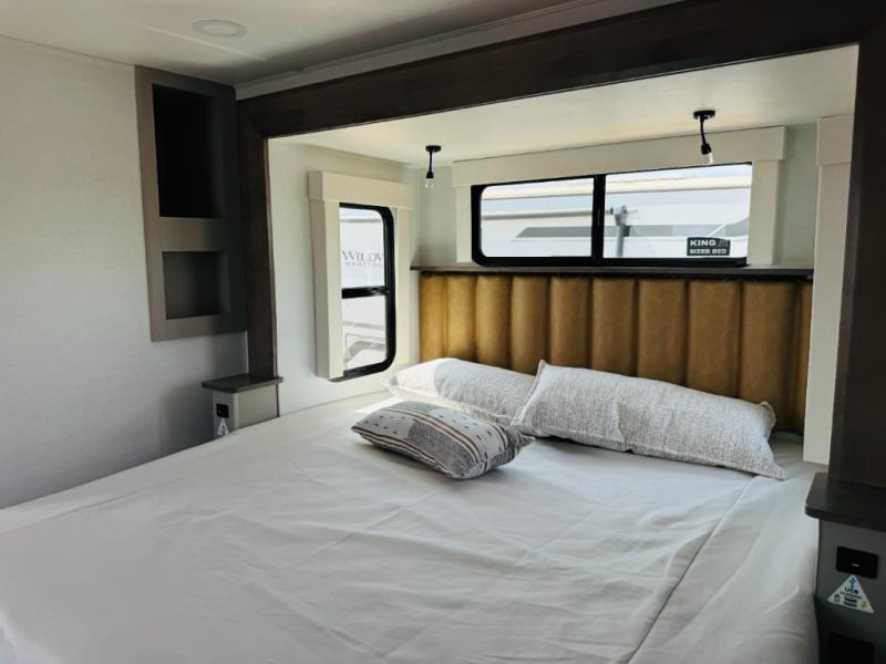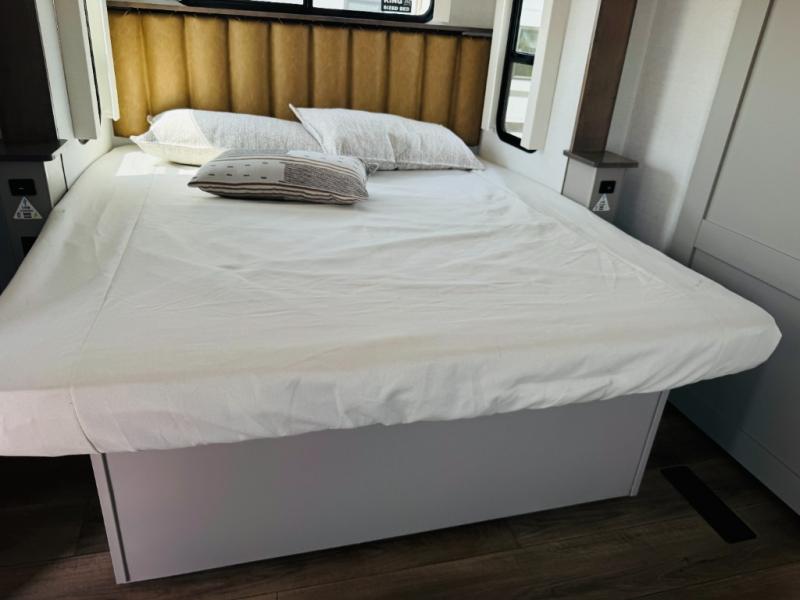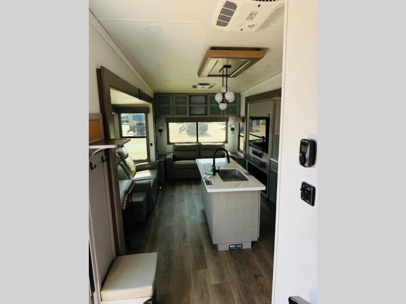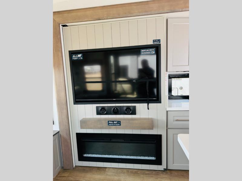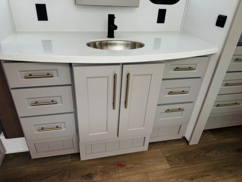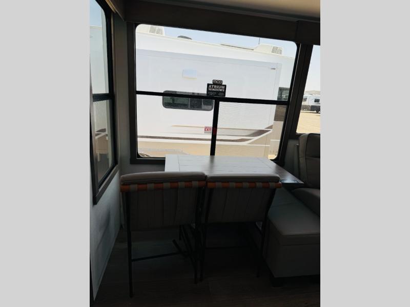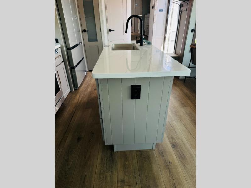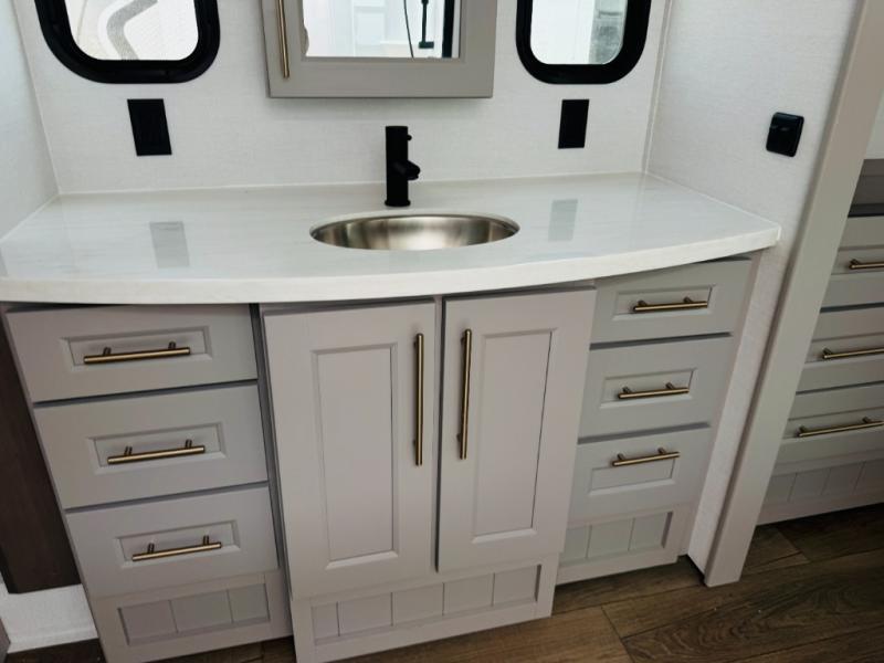 The Paradigm fifth wheels by Alliance RV are functional, high-quality, and luxurious for an unforgettable camping experience. There are three A/C units and a 40K BTU furnace to keep you comfortable year around, and you'll appreciate additional convenient amenities, like the all-in-one enclosed/heated utility center and the color coded and numbered wiring. A Rota-Flex pin box comes standard for hassle-free towing, along with Super-G 4,400 lb. rated tires and Dexter 7,000 lb. axles. You'll love the kitchen with its LG solid surface countertops and Lusso range, plus there is LED motion lighting in the pantry and a Maxx fan with a rain sensor to keep everything fresh when making dinner. Each model also includes an HD Smart TV in the living room and bedroom, plus a Winegard Air 360 antenna to keep you connected to the outside world. And of course there are a variety of options you can choose from to further customize your fifth wheel; dual pane windows, Super Solar Plus, slide out awning toppers, and generator prep or a generator to name a few!