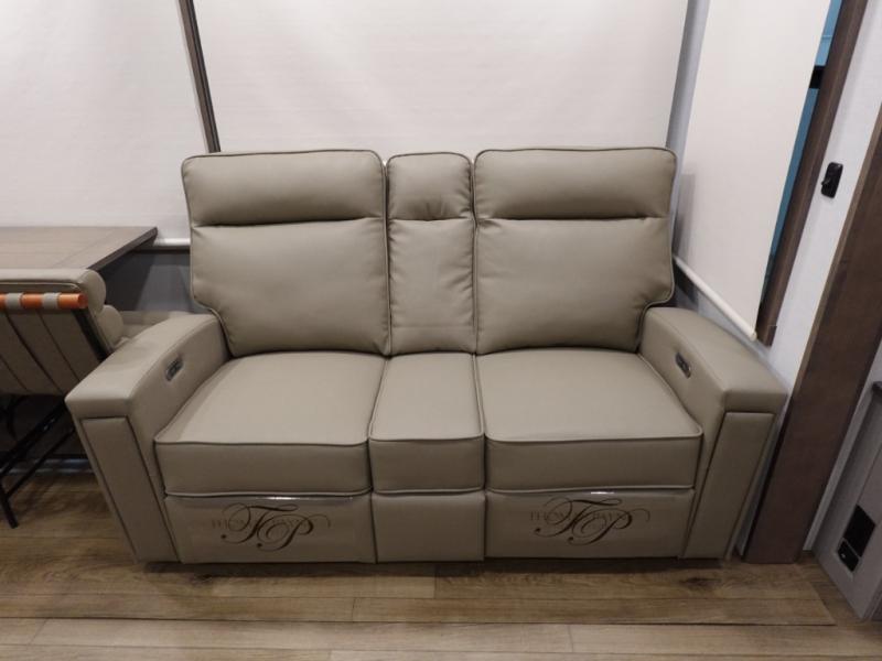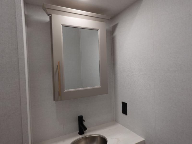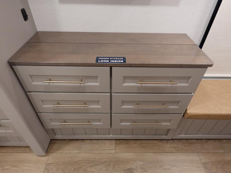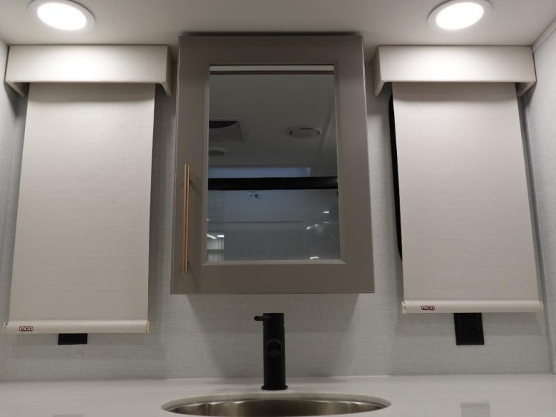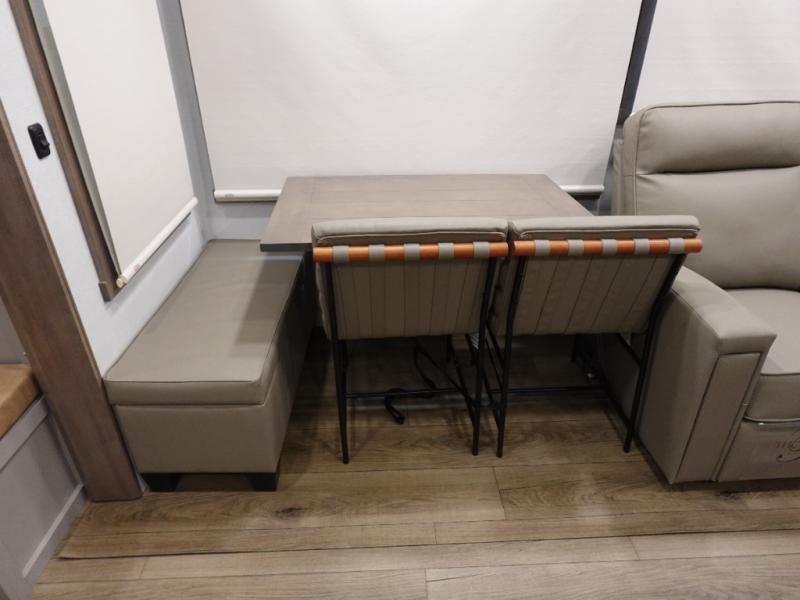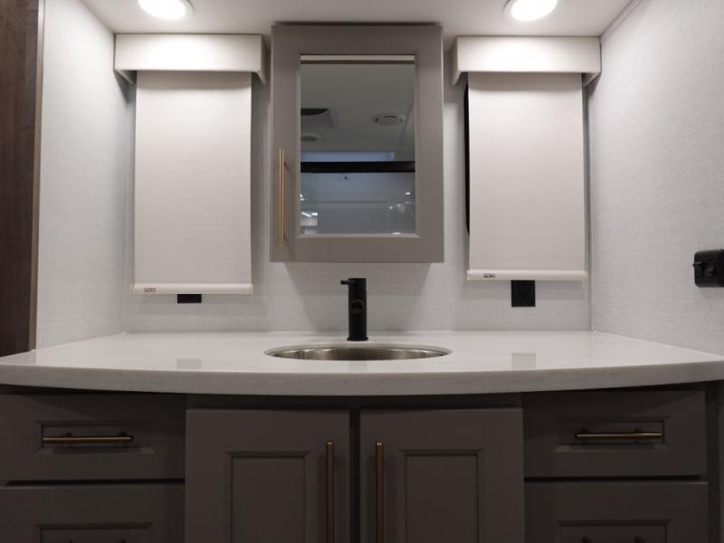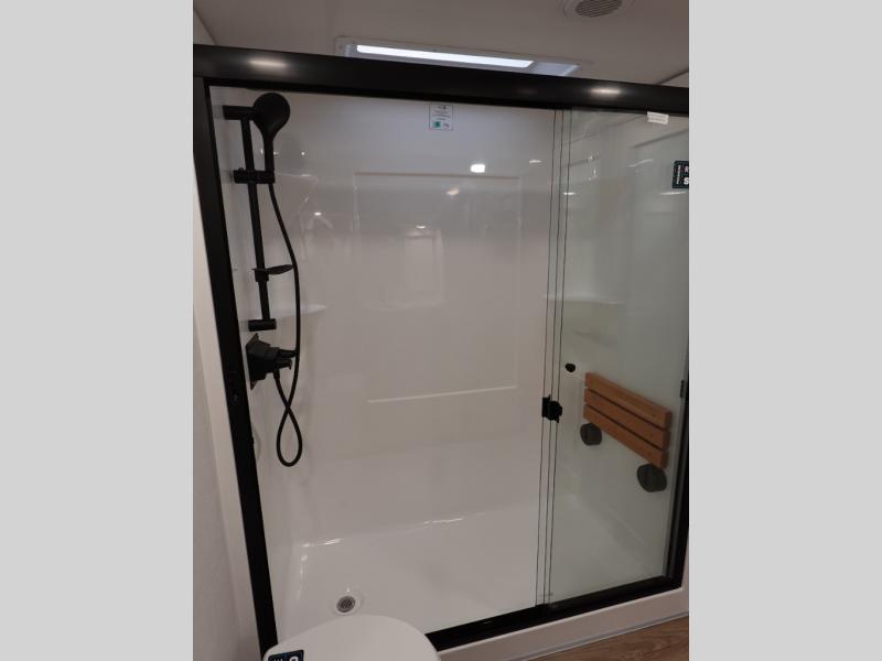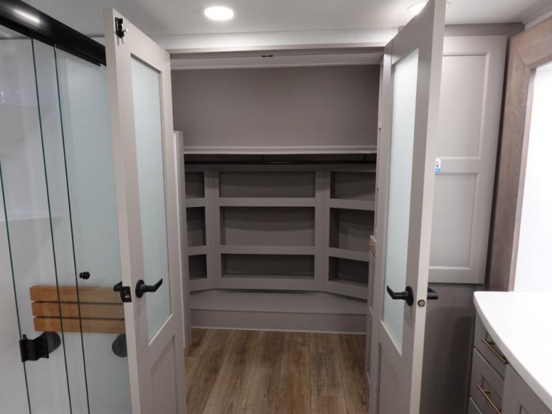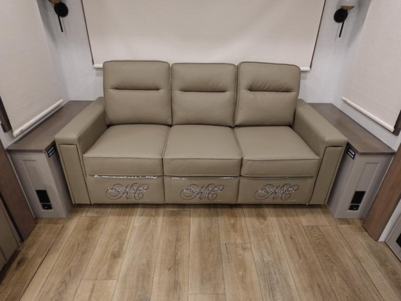 Whether you decide to be a full-timer or a long-trip traveler, this Paradigm offers so many comforts and conveniences you will love! The large full bathroom might be the reason you decide to be a new owner because you will have a large 61" x 30" shower to get cleaned up in, linen storage, and a walk-in closet with a hamper, shelves, and a space prepped for a\ washer/dryer. The bedroom allows you to sleep like a king and gives you extra floor space with the two slides, and there is storage in the flip-top dresser and under the seat, plus you can watch the Smart TV. The space saving sliding doors offer style as well. The cook will love all the residential appliances, including a residential refrigerator. The kitchen island gives you a large sink and dishwasher prep also. The half bath is super convenient just like the entry sitting bench/coat rack and closet. And you can relax on the sleeper sofa, dual recliner love seat, or swivel table and desk.