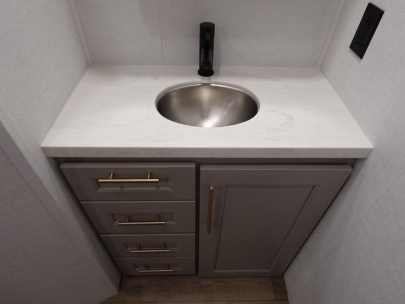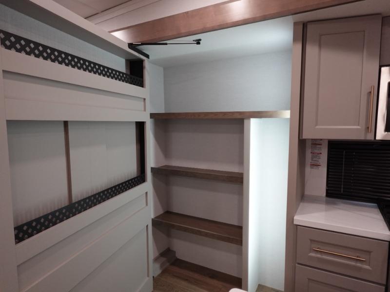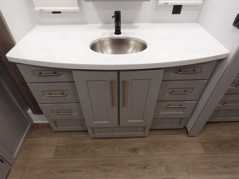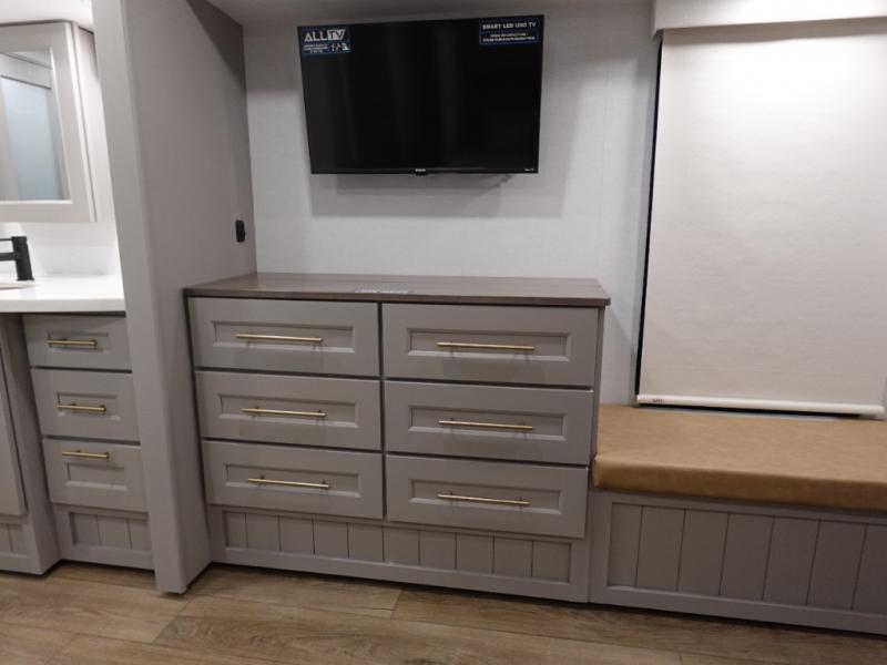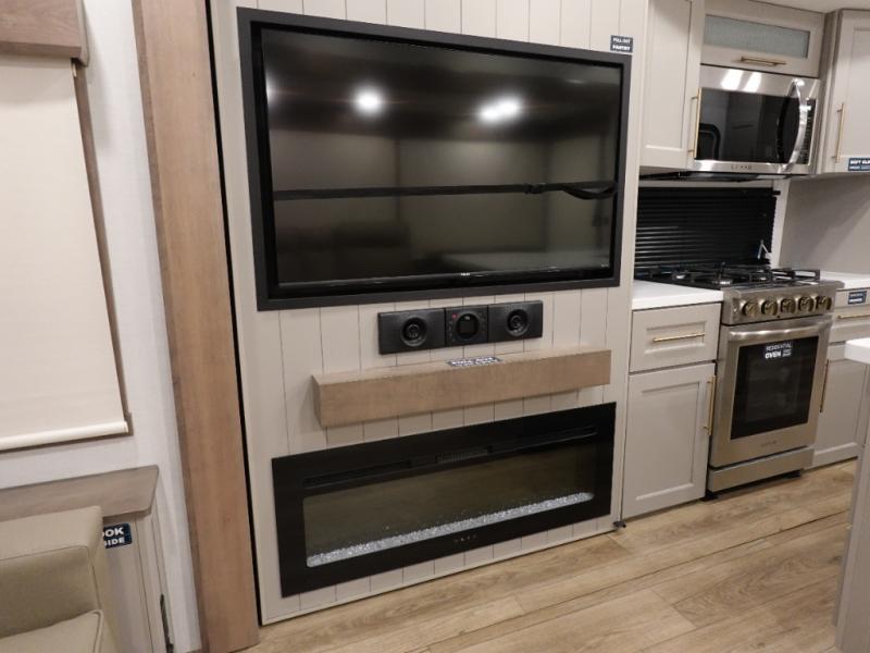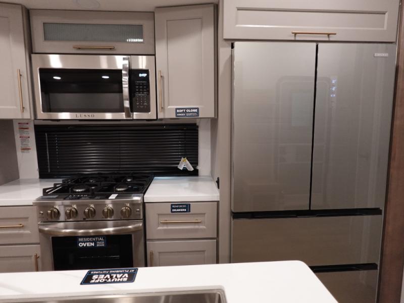 The Paradigm fifth wheels by Alliance RV are functional, high-quality, and luxurious for an unforgettable camping experience. There are three A/C units and a 40K BTU furnace to keep you comfortable year around, and you'll appreciate additional convenient amenities, like the all-in-one enclosed/heated utility center and the color coded and numbered wiring. A Rota-Flex pin box comes standard for hassle-free towing, along with Super-G 4,400 lb. rated tires and Dexter 7,000 lb. axles. You'll love the kitchen with its LG solid surface countertops and Lusso range, plus there is LED motion lighting in the pantry and a Maxx fan with a rain sensor to keep everything fresh when making dinner. Each model also includes an HD Smart TV in the living room and bedroom, plus a Winegard Air 360 antenna to keep you connected to the outside world.