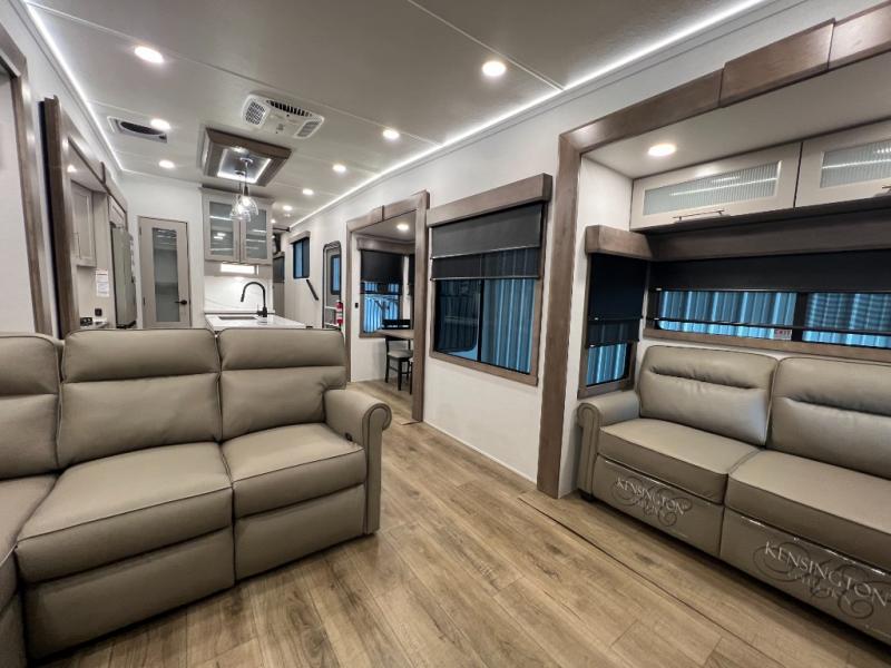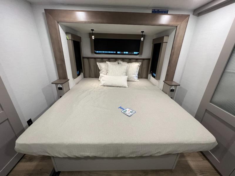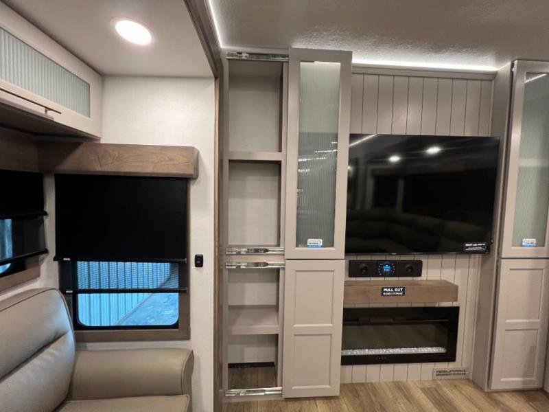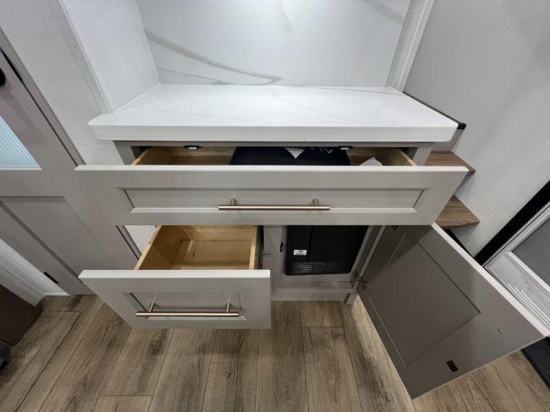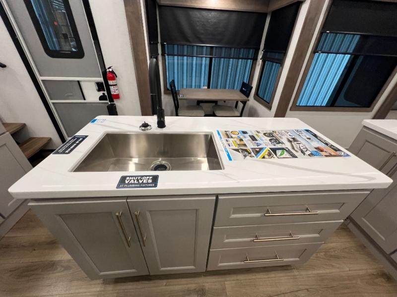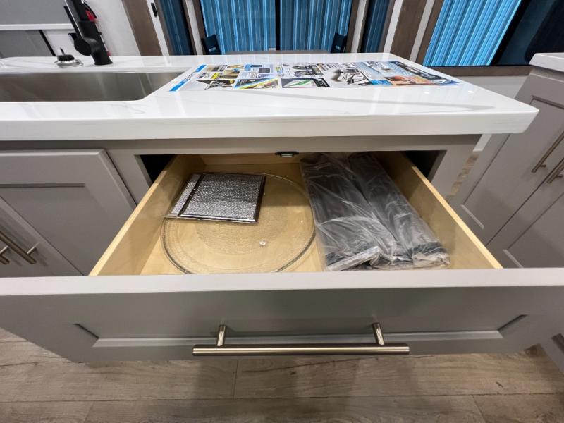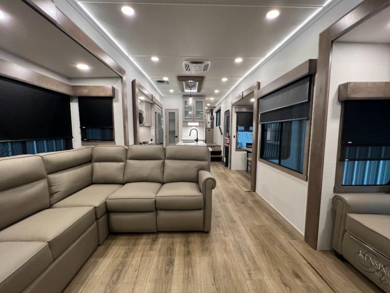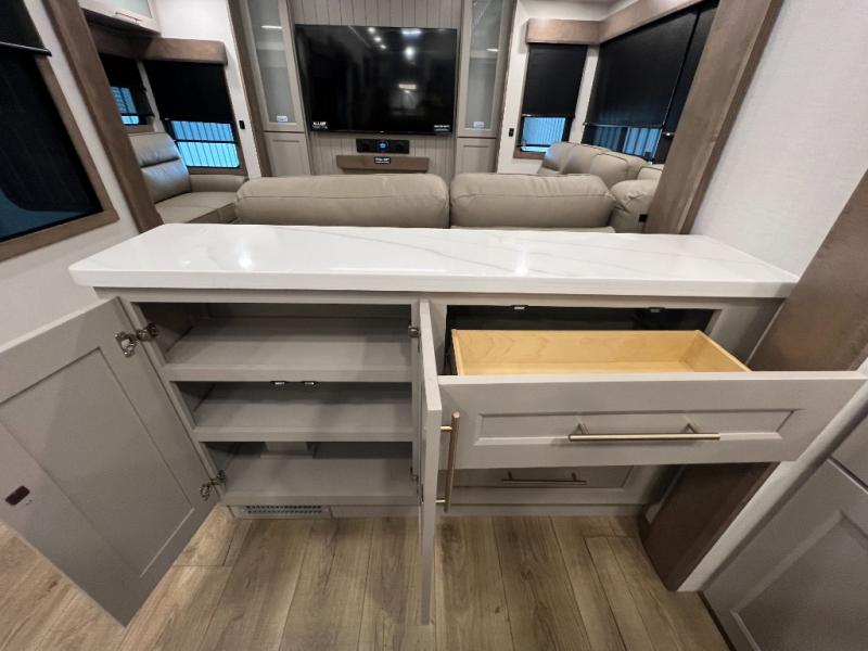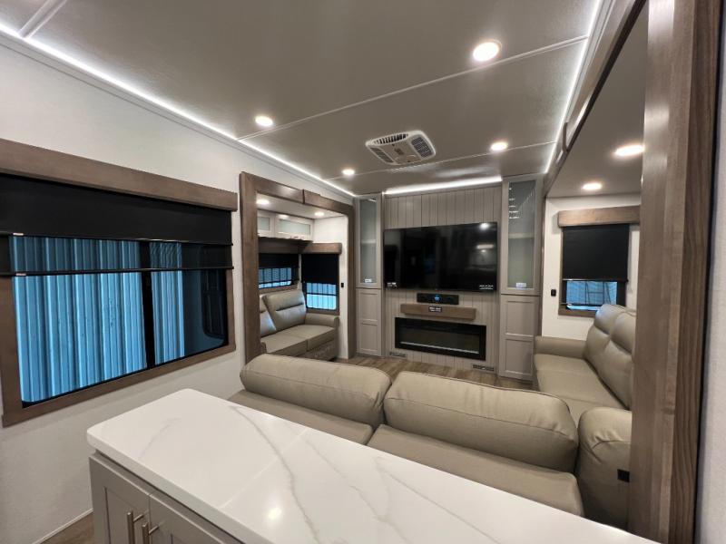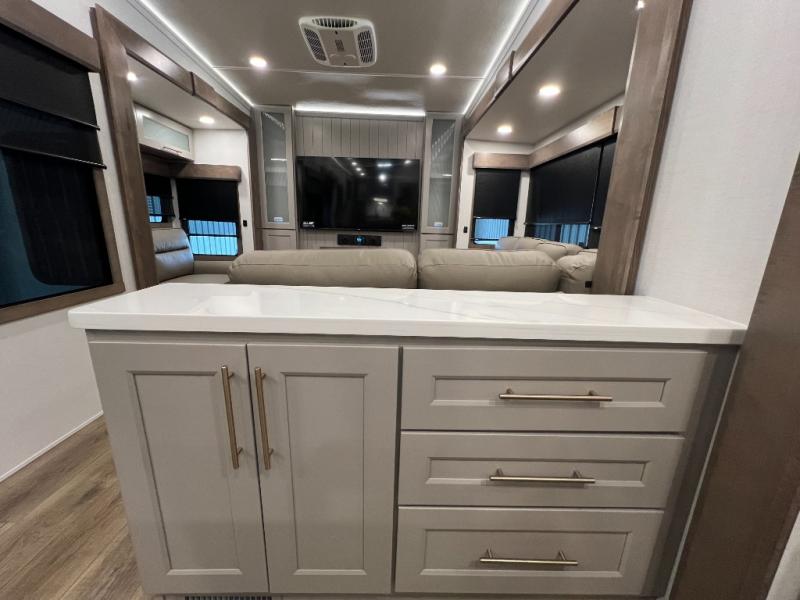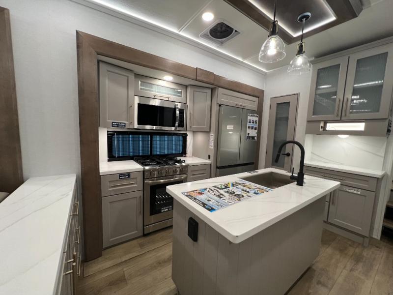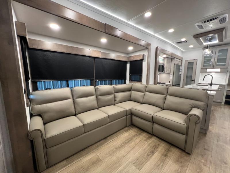 You'll love everything about this luxurious fifth wheel! There are five slide outs so you can enjoy more space than ever, and the rear living area can double as a den for guest. They can sleep on the sleeper sofa or second sofa with overhead storage, and there is a dual recliner across from the 65" Smart TV. The middle kitchen includes a kitchen island with dishwasher prep, generous counter space, a pantry and hutch for storage, and a swivel table and desk to dine or work at! This model also includes a spacious full bath with a large 61" x 30" shower for all-around comfort plus a front private bedroom with a king bed slide out. There is also a walk-in closet with washer and dryer prep, a flip top dresser with a Smart TV, and a seat with storage to keep everything tidy!