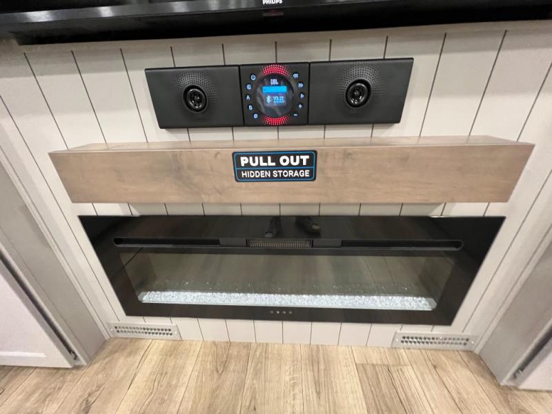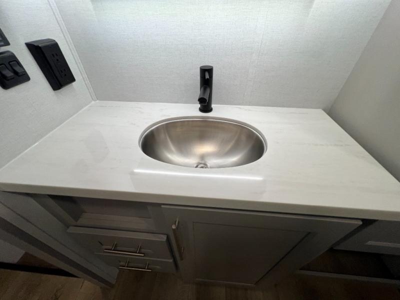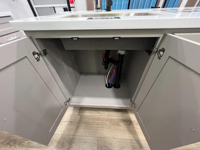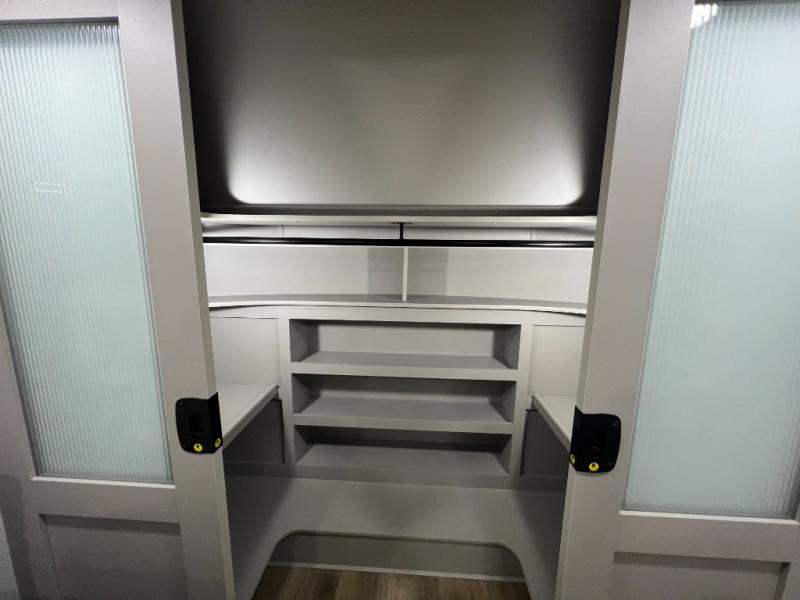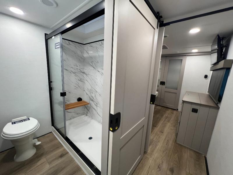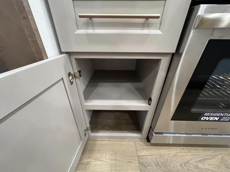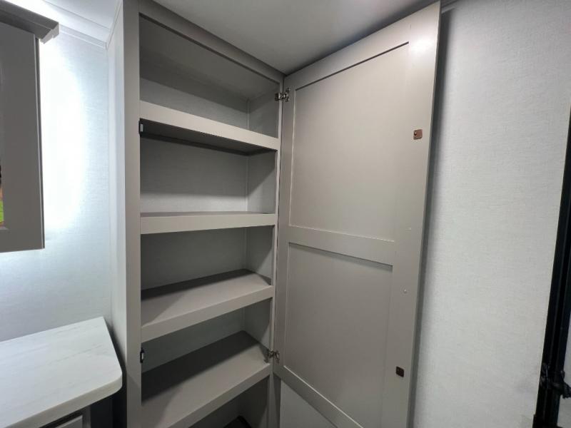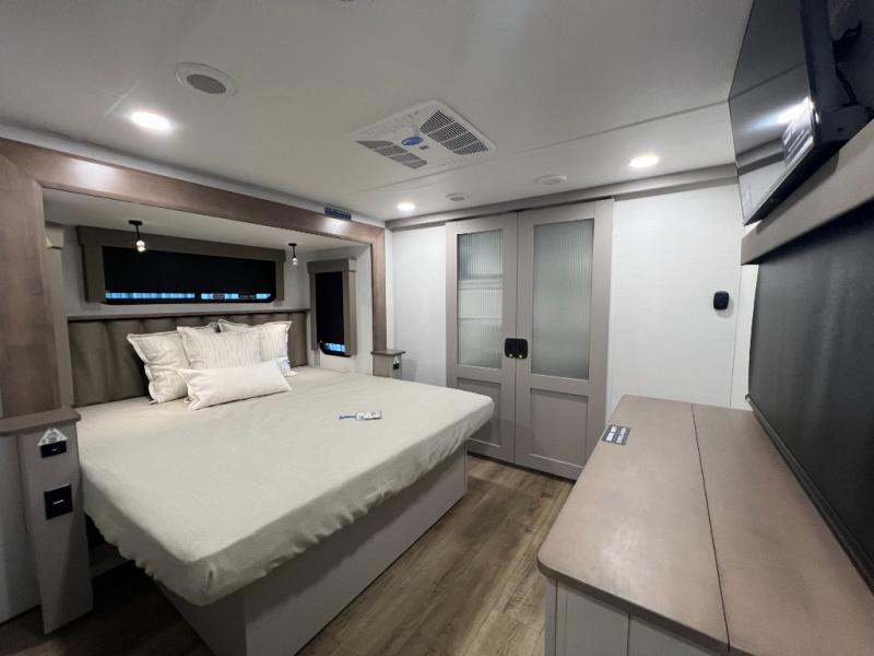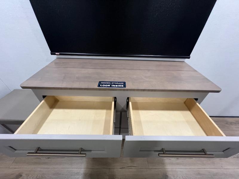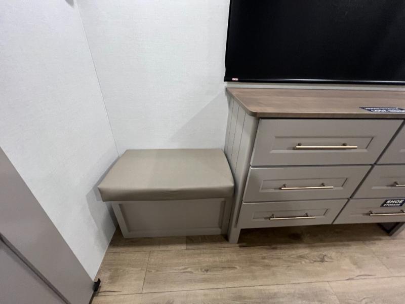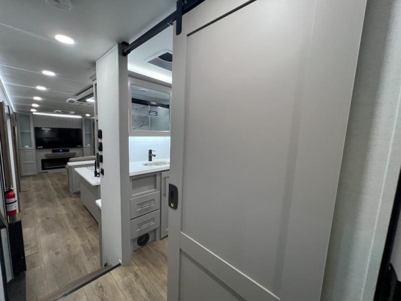 You'll love everything about this luxurious fifth wheel! There are five slide outs so you can enjoy more space than ever, and the rear living area can double as a den for guest. They can sleep on the sleeper sofa or second sofa with overhead storage, and there is a dual recliner across from the 65" Smart TV. The middle kitchen includes a kitchen island with dishwasher prep, generous counter space, a pantry and hutch for storage, and a swivel table and desk to dine or work at! This model also includes a spacious full bath with a large 61" x 30" shower for all-around comfort plus a front private bedroom with a king bed slide out. There is also a walk-in closet with washer and dryer prep, a flip top dresser with a Smart TV, and a seat with storage to keep everything tidy!