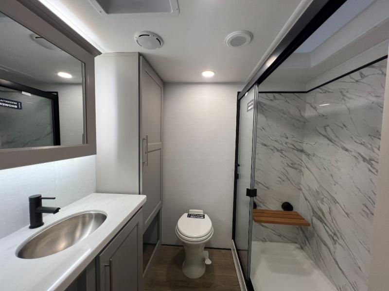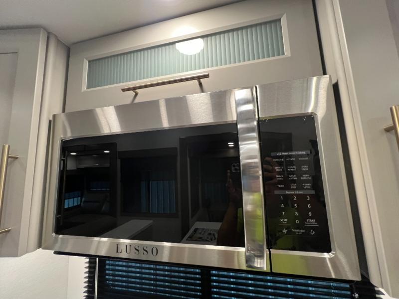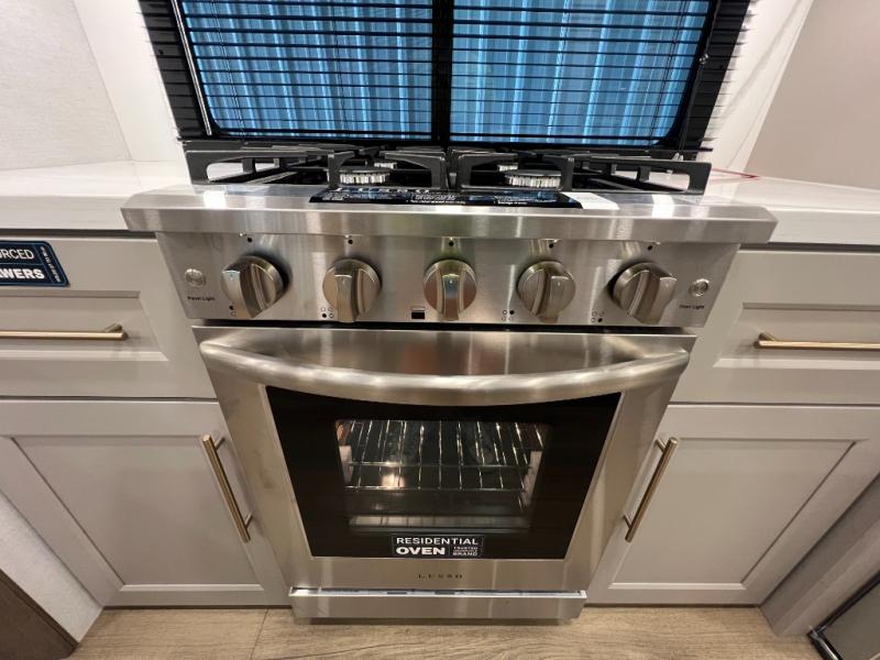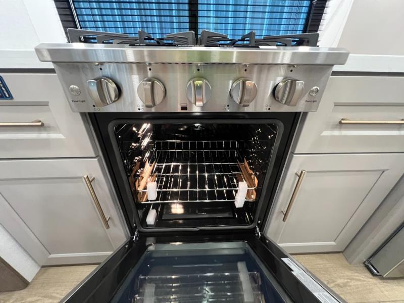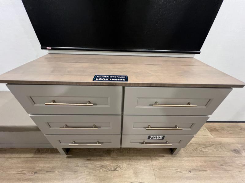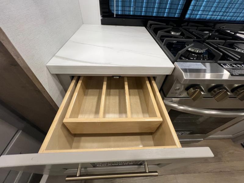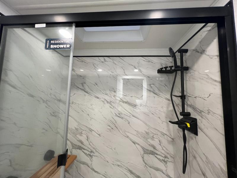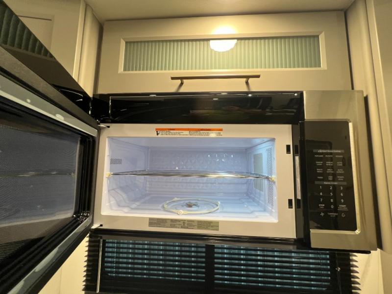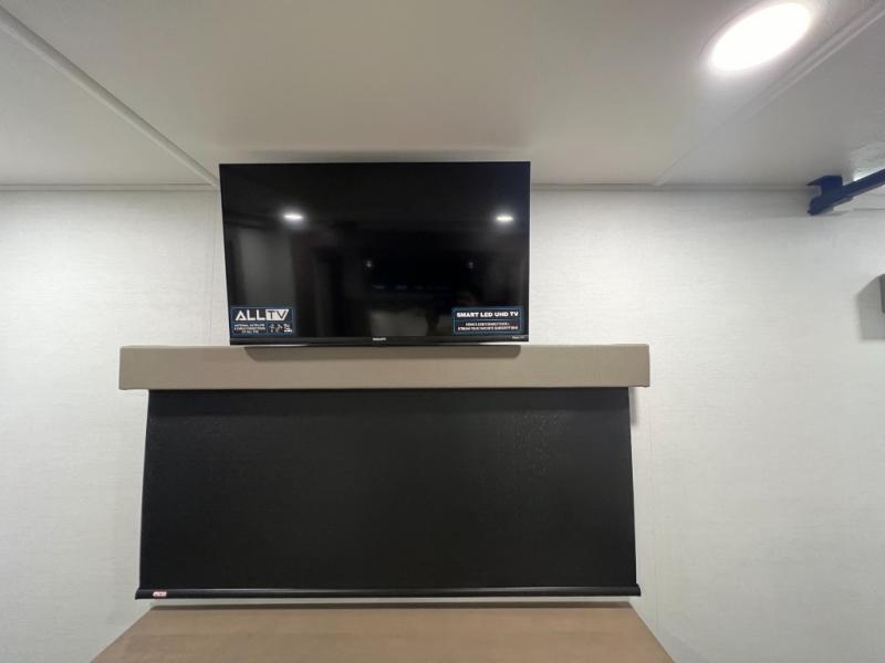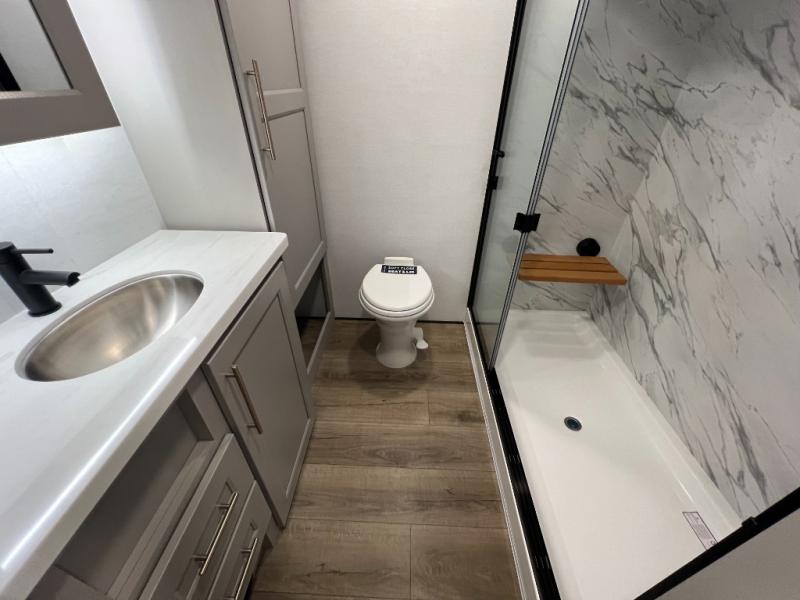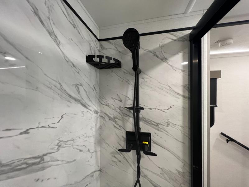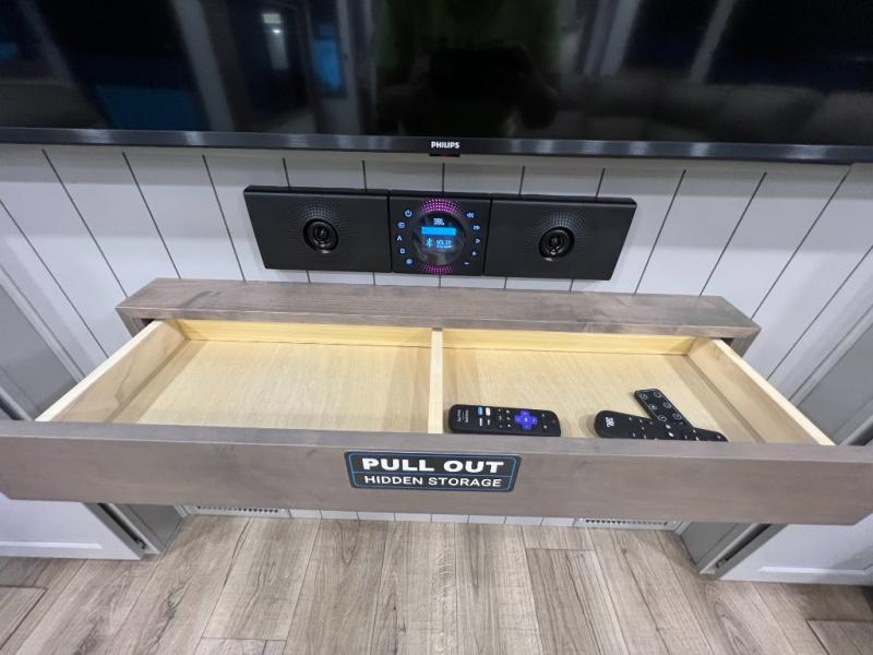 You'll love everything about this luxurious fifth wheel! There are five slide outs so you can enjoy more space than ever, and the rear living area can double as a den for guest. They can sleep on the sleeper sofa or second sofa with overhead storage, and there is a dual recliner across from the 65" Smart TV. The middle kitchen includes a kitchen island with dishwasher prep, generous counter space, a pantry and hutch for storage, and a swivel table and desk to dine or work at! This model also includes a spacious full bath with a large 61" x 30" shower for all-around comfort plus a front private bedroom with a king bed slide out. There is also a walk-in closet with washer and dryer prep, a flip top dresser with a Smart TV, and a seat with storage to keep everything tidy!