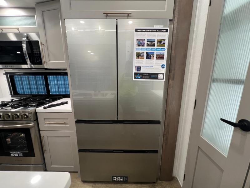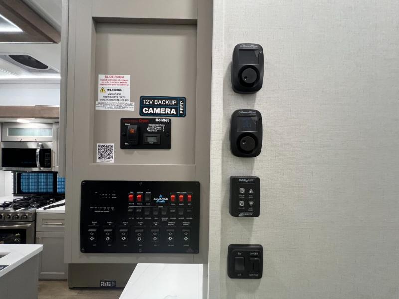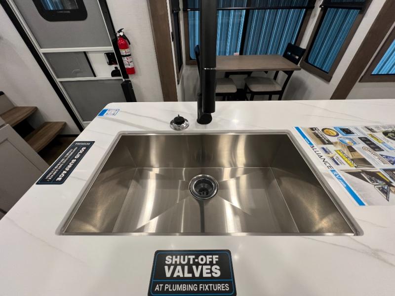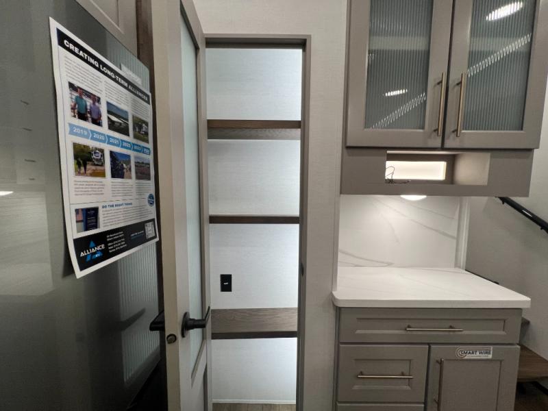 The Paradigm fifth wheels by Alliance RV are functional, high-quality, and luxurious for an unforgettable camping experience. There are three A/C units and a 40K BTU furnace to keep you comfortable year around, and you'll appreciate additional convenient amenities, like the all-in-one enclosed/heated utility center and the color coded and numbered wiring. A Rota-Flex pin box comes standard for hassle-free towing, along with Super-G 4,400 lb. rated tires and Dexter 7,000 lb. axles. You'll love the kitchen with its LG solid surface countertops and Lusso range, plus there is LED motion lighting in the pantry and a Maxx fan with a rain sensor to keep everything fresh when making dinner. Each model also includes an HD Smart TV in the living room and bedroom, plus a Winegard Air 360 antenna to keep you connected to the outside world. And of course there are a variety of options you can choose from to further customize your fifth wheel; dual pane windows, Super Solar Plus, slide out awning toppers, and generator prep or a generator to name a few!