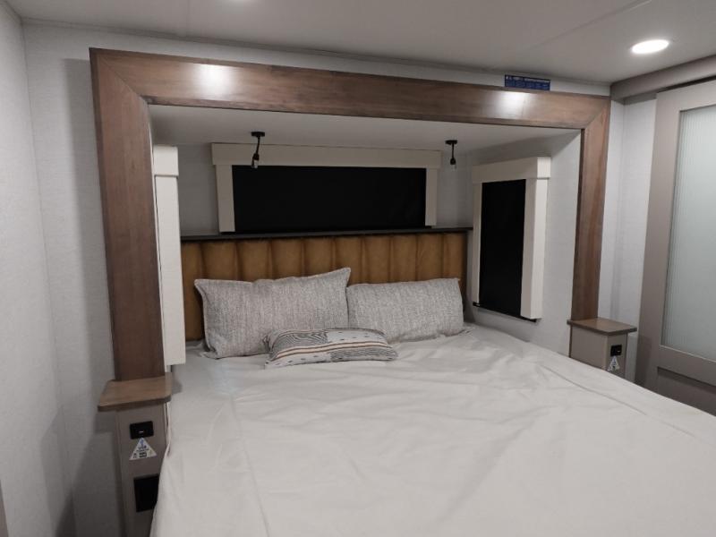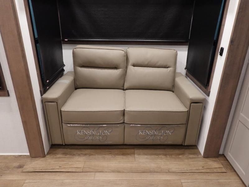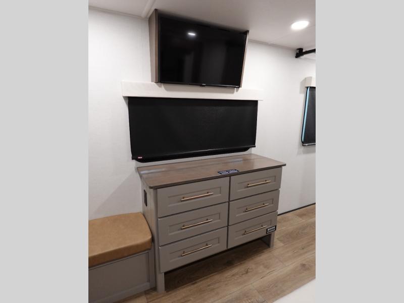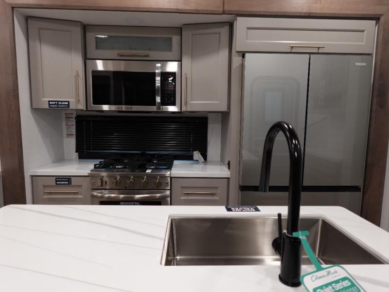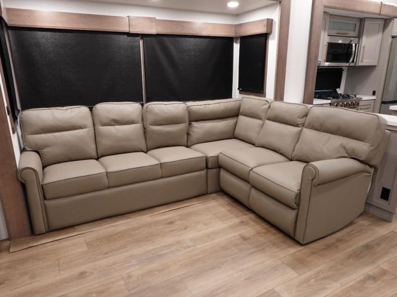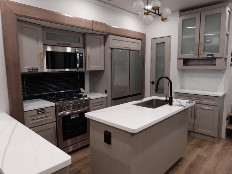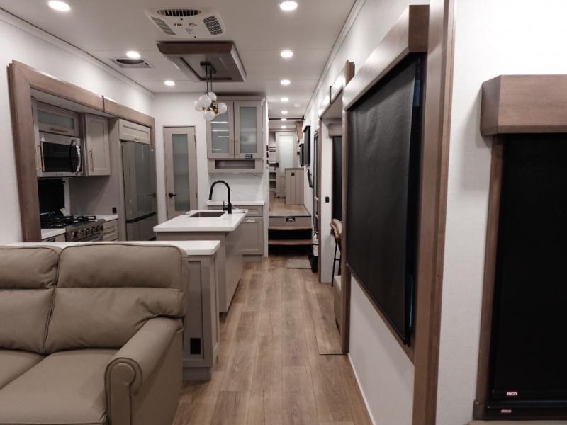 You'll love everything about this luxurious fifth wheel! There are five slide outs so you can enjoy more space than ever, and the rear living area can double as a den for guest. They can sleep on the sleeper sofa or second sofa with overhead storage, and there is a dual recliner across from the 65" Smart TV. The middle kitchen includes a kitchen island with dishwasher prep, generous counter space, a pantry and hutch for storage, and a swivel table and desk to dine or work at! This model also includes a spacious full bath with a large 61" x 30" shower for all-around comfort plus a front private bedroom with a king bed slide out. There is also a walk-in closet with washer and dryer prep, a flip top dresser with a Smart TV, and a seat with storage to keep everything tidy!