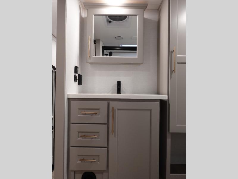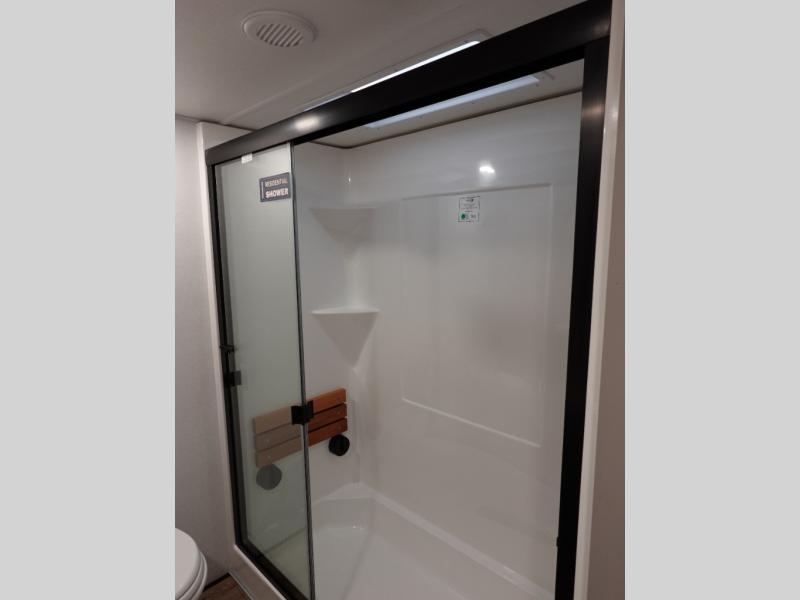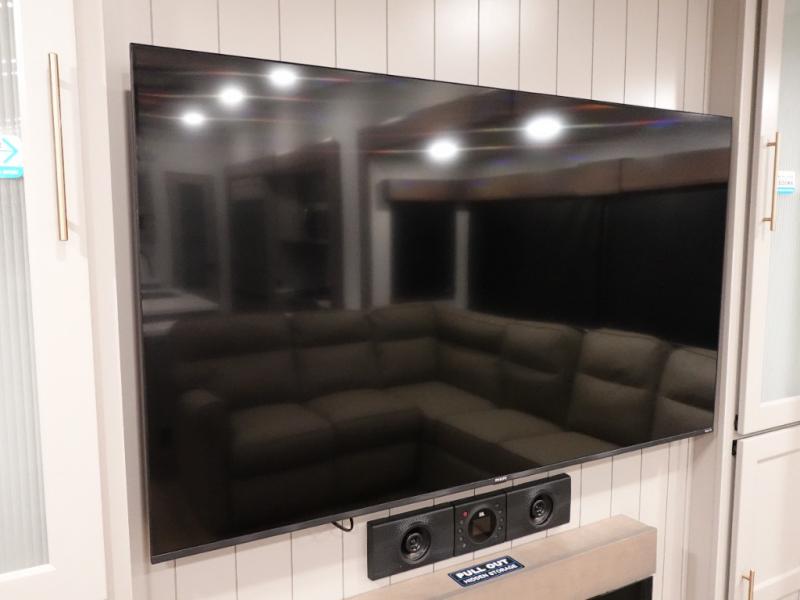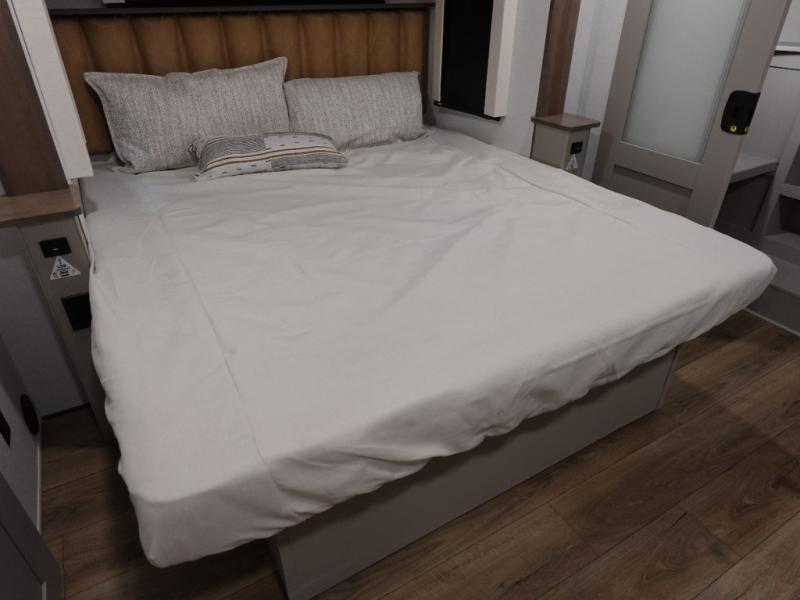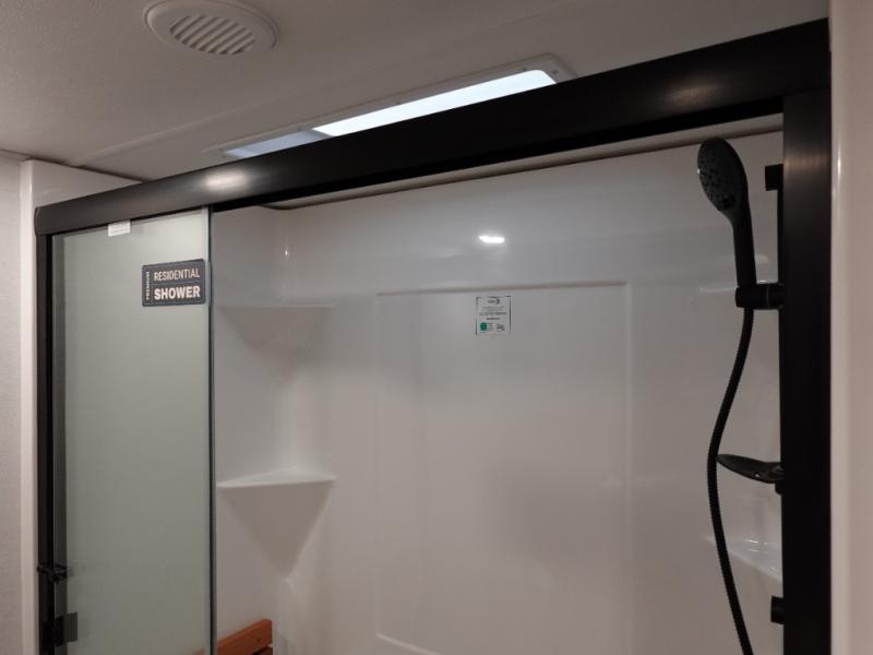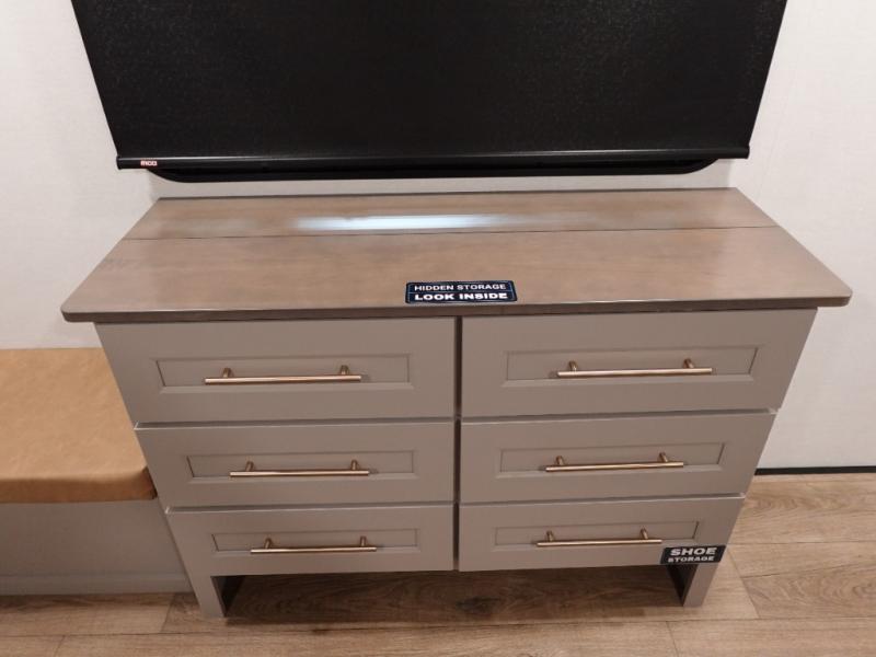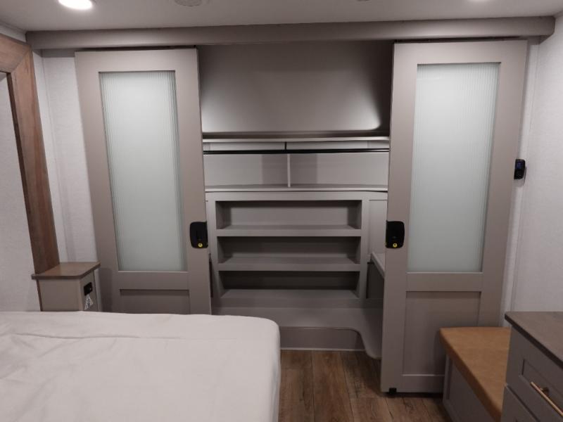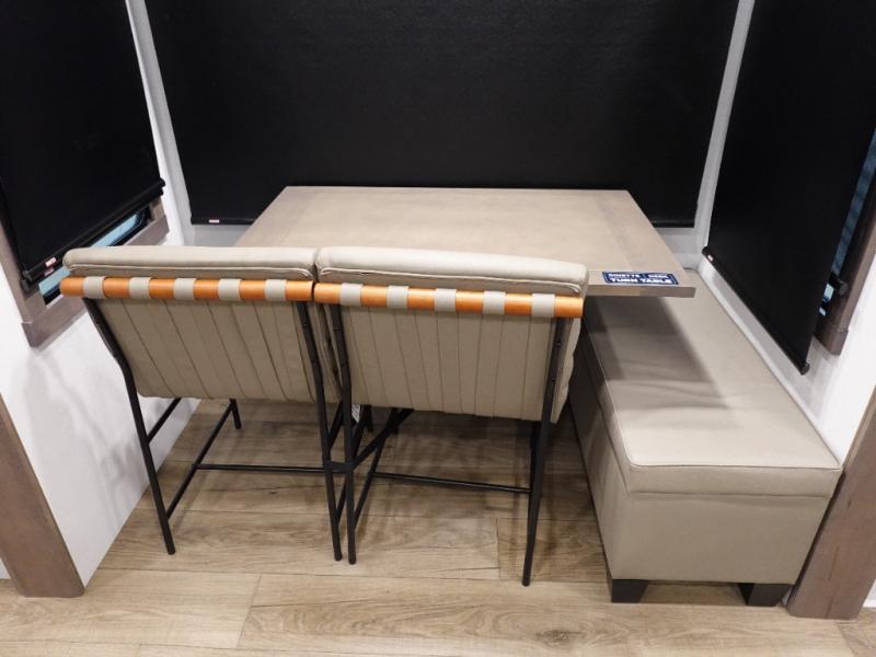You'll love everything about this luxurious fifth wheel! There are five slide outs so you can enjoy more space than ever, and the rear living area can double as a den for guest. They can sleep on the sleeper sofa or second sofa with overhead storage, and there is a dual recliner across from the 65" Smart TV. The middle kitchen includes a kitchen island with dishwasher prep, generous counter space, a pantry and hutch for storage, and a swivel table and desk to dine or work at! This model also includes a spacious full bath with a large 61" x 30" shower for all-around comfort plus a front private bedroom with a king bed slide out. There is also a walk-in closet with washer and dryer prep, a flip top dresser with a Smart TV, and a seat with storage to keep everything tidy!