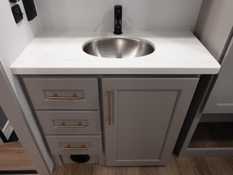 The Paradigm fifth wheels by Alliance RV are functional, high-quality, and luxurious for an unforgettable camping experience. There are three A/C units and a 40K BTU furnace to keep you comfortable year around, and you'll appreciate additional convenient amenities, like the all-in-one enclosed/heated utility center and the color coded and numbered wiring. A Rota-Flex pin box comes standard for hassle-free towing, along with Super-G 4,400 lb. rated tires and Dexter 7,000 lb. axles. You'll love the kitchen with its LG solid surface countertops and Lusso range, plus there is LED motion lighting in the pantry and a Maxx fan with a rain sensor to keep everything fresh when making dinner. Each model also includes an HD Smart TV in the living room and bedroom, plus a Winegard Air 360 antenna to keep you connected to the outside world.