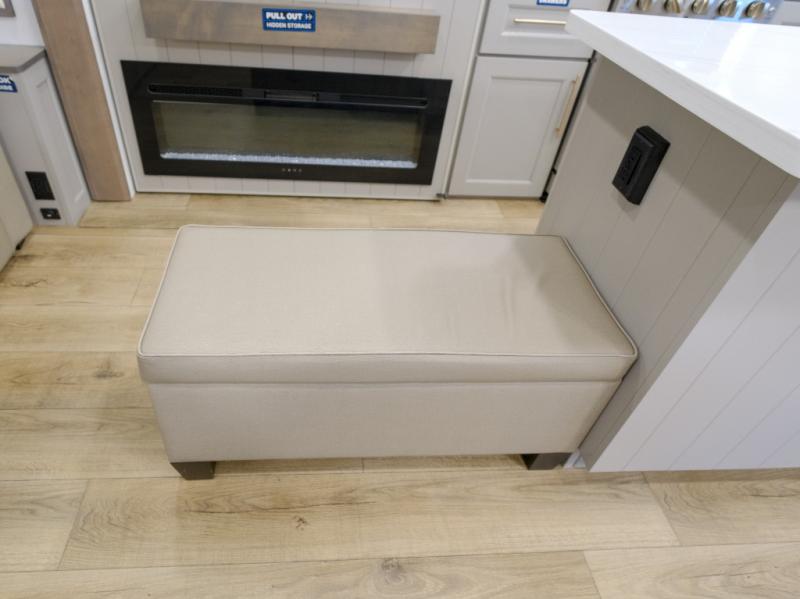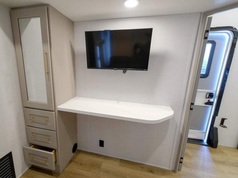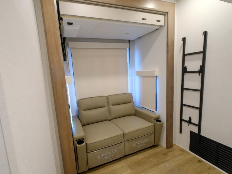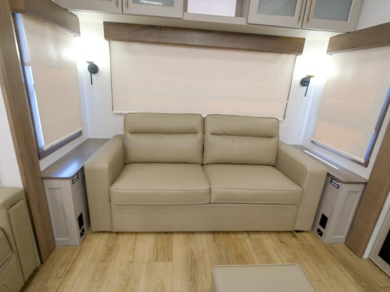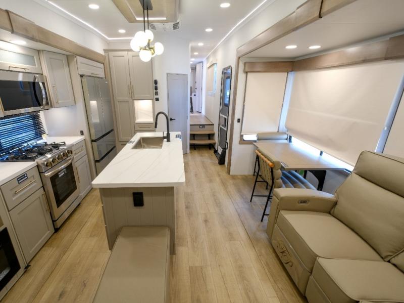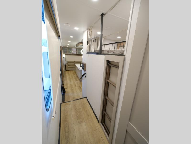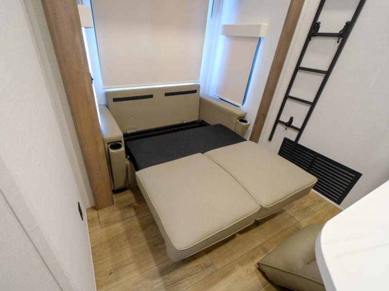 Looking to work while traveling, or prefer to have a guest room when friends and family stay overnight? This fifth wheel might just be the answer thanks to the versatile room in the center of this fifth wheel which includes a sleeper sofa slide and a desk. You will also find a loft above this space with a ladder located in the hall just up the steps leading to the front private bedroom and bath. The full bathroom features a 48" x 30" shower, toilet, and vanity with sink, plus double sliding doors making it accessible from the hall or from the front private master. The master bedroom offers a king bed slide, a large front wardrobe and a flip-top dresser for your clothes with a Smart TV above. Everyone can gather in the main living and kitchen area that offers residential appliances with a kitchen island that includes dishwasher prep and a large sink. There is also a pantry for snacks, plus hidden pantry storage behind the TV, a dual recliner loveseat, and sleeper sofa along the rear wall.