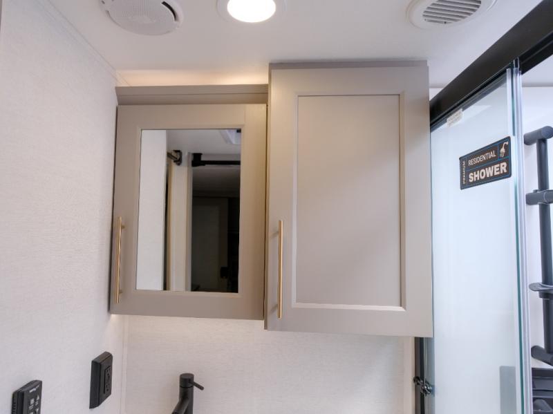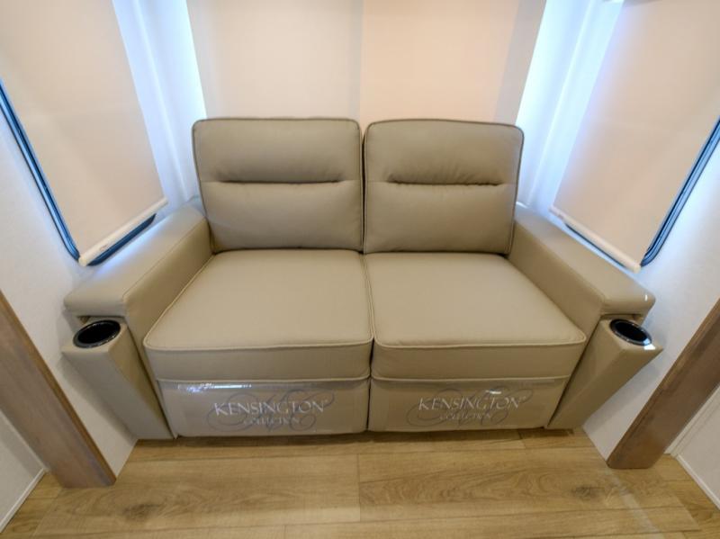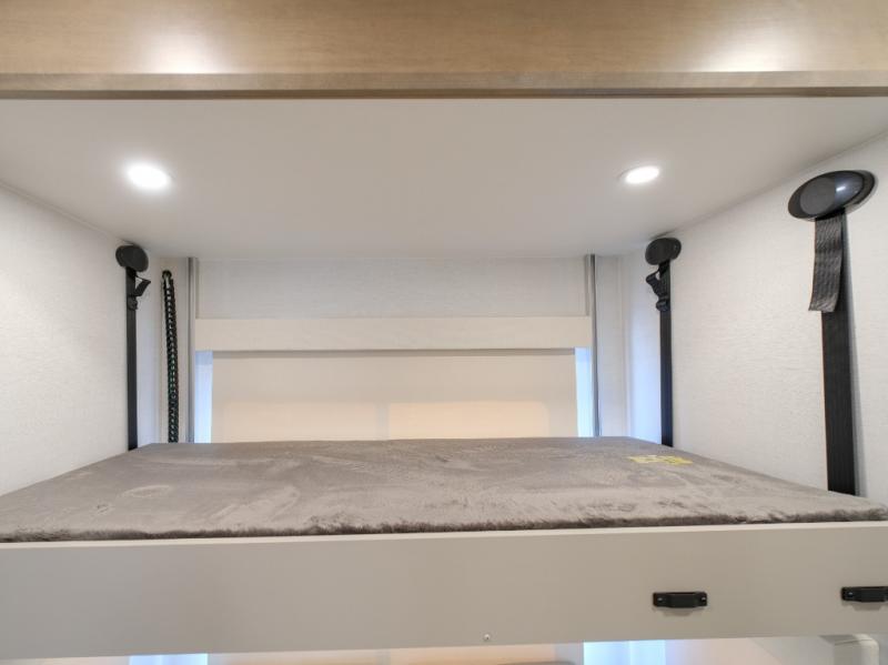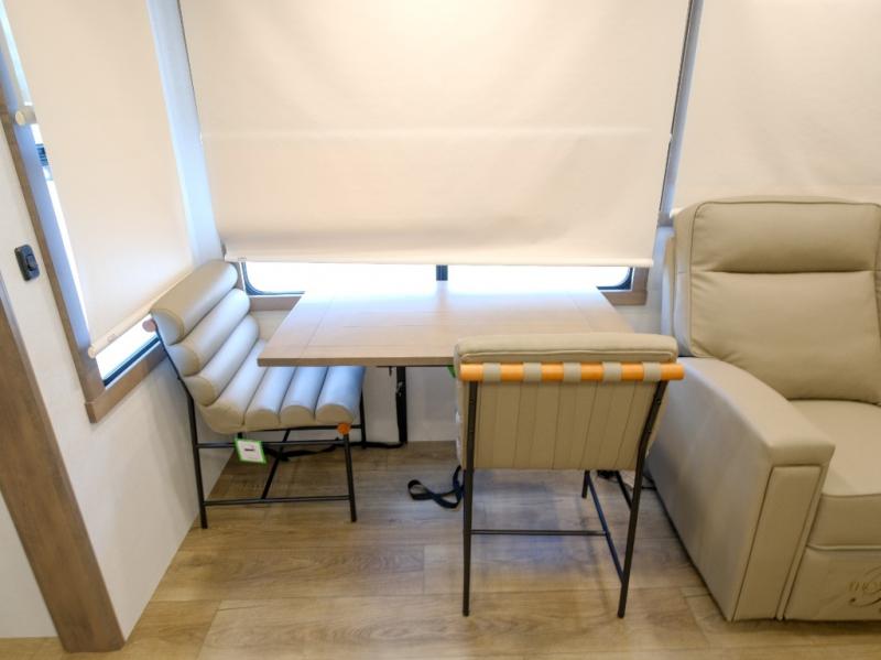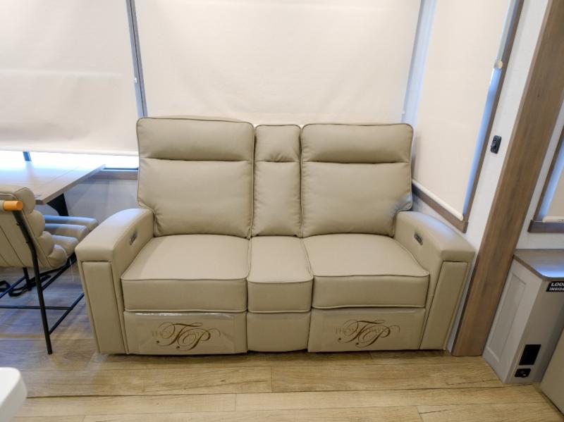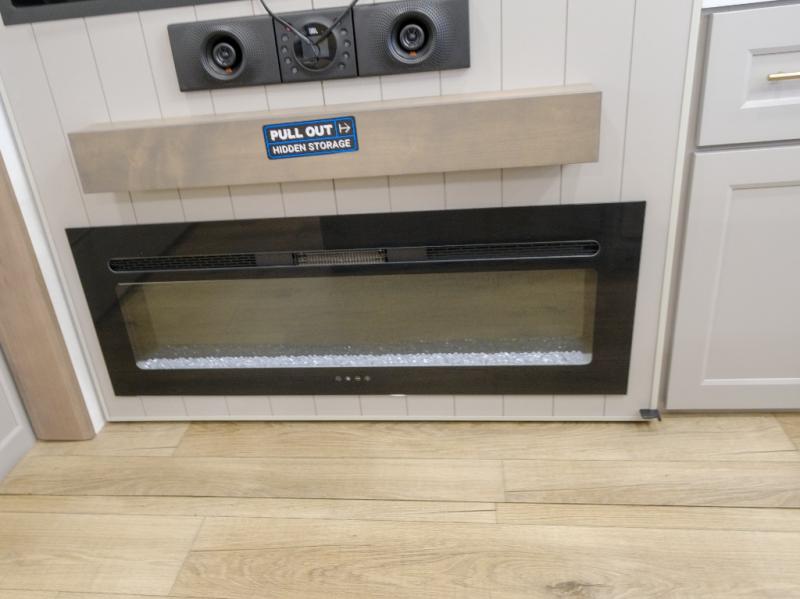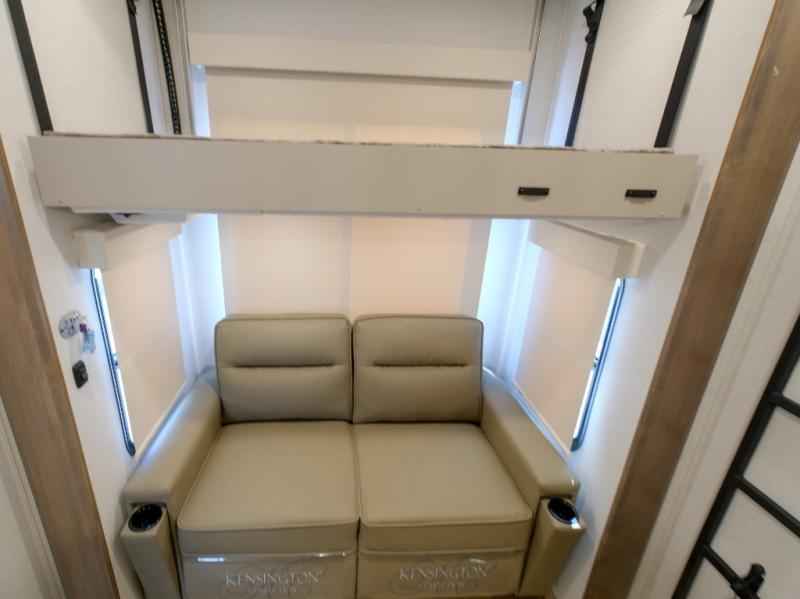 Looking to work while traveling, or prefer to have a guest room when friends and family stay overnight? This fifth wheel might just be the answer thanks to the versatile room in the center of this fifth wheel which includes a sleeper sofa slide and a desk. You will also find a loft above this space with a ladder located in the hall just up the steps leading to the front private bedroom and bath. The full bathroom features a 48" x 30" shower, toilet, and vanity with sink, plus double sliding doors making it accessible from the hall or from the front private master. The master bedroom offers a king bed slide, a large front wardrobe and a flip-top dresser for your clothes with a Smart TV above. Everyone can gather in the main living and kitchen area that offers residential appliances with a kitchen island that includes dishwasher prep and a large sink. There is also a pantry for snacks, plus hidden pantry storage behind the TV, a dual recliner loveseat, and sleeper sofa along the rear wall.