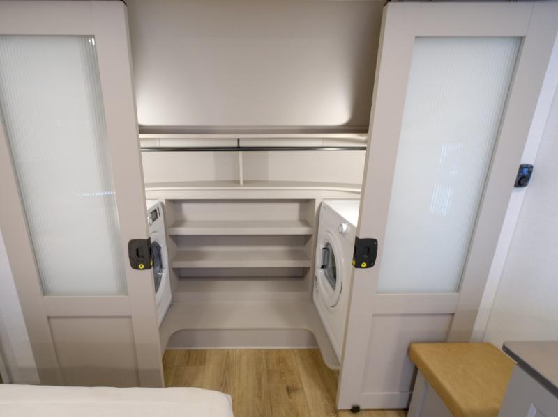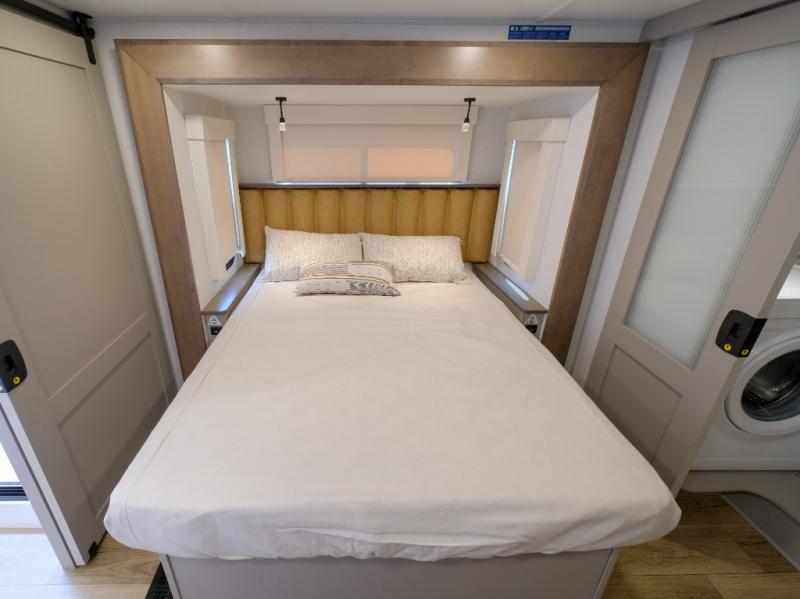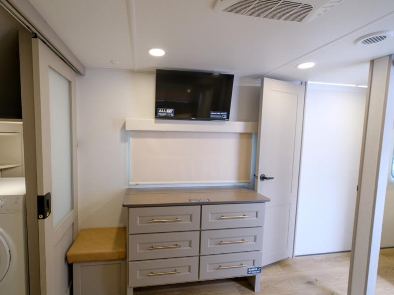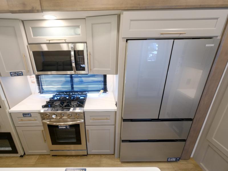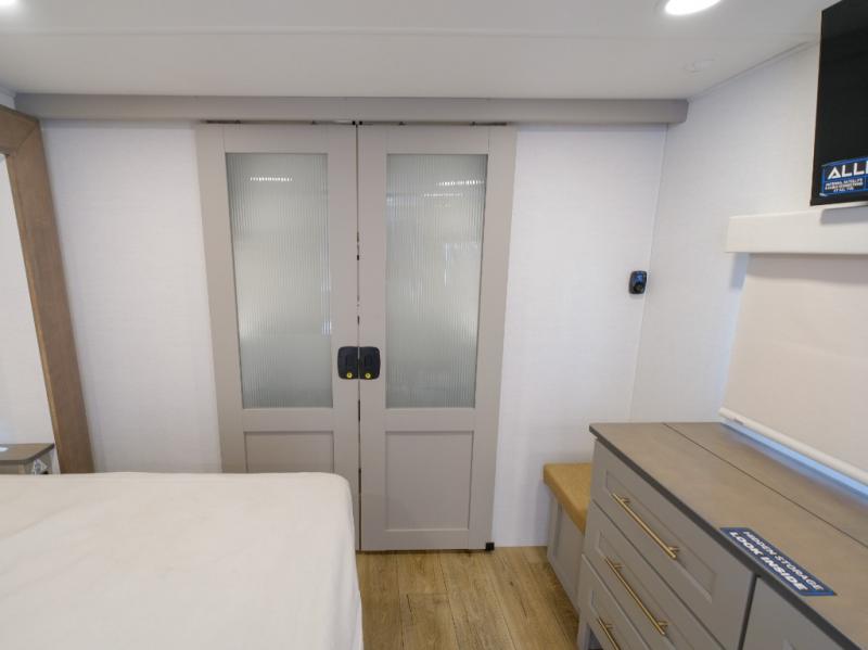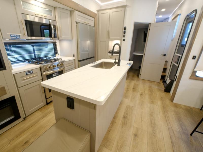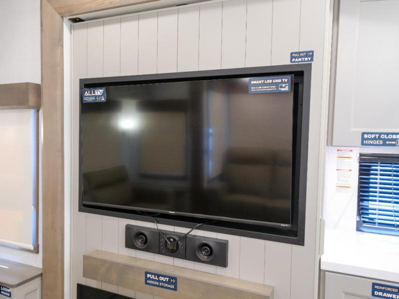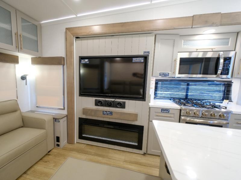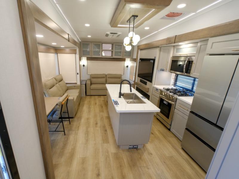The Paradigm fifth wheels by Alliance RV are functional, high-quality, and luxurious for an unforgettable camping experience. There are three A/C units and a 40K BTU furnace to keep you comfortable year around, and you'll appreciate additional convenient amenities, like the all-in-one enclosed/heated utility center and the color coded and numbered wiring. A Rota-Flex pin box comes standard for hassle-free towing, along with Super-G 4,400 lb. rated tires and Dexter 7,000 lb. axles. You'll love the kitchen with its LG solid surface countertops and Lusso range, plus there is LED motion lighting in the pantry and a Maxx fan with a rain sensor to keep everything fresh when making dinner. Each model also includes an HD Smart TV in the living room and bedroom, plus a Winegard Air 360 antenna to keep you connected to the outside world.