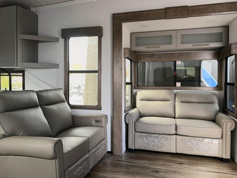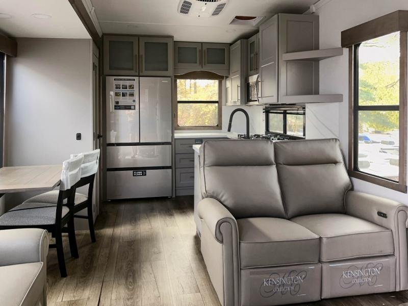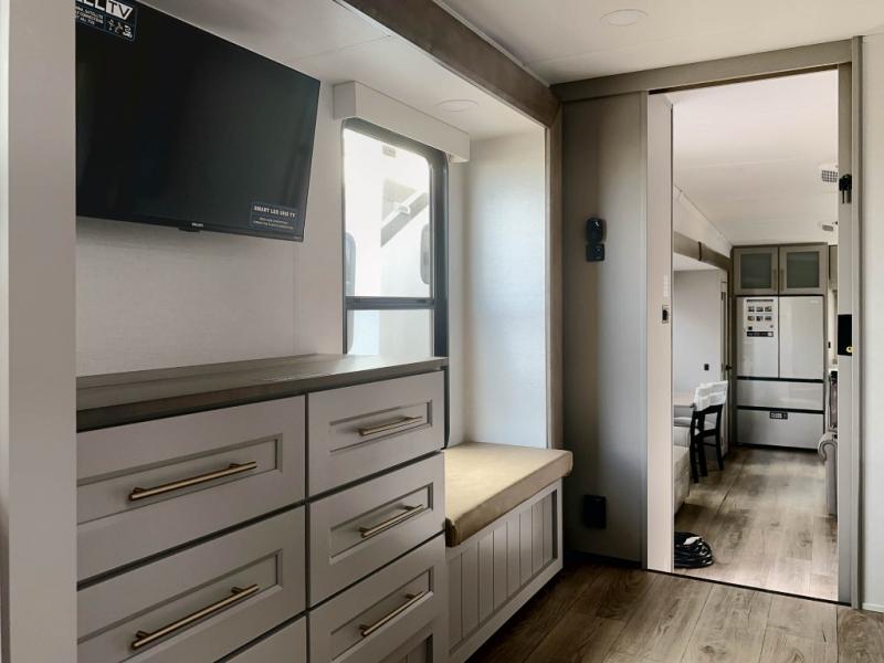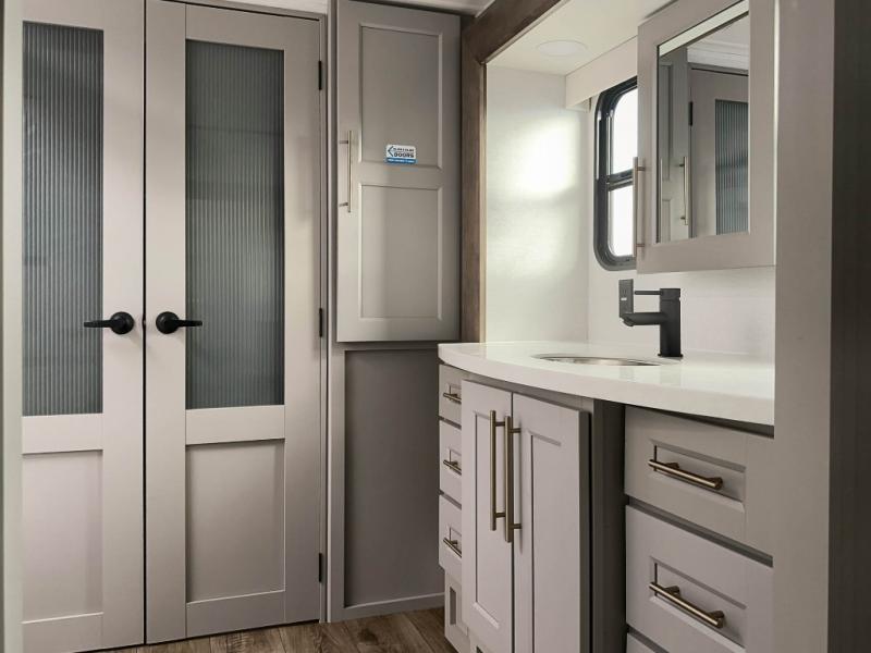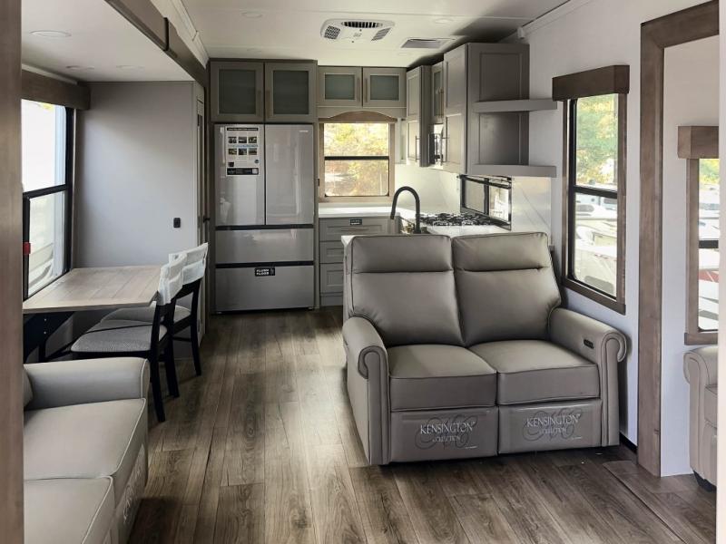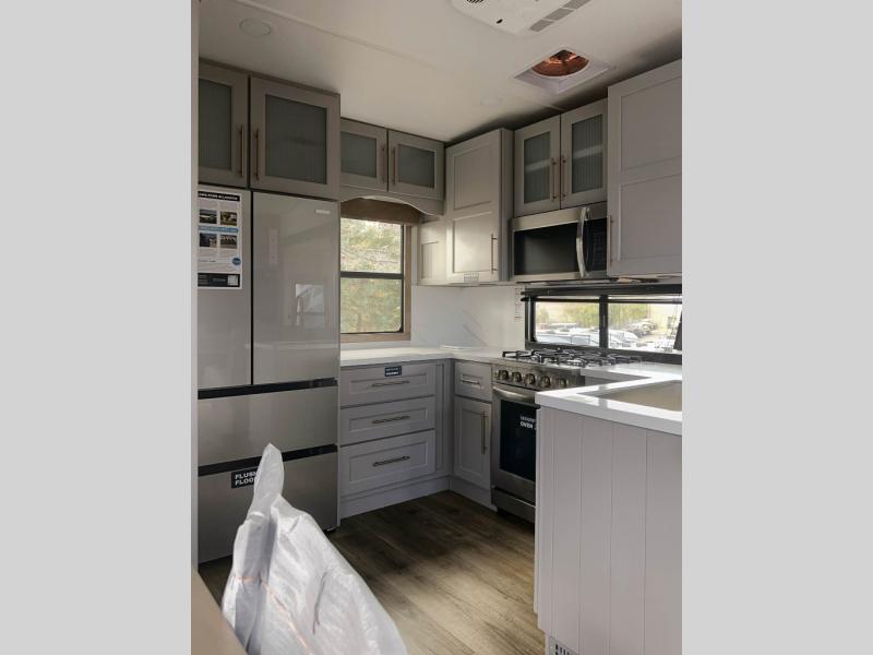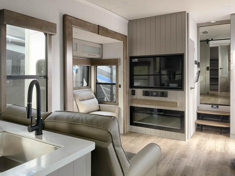 You won't want to camp any other way once you step inside this fifth wheel! the chef will enjoy all of the space in the rear kitchen with ample counter space, a 19 cu. ft. 12 volt residential refrigerator, and a pantry for snacks. Everyone will love to meet in the middle living area that includes dual sleeper sofas and a dual recliner loveseat across from the 50" Smart TV and fireplace. The half bathroom is nearby for quick bathroom breaks too. You will feel right at home in the master suite with a king bed slide to lay your head on at night, a flip top dresser with a Smart TV above it to watch your movies in true comfort, and a seat with storage, plus access to the front full bathroom. Inside the bathroom, you will find a 61" x 30" shower to freshen up in and a walk-in closet with a hamper, shelves, and washer and dryer prep for clean clothes throughout your entire trip!