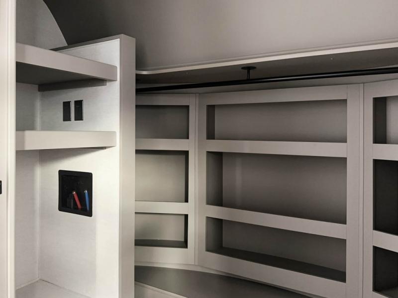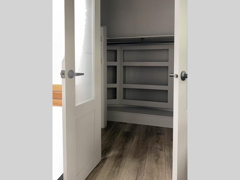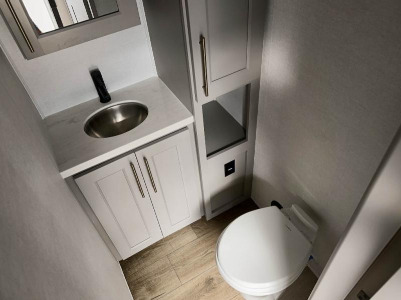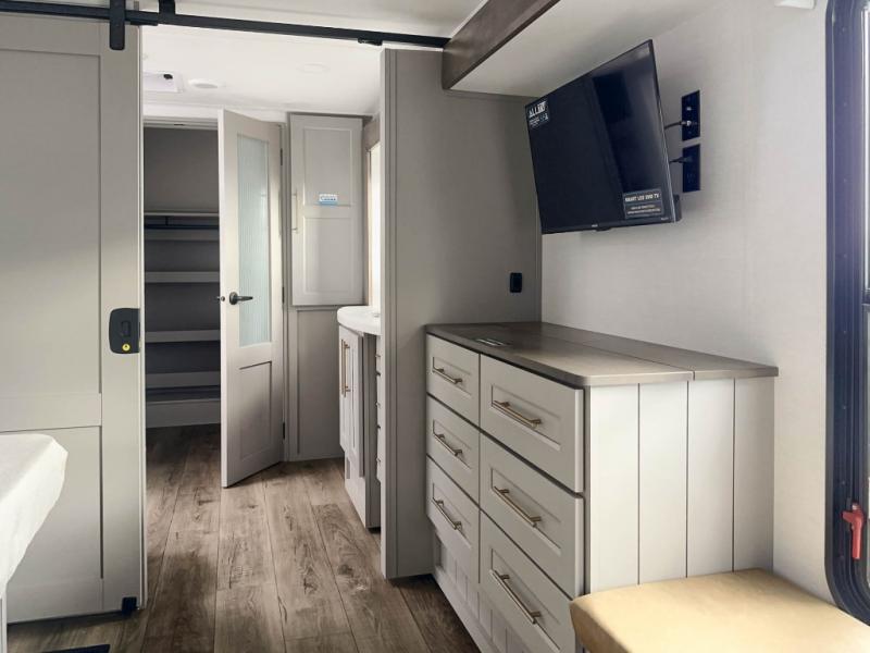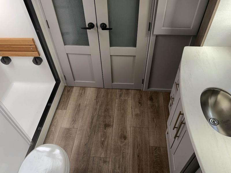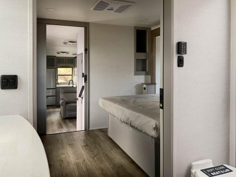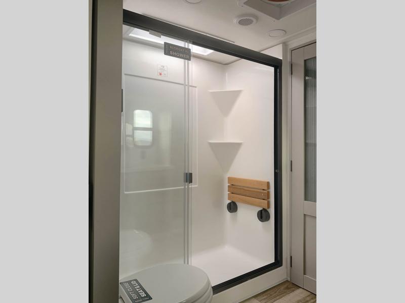 You won't want to camp any other way once you step inside this fifth wheel! the chef will enjoy all of the space in the rear kitchen with ample counter space, a 19 cu. ft. 12 volt residential refrigerator, and a pantry for snacks. Everyone will love to meet in the middle living area that includes dual sleeper sofas and a dual recliner loveseat across from the 50" Smart TV and fireplace. The half bathroom is nearby for quick bathroom breaks too. You will feel right at home in the master suite with a king bed slide to lay your head on at night, a flip top dresser with a Smart TV above it to watch your movies in true comfort, and a seat with storage, plus access to the front full bathroom. Inside the bathroom, you will find a 61" x 30" shower to freshen up in and a walk-in closet with a hamper, shelves, and washer and dryer prep for clean clothes throughout your entire trip!