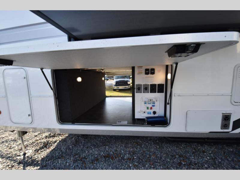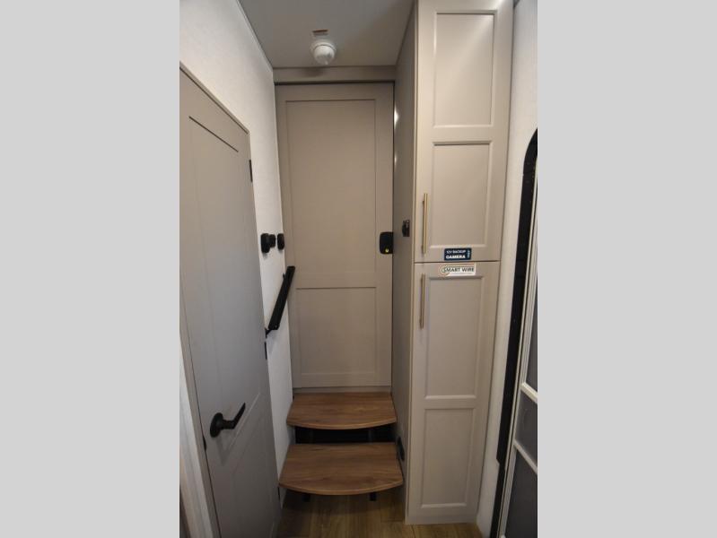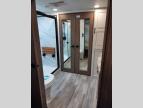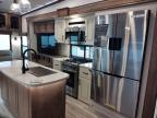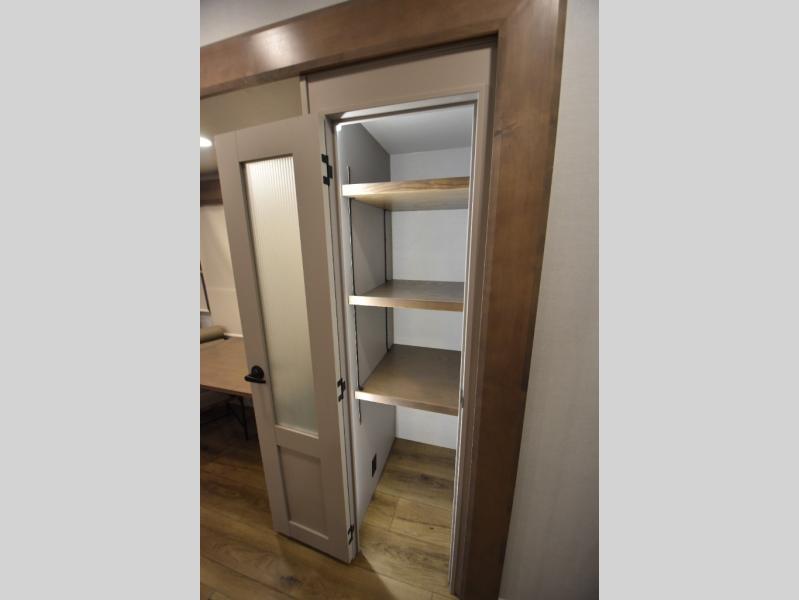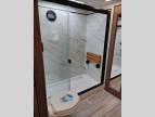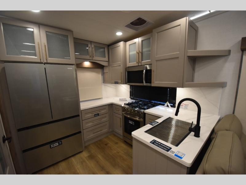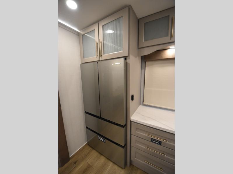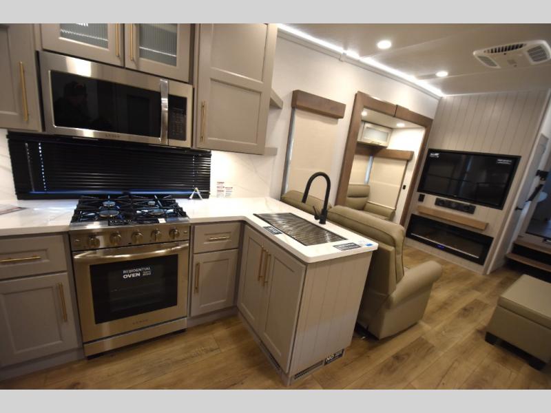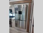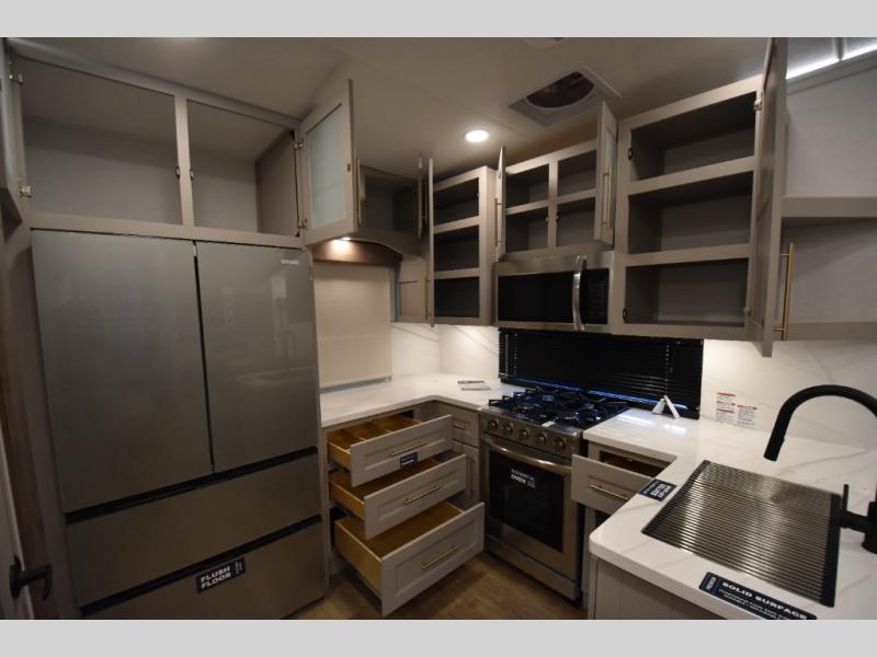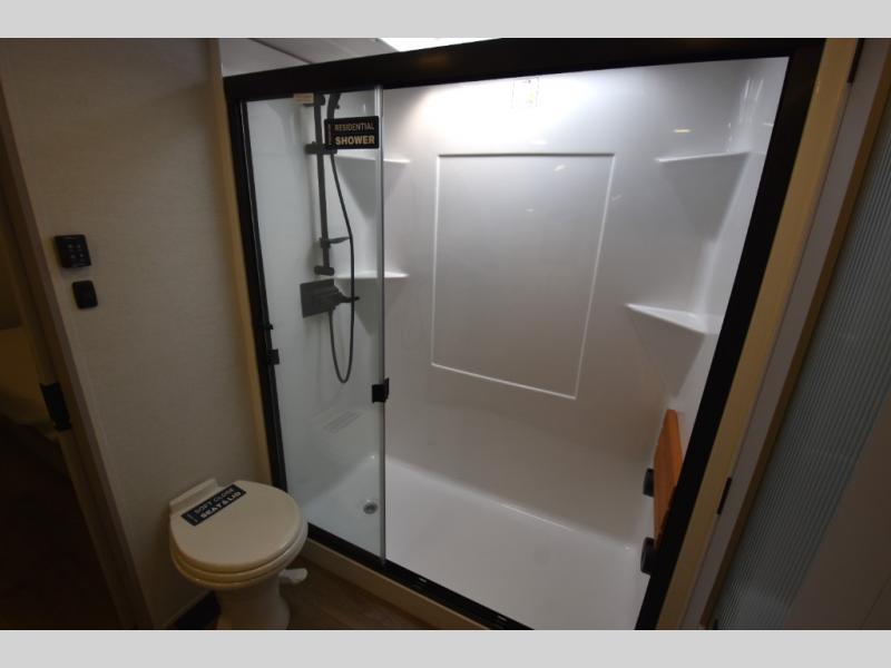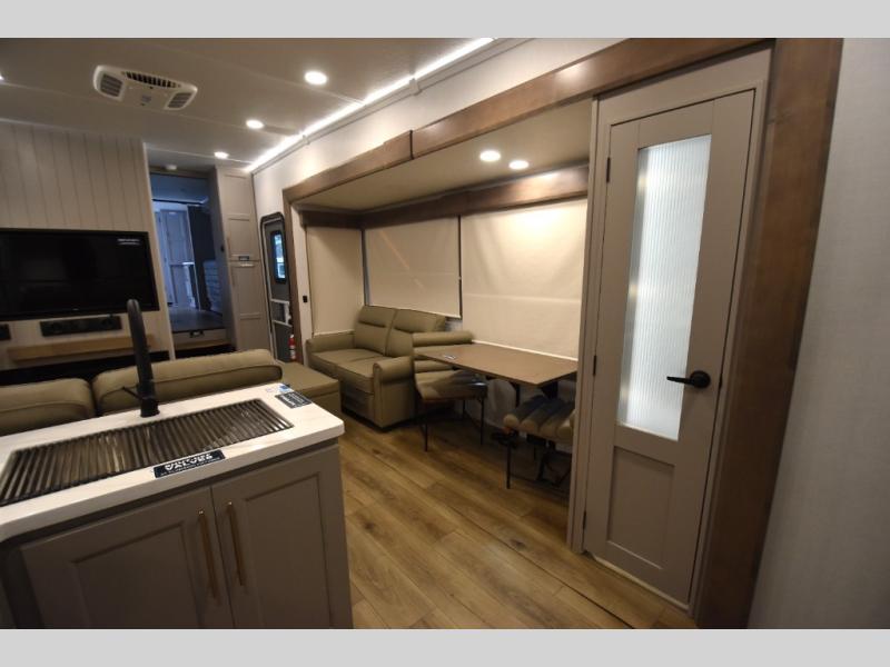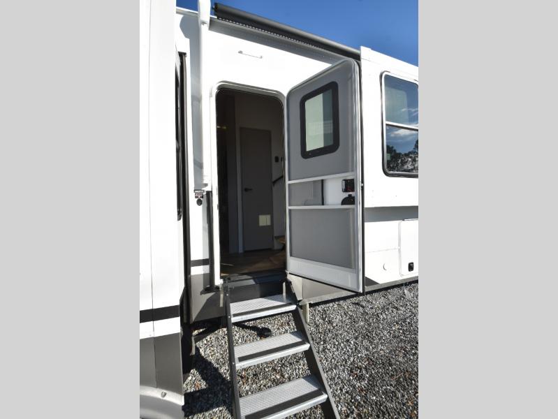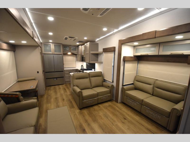 You won't want to camp any other way once you step inside this fifth wheel! the chef will enjoy all of the space in the rear kitchen with ample counter space, a 19 cu. ft. 12 volt residential refrigerator, and a pantry for snacks. Everyone will love to meet in the middle living area that includes dual sleeper sofas and a dual recliner loveseat across from the 50" Smart TV and fireplace. The half bathroom is nearby for quick bathroom breaks too. You will feel right at home in the master suite with a king bed slide to lay your head on at night, a flip top dresser with a Smart TV above it to watch your movies in true comfort, and a seat with storage, plus access to the front full bathroom. Inside the bathroom, you will find a 61" x 30" shower to freshen up in and a walk-in closet with a hamper, shelves, and washer and dryer prep for clean clothes throughout your entire trip!