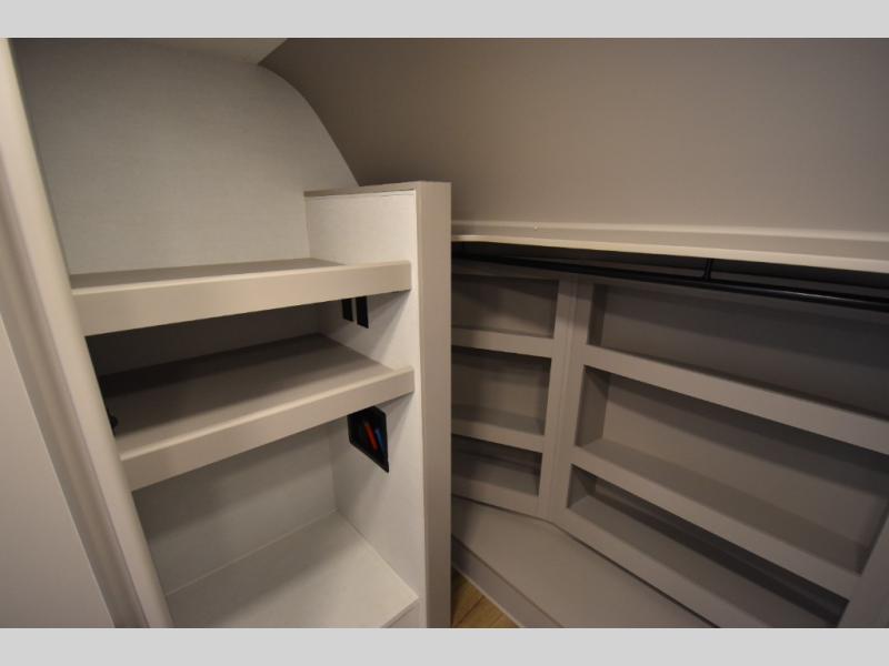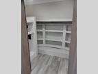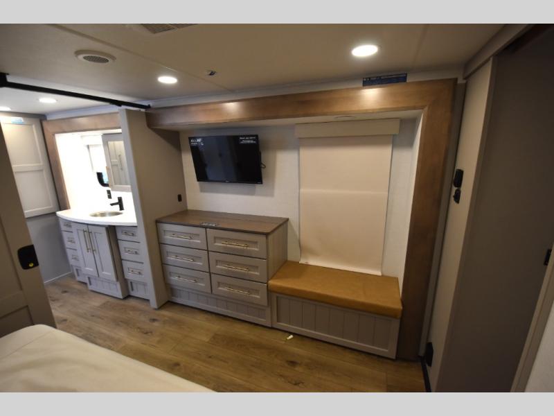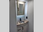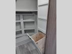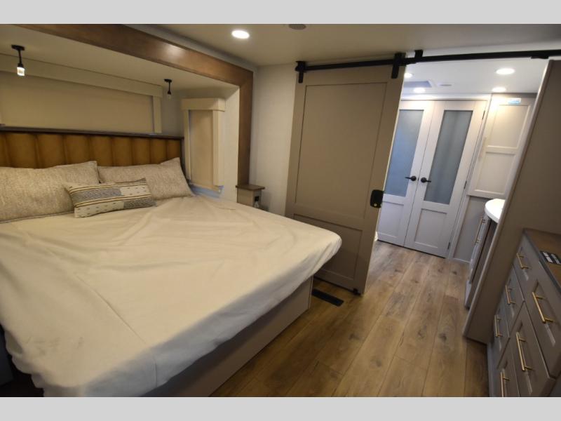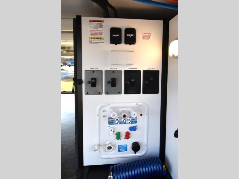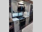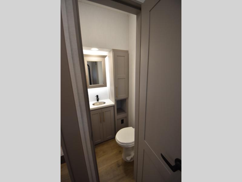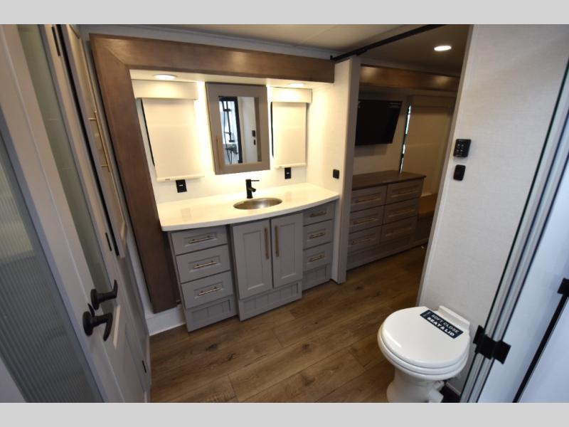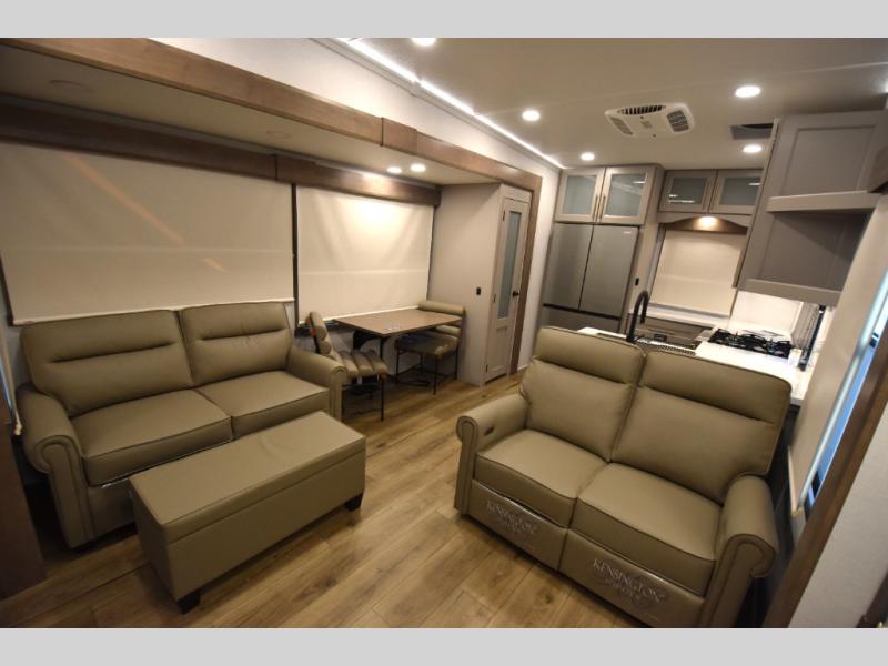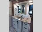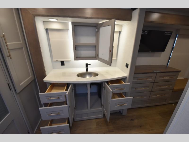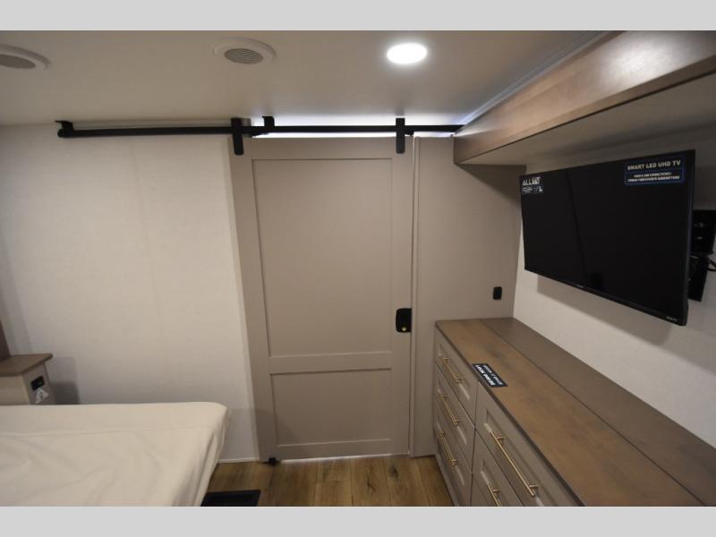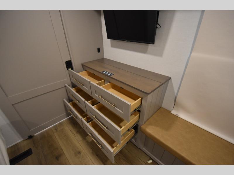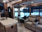You won't want to camp any other way once you step inside this fifth wheel! the chef will enjoy all of the space in the rear kitchen with ample counter space, a 19 cu. ft. 12 volt residential refrigerator, and a pantry for snacks. Everyone will love to meet in the middle living area that includes dual sleeper sofas and a dual recliner loveseat across from the 50" Smart TV and fireplace. The half bathroom is nearby for quick bathroom breaks too. You will feel right at home in the master suite with a king bed slide to lay your head on at night, a flip top dresser with a Smart TV above it to watch your movies in true comfort, and a seat with storage, plus access to the front full bathroom. Inside the bathroom, you will find a 61" x 30" shower to freshen up in and a walk-in closet with a hamper, shelves, and washer and dryer prep for clean clothes throughout your entire trip!
