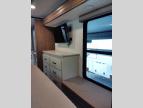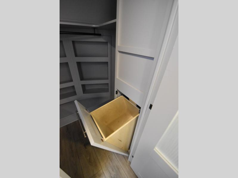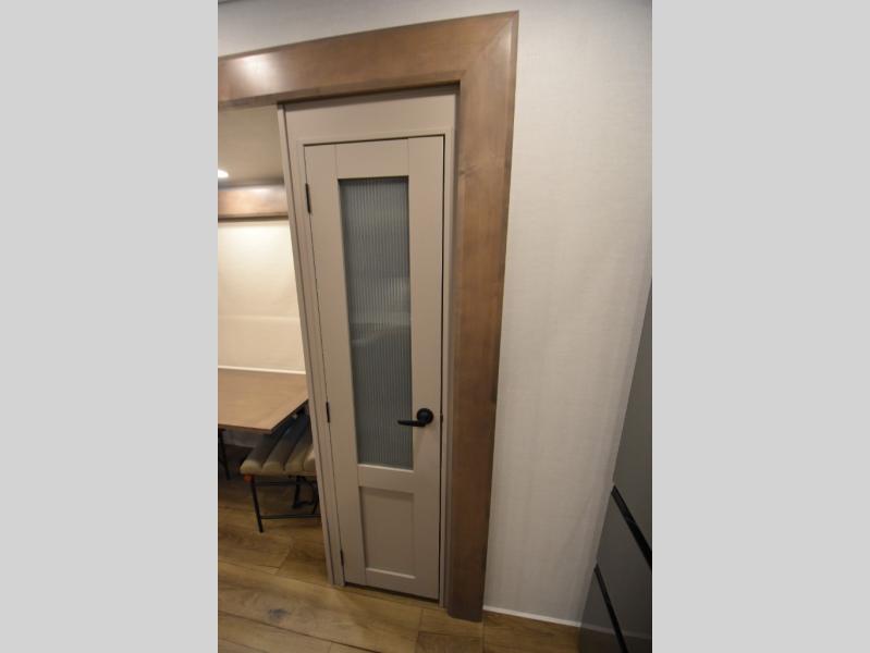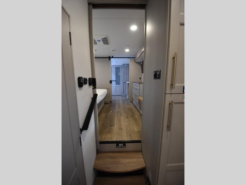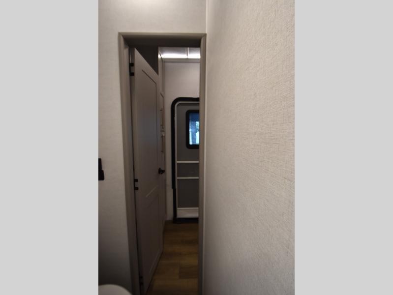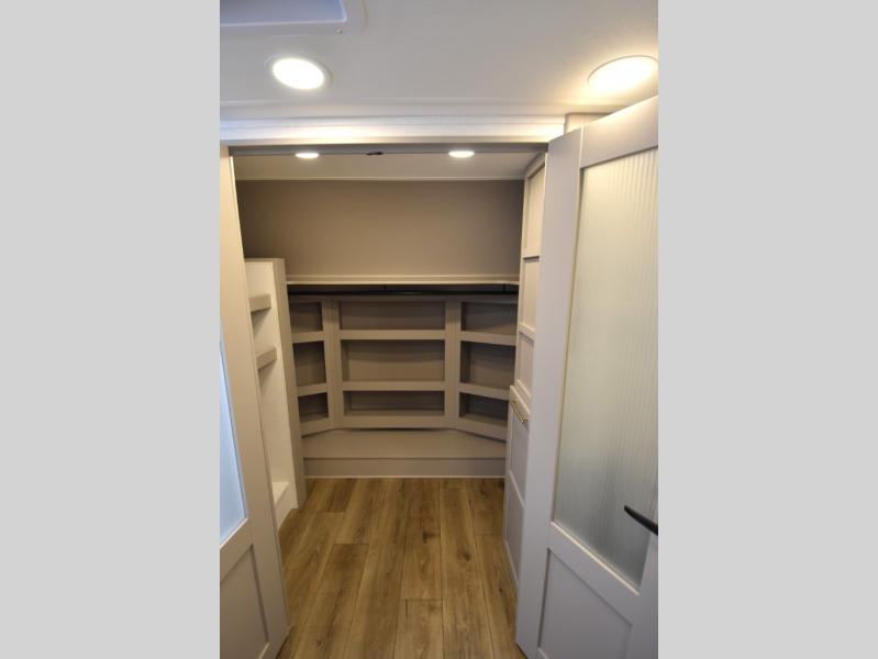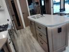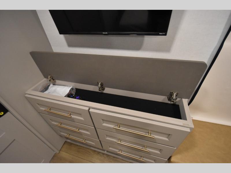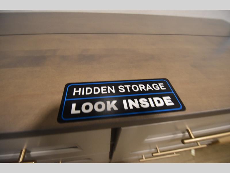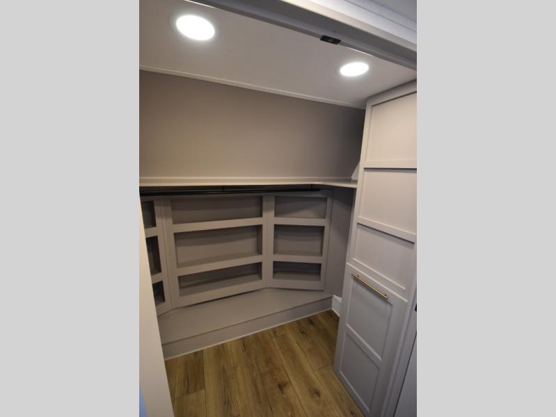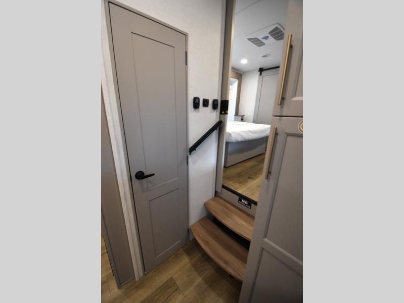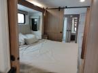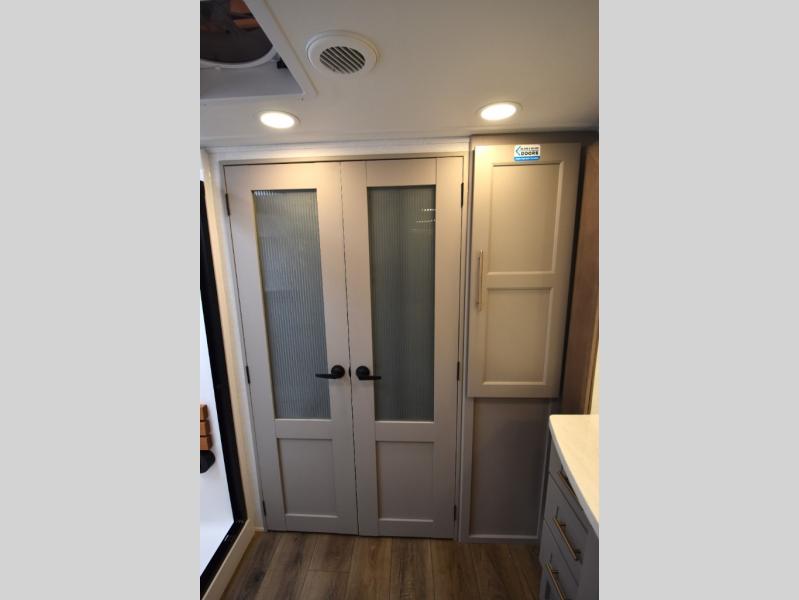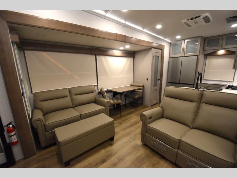 You won't want to camp any other way once you step inside this fifth wheel! the chef will enjoy all of the space in the rear kitchen with ample counter space, a 19 cu. ft. 12 volt residential refrigerator, and a pantry for snacks. Everyone will love to meet in the middle living area that includes dual sleeper sofas and a dual recliner loveseat across from the 50" Smart TV and fireplace. The half bathroom is nearby for quick bathroom breaks too. You will feel right at home in the master suite with a king bed slide to lay your head on at night, a flip top dresser with a Smart TV above it to watch your movies in true comfort, and a seat with storage, plus access to the front full bathroom. Inside the bathroom, you will find a 61" x 30" shower to freshen up in and a walk-in closet with a hamper, shelves, and washer and dryer prep for clean clothes throughout your entire trip!